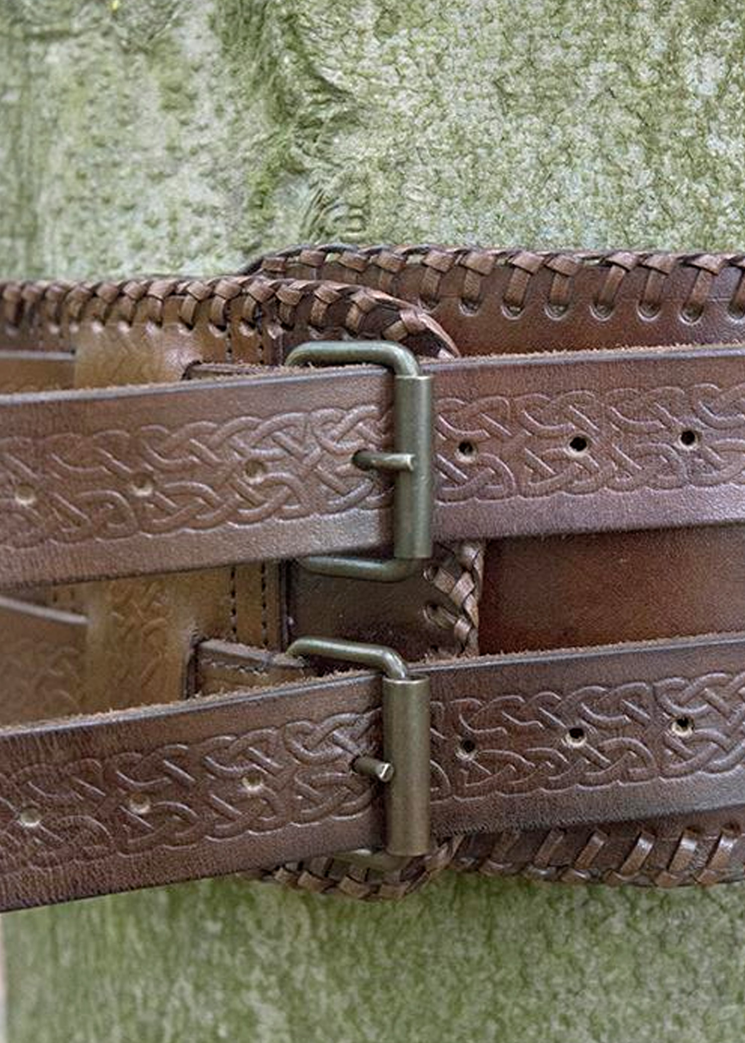 Der Gurt besteht aus zwei einzelnen, kleineren Gürtel, die durch einen breiteren Riemen gezogen wurden, und schließt mit zwei rechteckigen Dornschnallen aus Messing. Dieses besondere, robuste Design sorgt nicht nur für festen Sitz, sondern bietet auch Platz für allerhand Waffenhalterungen, Taschen, usw.