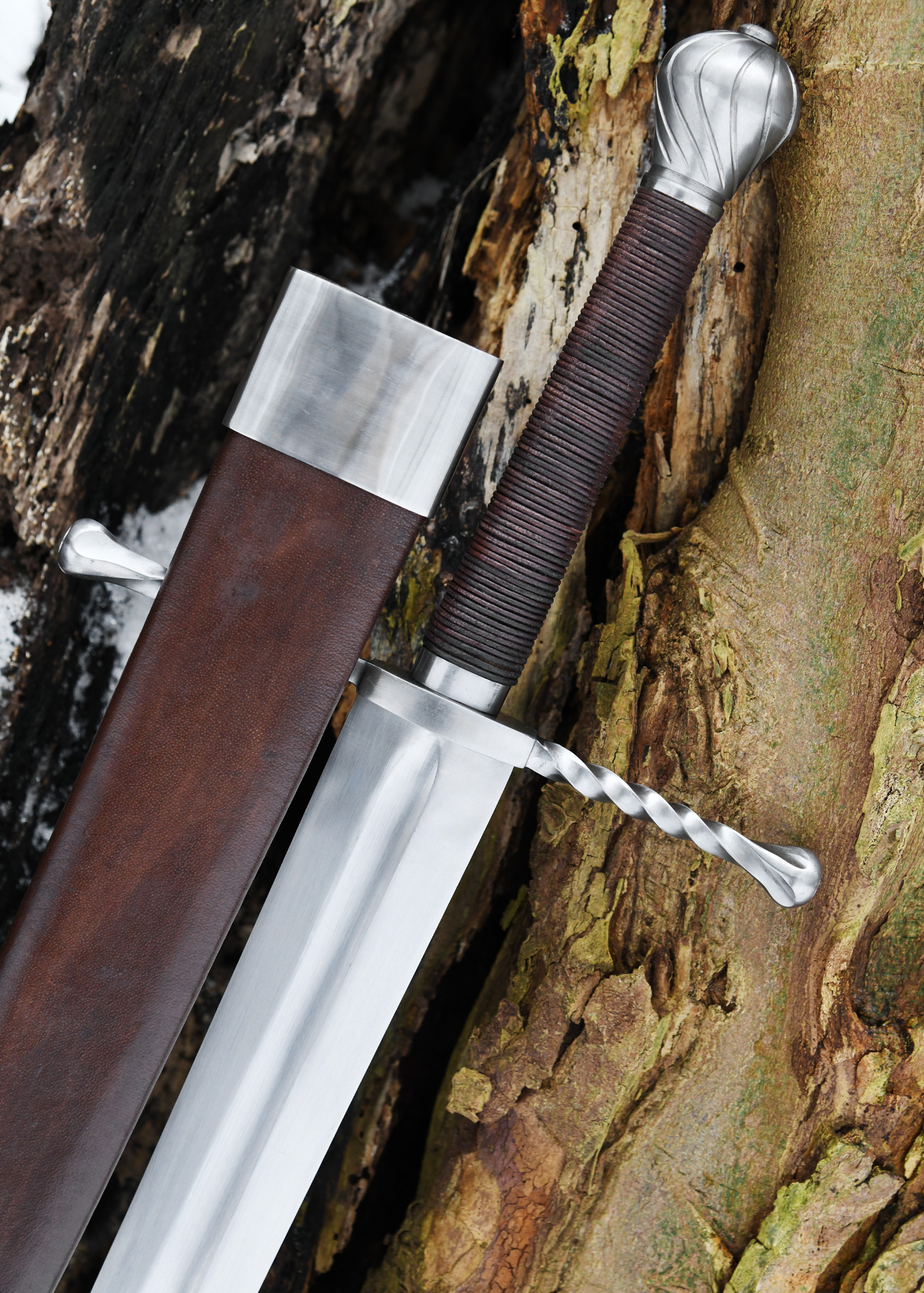 Das Schwert kommt mit einer lederbezogenen Holzscheide, die mit einfachen Mund- und Ortblechen versehen ist.