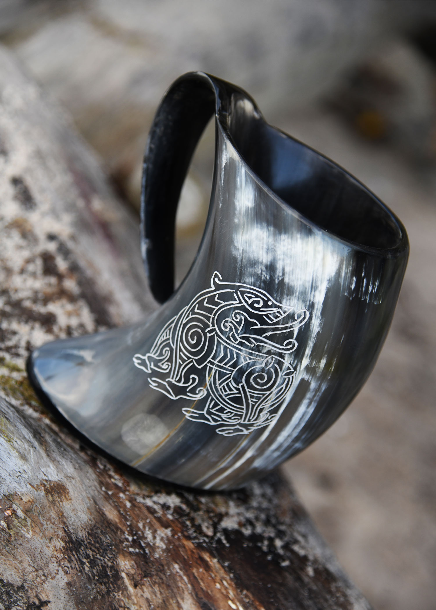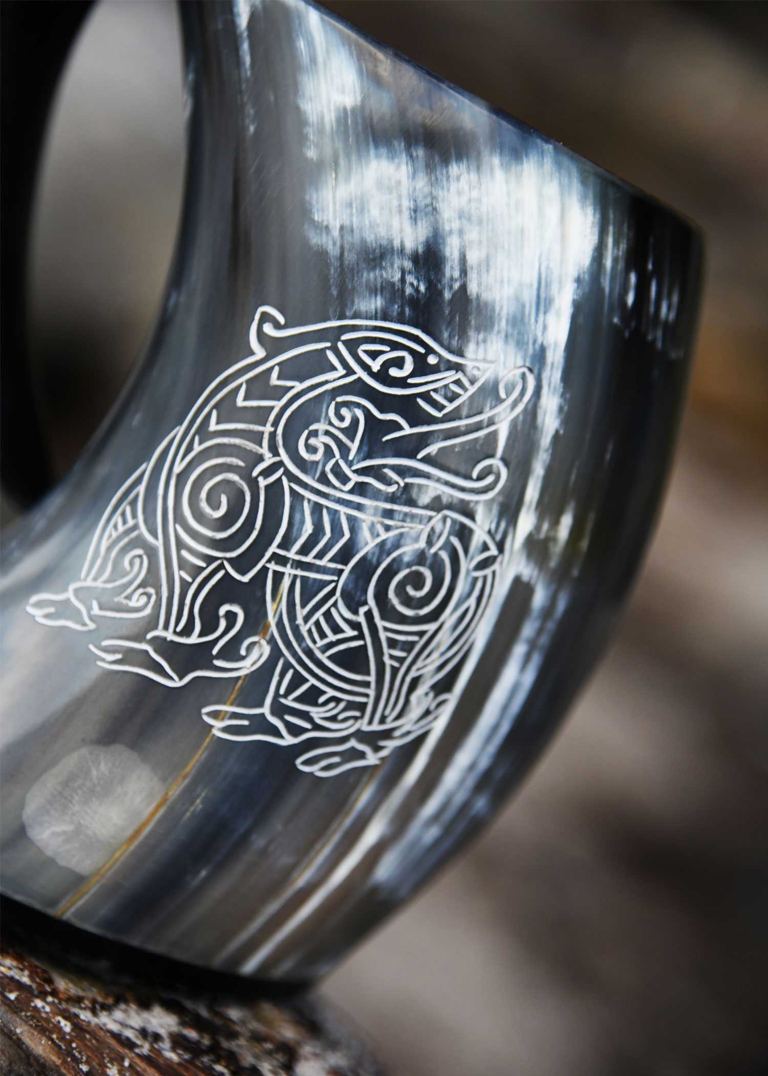 Dieser großzügig bemessene Henkelbecher / Humpen wird aus Rinderhorn in Handarbeit gefertigt, poliert, und mit einem eingravierten Drachen, einem beliebten Motiv der Wikingerkunst, verziert.