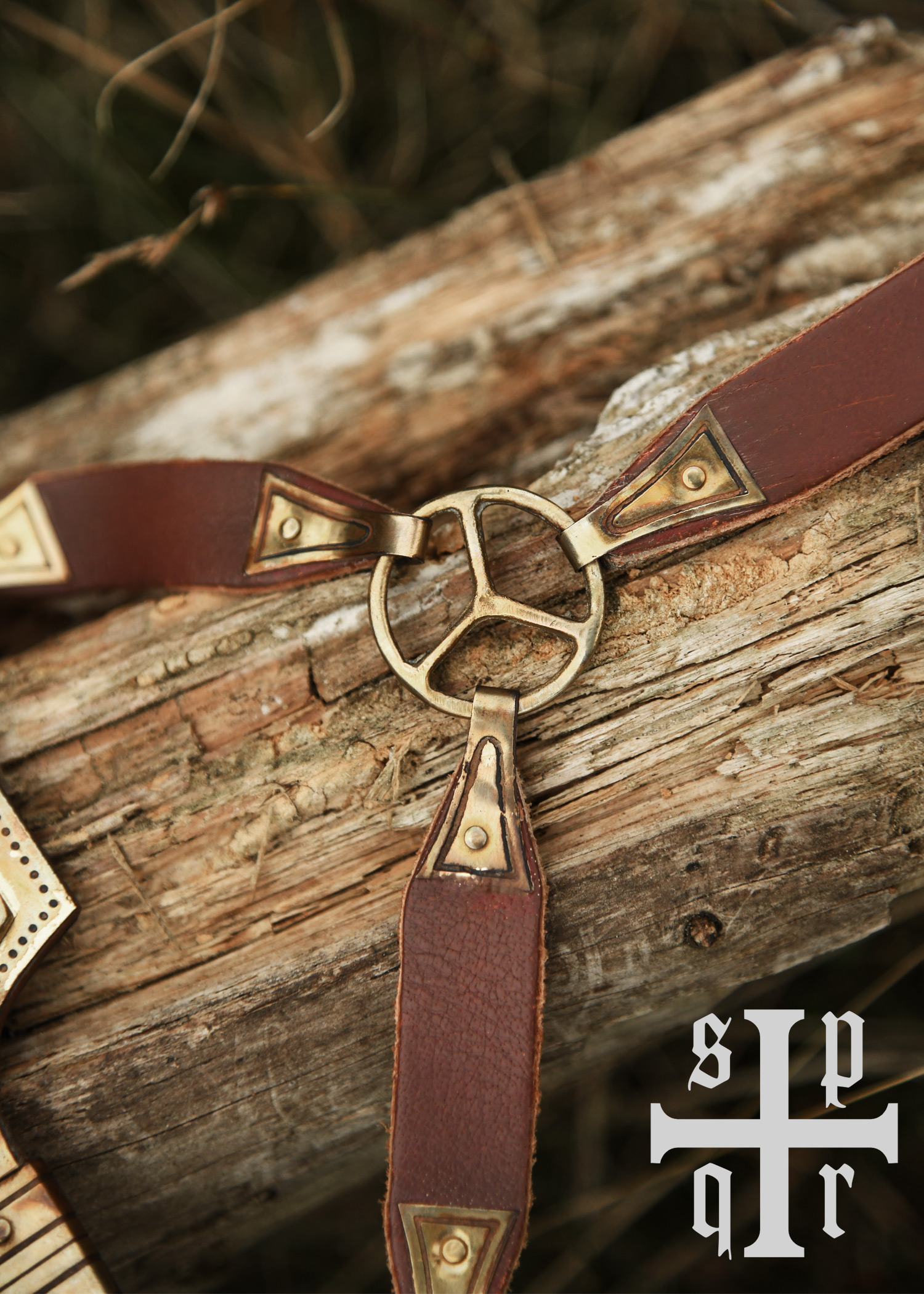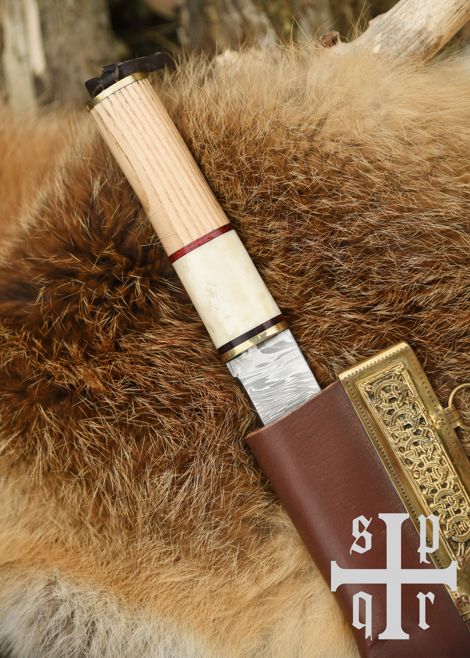 Der Kurzsax kommt samt wunderschöner Scheide aus vegetabil gegerbtem, von Hand gefärbtem Leder mit reich verzierten Messingbeschlägen. Das Tragesystem besteht aus zwei Tragringen, einem Riemenverteiler und drei Lederriemen. In der Wikingerzeit waren Tragesysteme dieser Art weit verbreitet. Der Riemenverteiler diente dazu, die einzelnen Riemen so zu verteilen, dass das , bzw. das Saxmesser für ein schnelles Herausziehen aus der Scheide in einem optimalen Winkel am getragen werden konnte.
