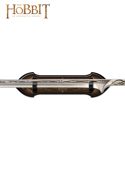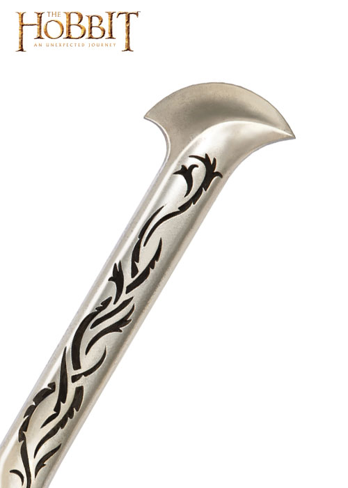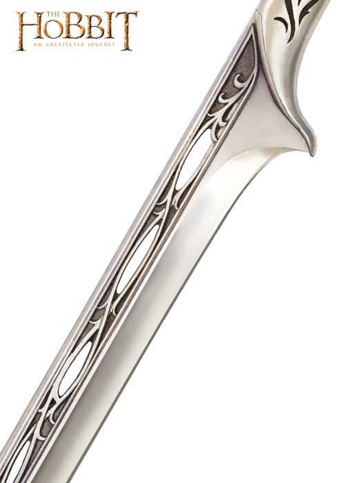 Das Schwert des Elbenkönigs Thranduil, Vater von Legolas Grünblatt, war eines von den zwei Zwillingsschwertern, die für ihn von den besten Schmieden des Waldland-Reiches gefertigt wurden. Die Klinge und der elegante Griff wurden aus einem einzigen Stück elbischen Stahls geschmiedet und mit eingravierten Ranken- und Blättermotiven verziert, die die Wälder vom Großen Grünwald verkörpern.
