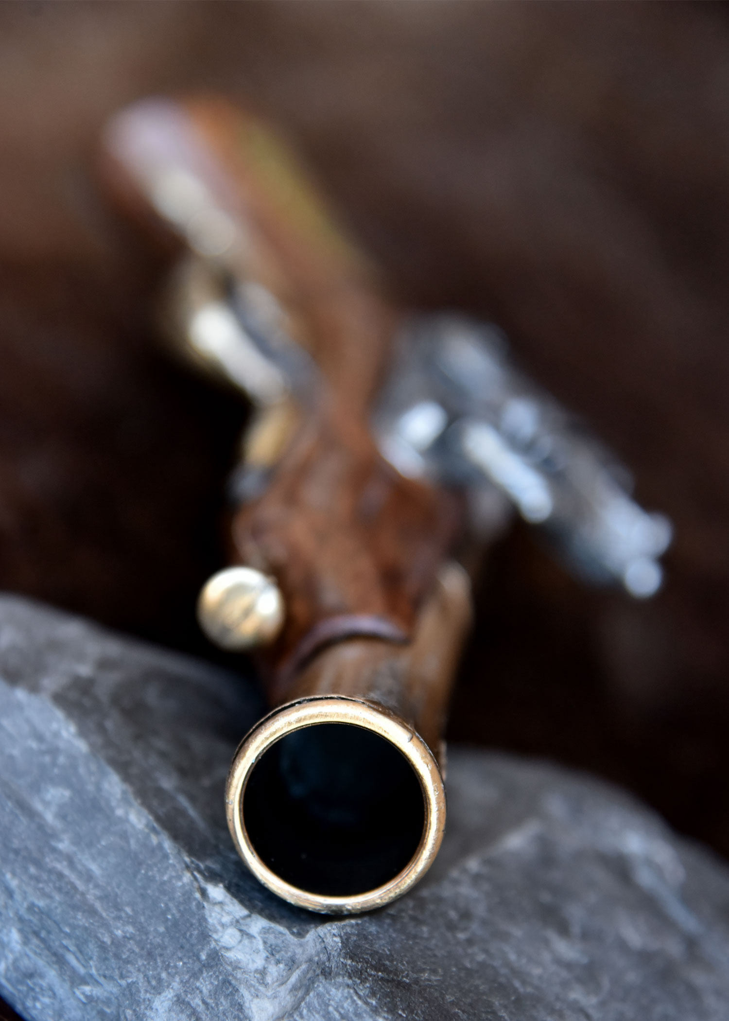 Der Schaft dieser eleganten Vorderlader-Replik ist aus Kunstharz (Holzimitat) mit Messing-Einlage. Mit Ausnahme vom kunstvoll ausgearbeiteten Schloss sind alle Metall-Elemente (Lauf, Ladestock und Abzugsbügel) in Messingoptik mit Antik-Finish gehalten.