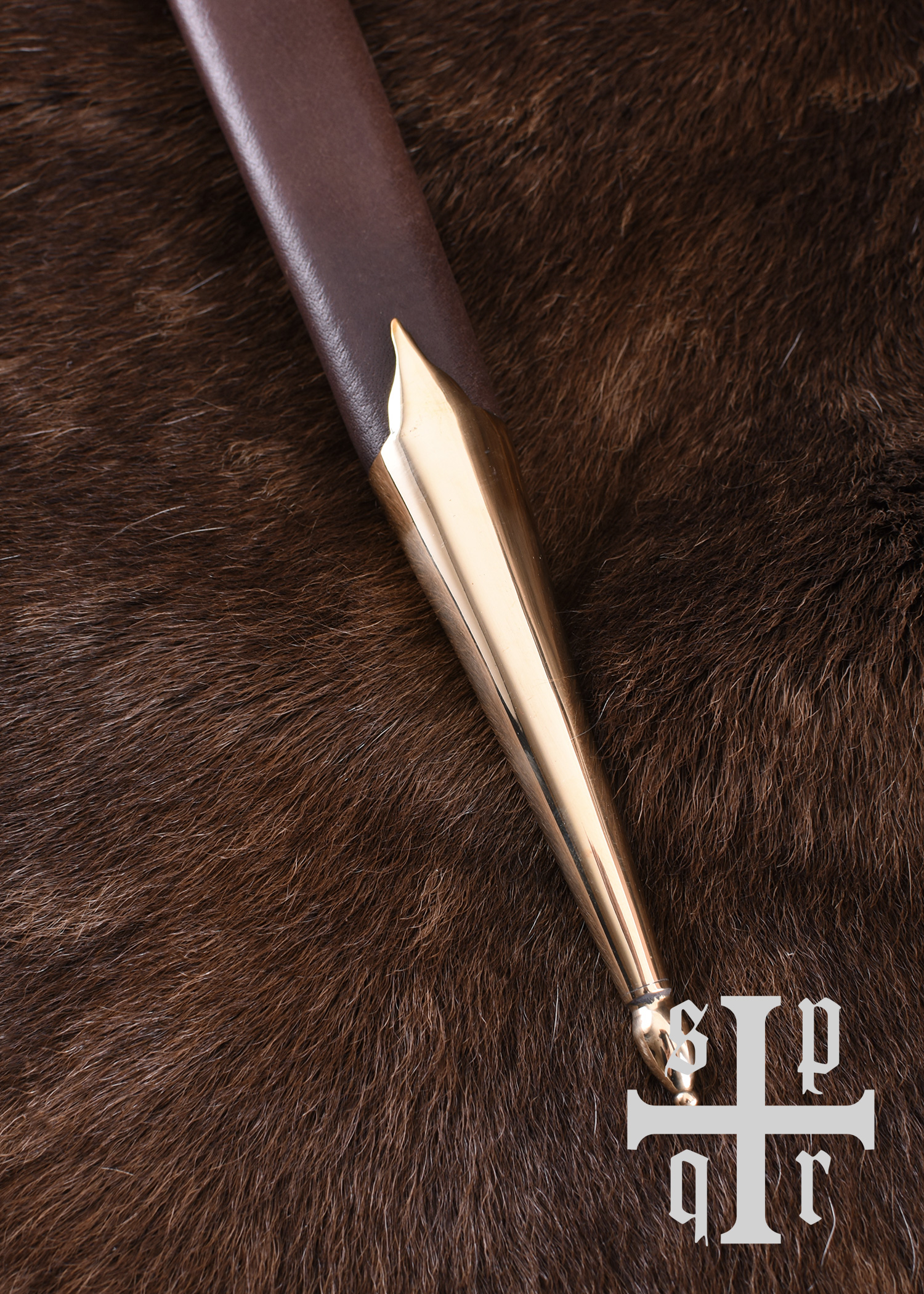 - Scheide aus vegetabil gegerbtem Leder mit Ortblech aus Messing und Gürtelschlaufe
