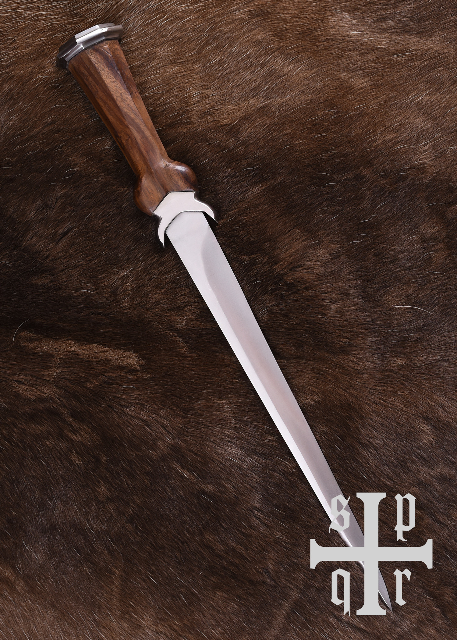 Diese Reproduktion besitzt eine einschneidige, ungeschärfte Stahlklinge, die sich vom Parier aus zu einer scharfen Spitze gleichmäßig verjüngt. Der oktagonale Griff wurde aus einem einzigen Stück Holz herausgearbeitet und der flache Stahlknauf ist mit einer dekorativen Messingplatte verziert.