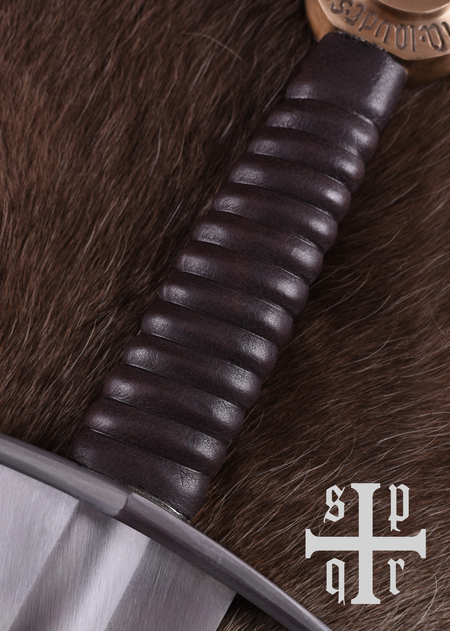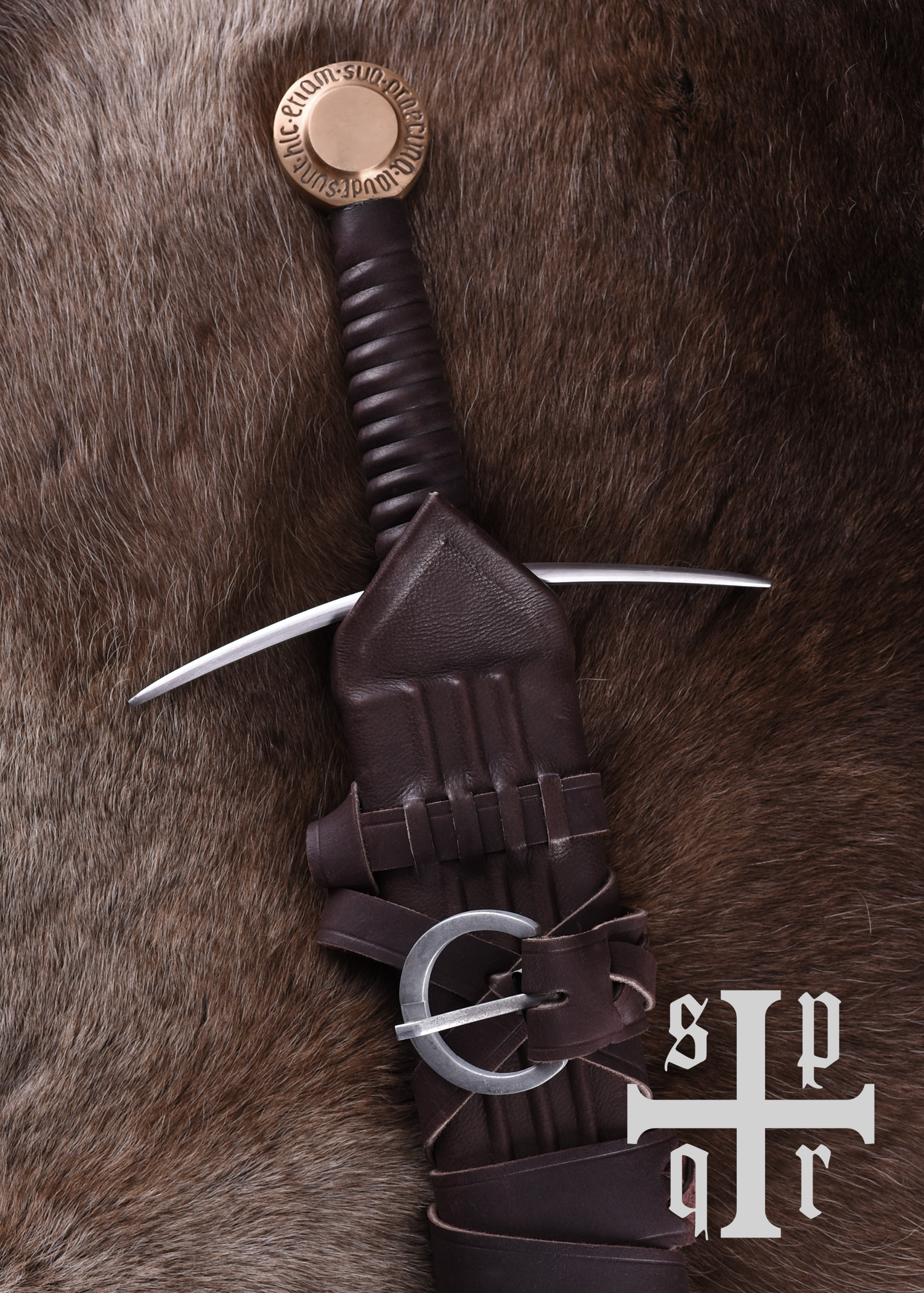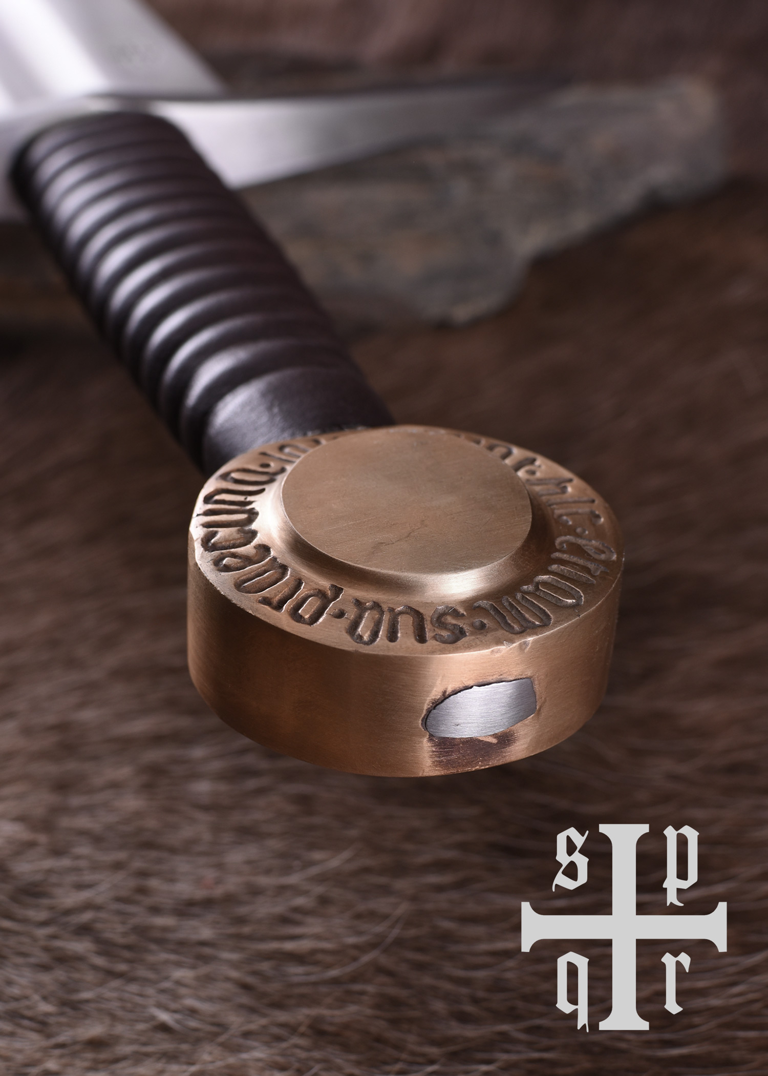 Diese Replik besitzt eine bis zum Knauf durchgeschmiedete Federstahlklinge, die gehärtet und auf ca. 48-50 HRC angelassen wurde. Die Parierstange aus Stahl hat abgebogene Enden und der mit Leder umwickelte Holzgriff schließt mit einem stabilen Scheibenknauf aus Kupfer ab. Der Knauf ist mit der lateinischen Inschrift Sunt hic etiam sua praecuna laudi verziert, einem Zitat aus Vergils Aeneis (Buch 1, Zeile 461), das sich in etwa mit Auch hier ist der Ruhm nicht ohne Belohnung oder Auch hier ist Lohn dem Verdienste übersetzen lässt. Die wunderschöne mit Holzkern ist mit Leder bezogen und wurde abschließend mit einem Tragegurt ausgestattet, der um die Scheide gewickelt ist.