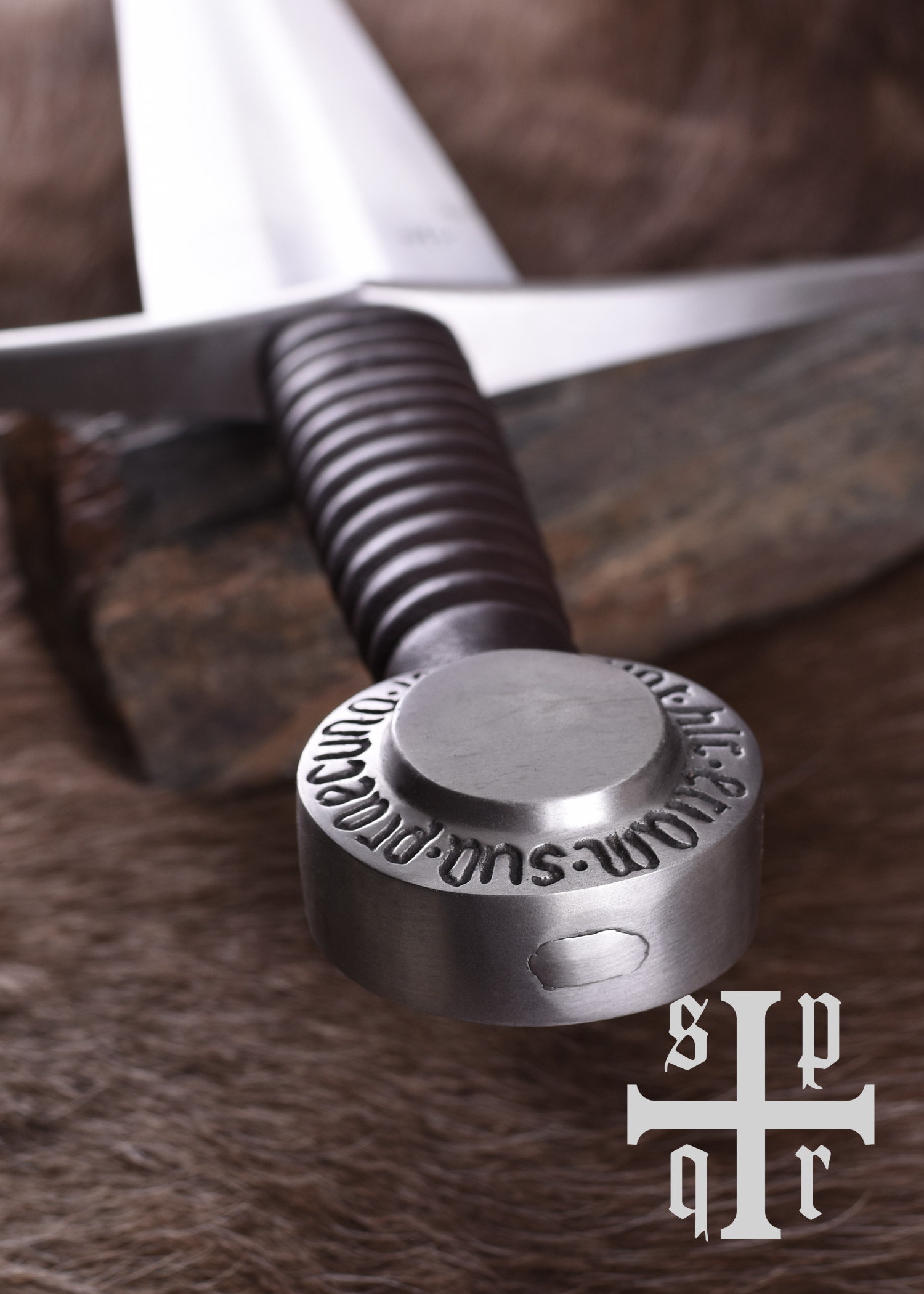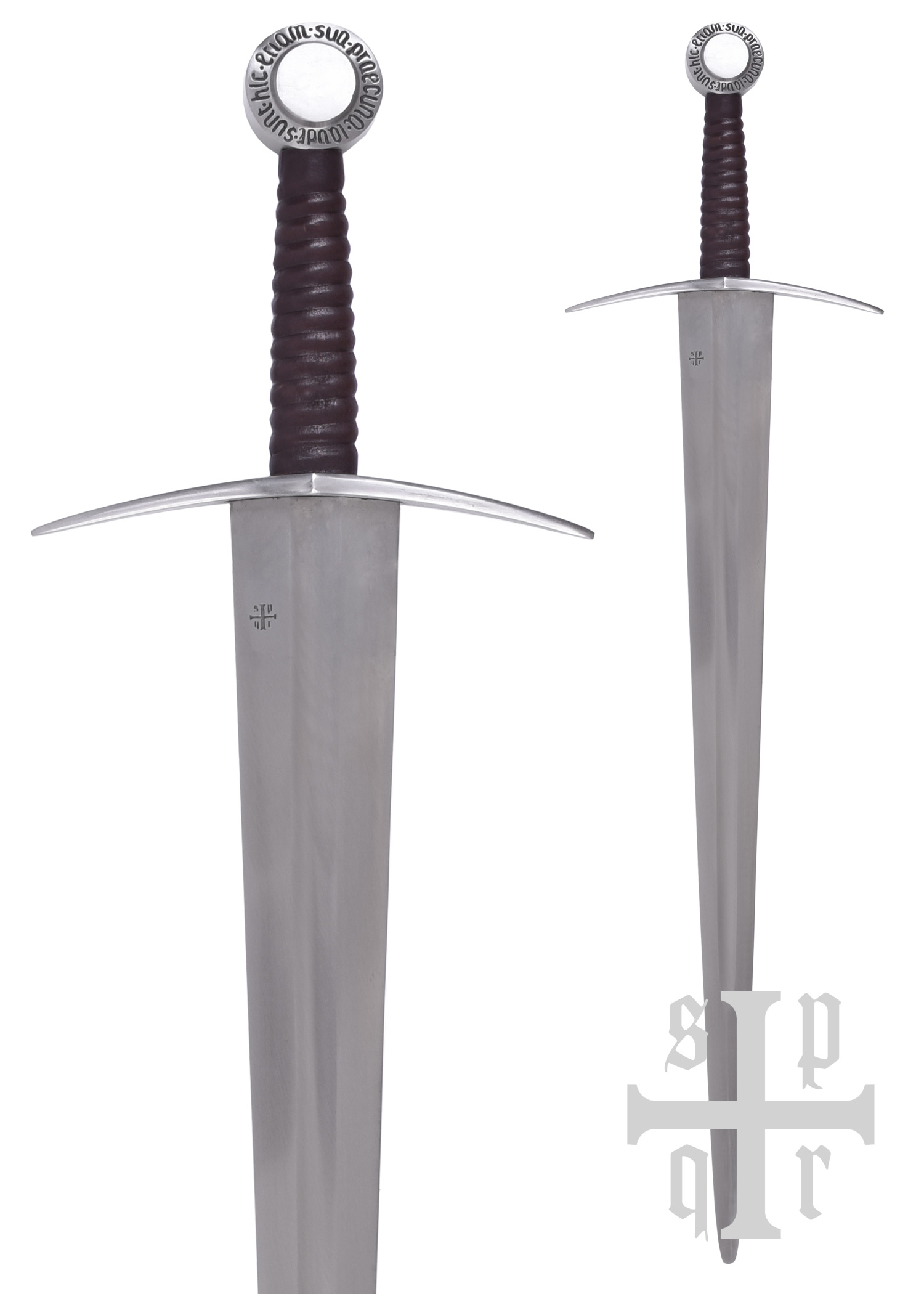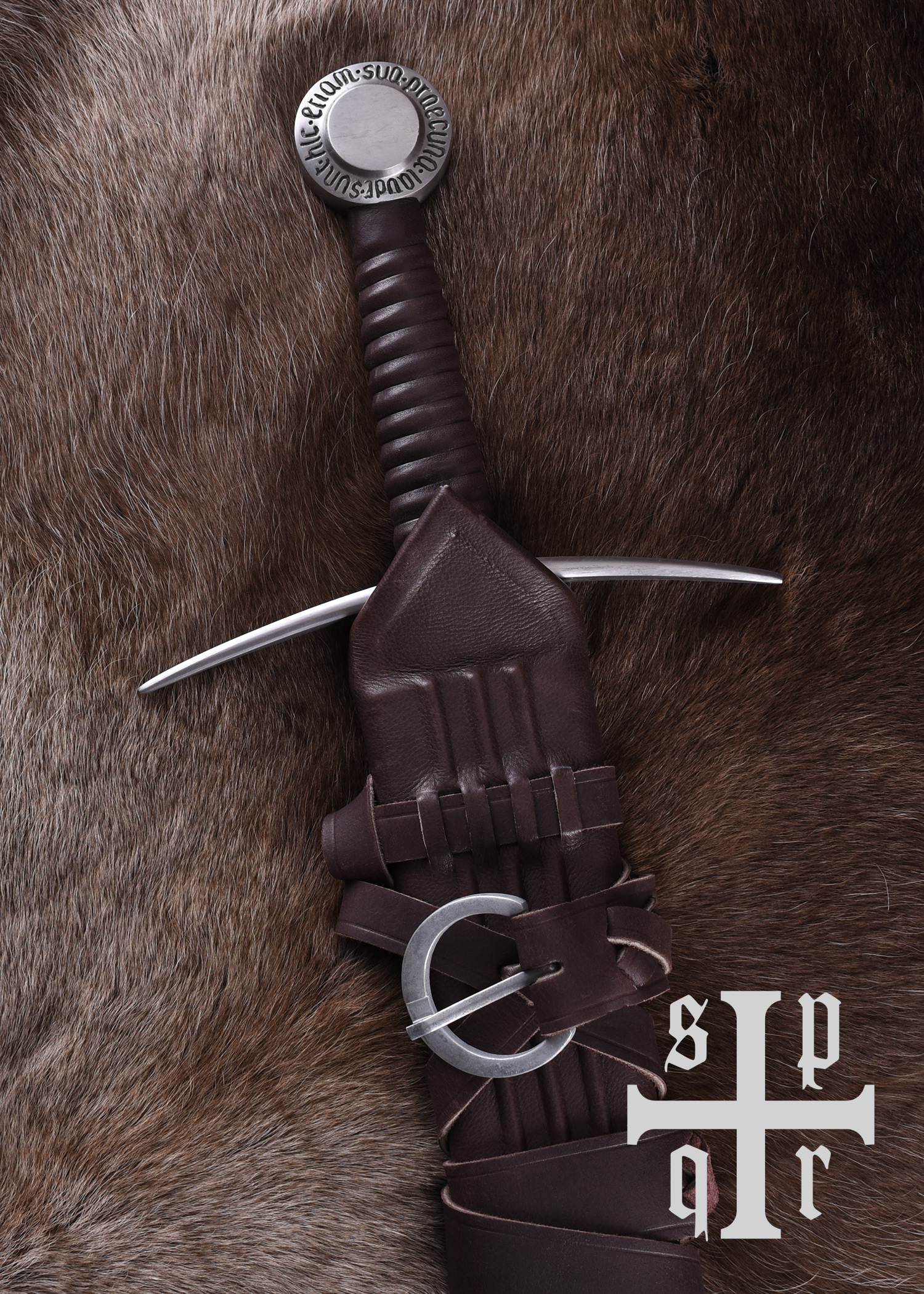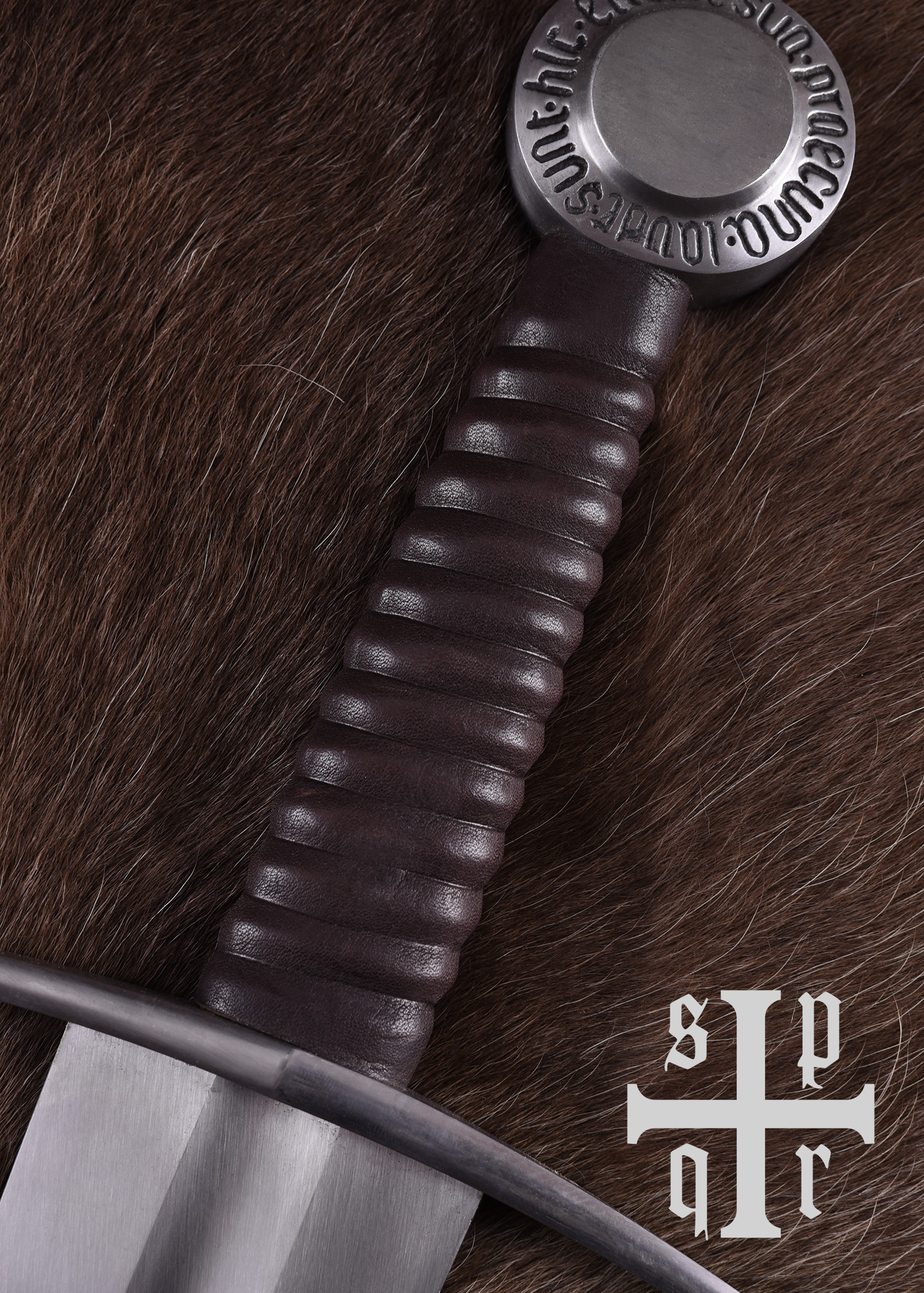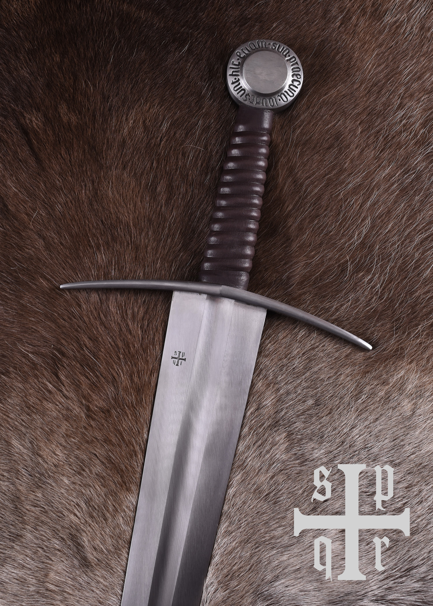 Diese Replik besitzt eine bis zum Knauf durchgeschmiedete Federstahlklinge, die gehärtet und auf ca. 48-50 HRC angelassen wurde. Die Parierstange aus Stahl hat abgebogene Enden und der mit Leder umwickelte Holzgriff schließt mit einem stabilen Scheibenknauf aus Stahl ab. Der Knauf ist mit der lateinischen Inschrift Sunt hic etiam sua praecuna laudi verziert, einem Zitat aus Vergils Aeneis (Buch 1, Zeile 461), das sich in etwa mit Auch hier ist der Ruhm nicht ohne Belohnung oder Auch hier ist Lohn dem Verdienste übersetzen lässt. Die wunderschöne mit Holzkern ist mit Leder bezogen und wurde abschließend mit einem Tragegurt ausgestattet, der um die Scheide gewickelt ist.
