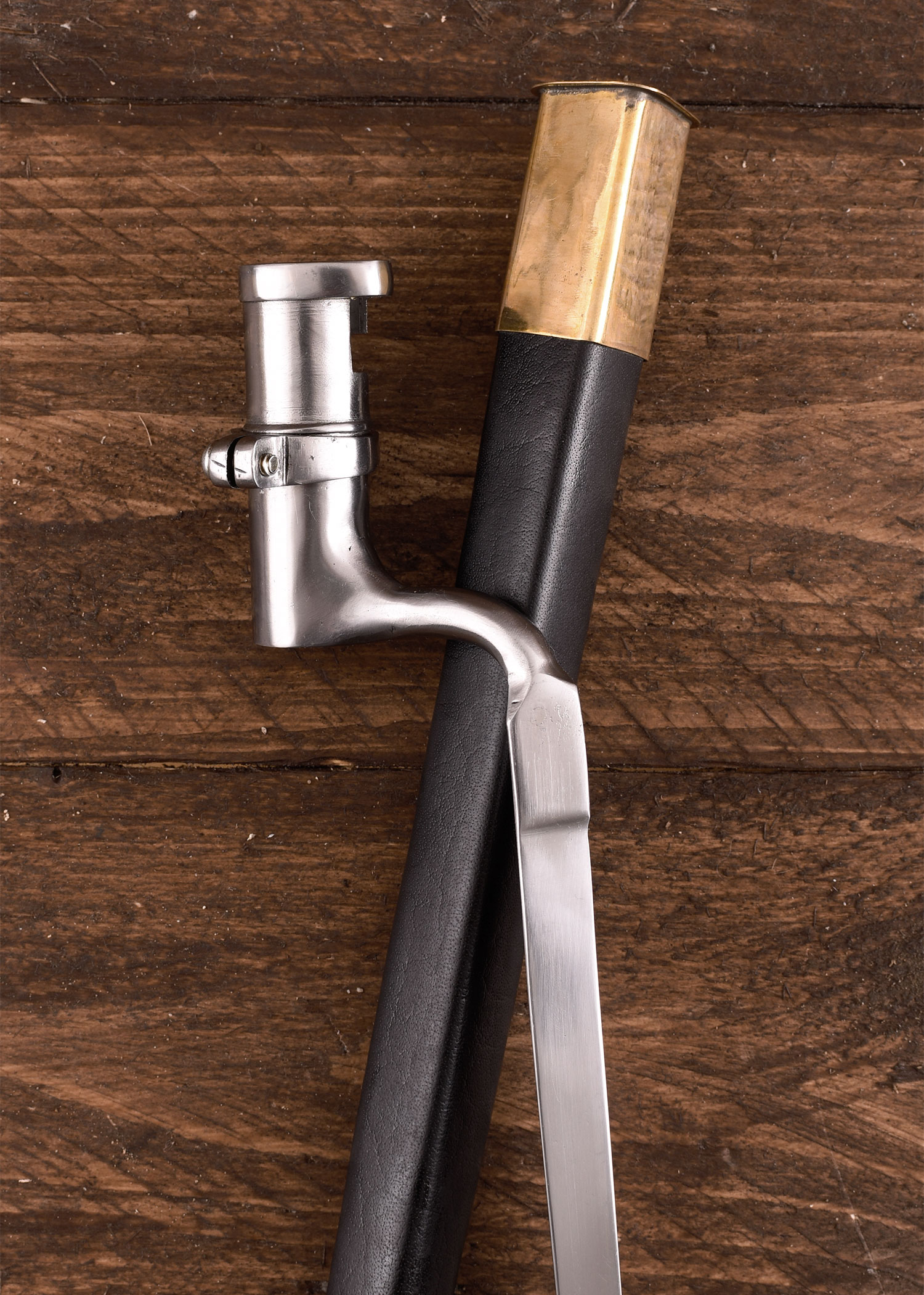 Diese authentische Nachbildung des Enfield-Bajonettes besteht aus Stahl. Die im Lieferumfang enthaltene Scheide ist aus Leder gefertigt und besitzt Beschläge aus Messing.