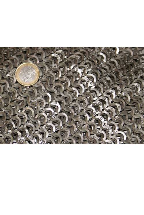 FRM Kettenrock, Flachring mit Rundnieten, ID 8mm, unbehandelt -schaukampftauglich- Europäisches Flachringgeflecht Dieses Kettengeflecht besteht aus flachen Kettenringen. Abwechselnd sind vernietete Ringe mit runden Nietköpfen sowie gestanzte Ringe in der Flechtart 4 in 1 miteinander verbunden. Wir kürzen diese sehr authentische Geflechtart FRM ab, nach engl. (=Flatring Round rivet-heads Mixed.) Der Kettenrock, auch Kettenschurz genannt war vorallem im Spätmittelalter beliebt, da in dieser Periode die Plattenrüstung dominierte und nur die freiligenden Partien und Übergänge mit Ringpanzern geschützt wurden. Unsere Kettenröcke eignen sich auch hervorragend als Ausgangsmaterial für eigene Projekte. Maße: Länge (Umfang): ca. 138 cm Breite: ca. 35,5 cm Innendurchmesser: ca. 8 mm Finish: unbehandelt (leicht eingeölt) Gewicht: ca. 2,9 kg Dies ist ein Produkt von ULFBERTH®.