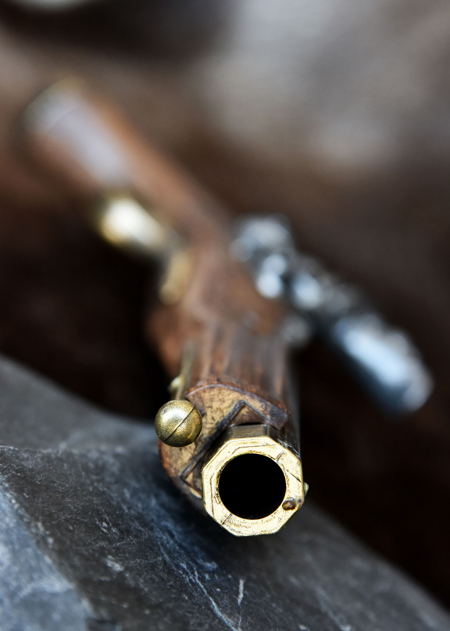 Der ausgefallene Schaft dieser schönen Vorderlader-Replik ist aus Kunstharz (Holzimitat). Mit Ausnahme vom kunstvoll ausgearbeiteten Schloss sind alle Metall-Elemente (Lauf, Ladestock, Abzugsbügel und Zierring am Griff) in Messingoptik mit Antik-Finish gehalten.