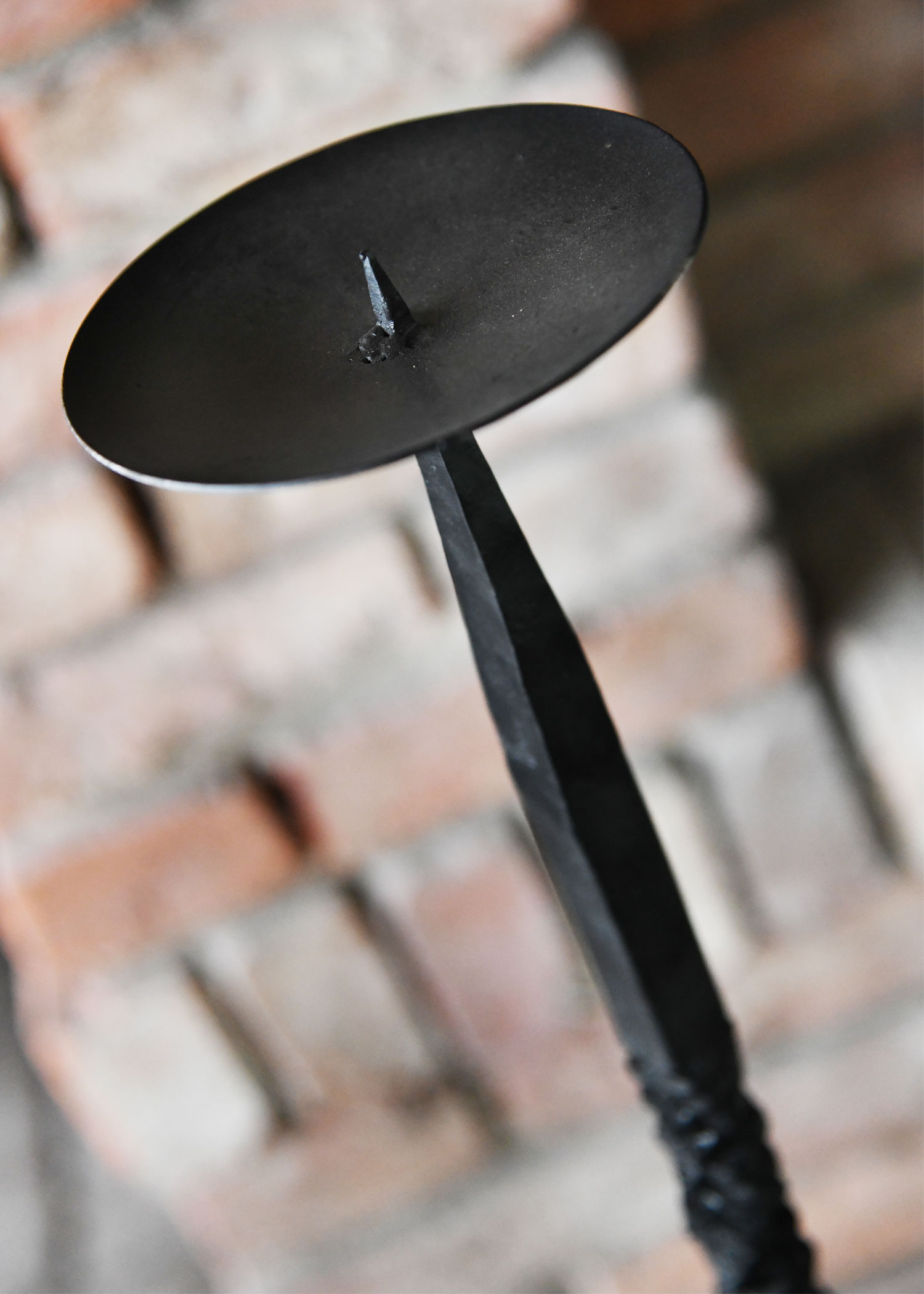 Dieser dekorative, handgeschmiedete Kerzenhalter sorgt für Gemütlichkeit.