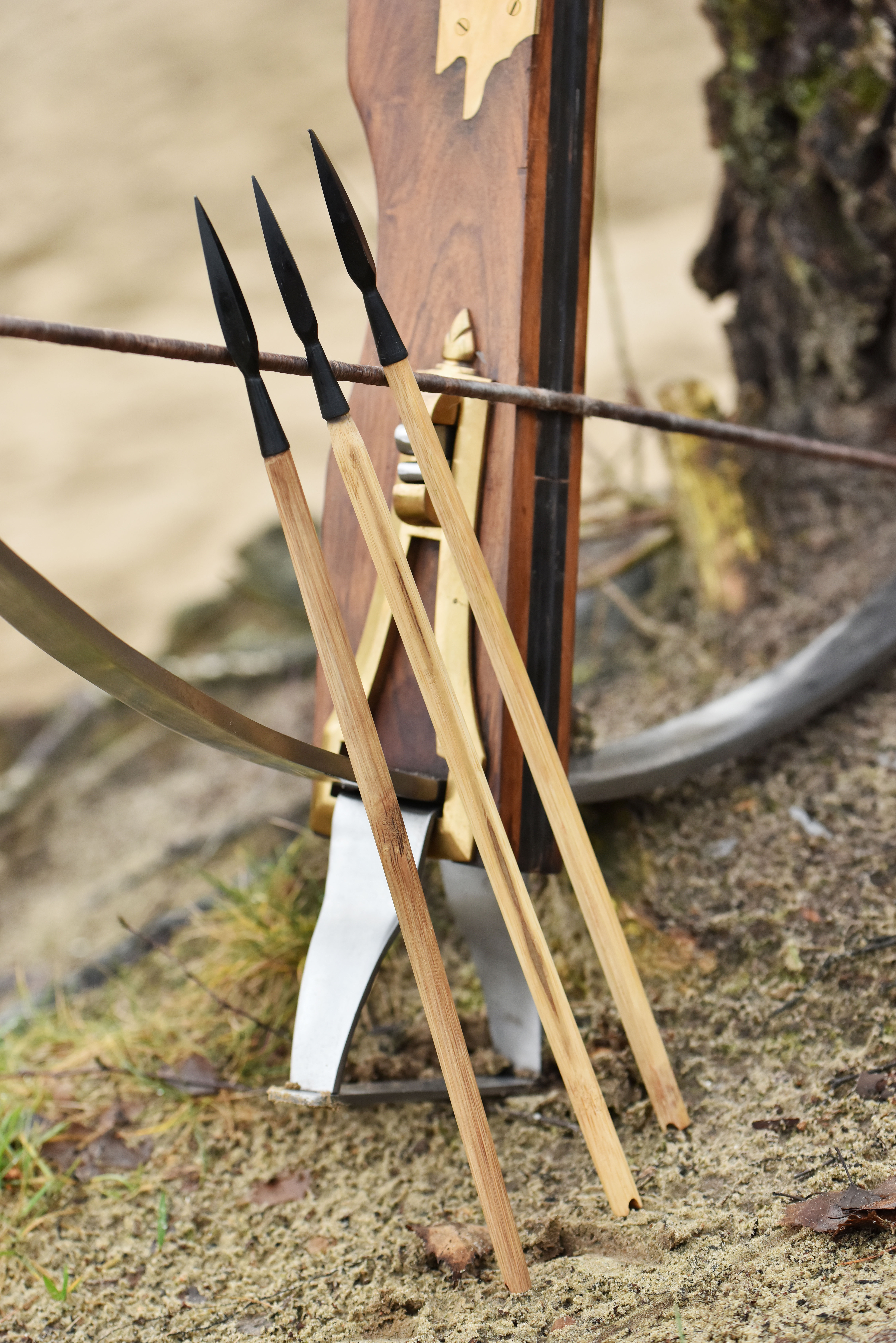 Die mittelalterliche Armbrust kommt komplett inklusive drei Bolzen aus Holz mit Bodkinspitze aus geschwärztem Stahl.