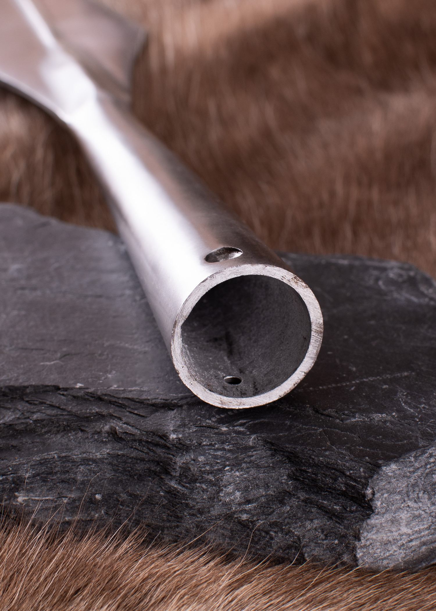 Der hier verwendete Stahl ist nicht rostfrei und kann eventuell leichte Korrosionsspuren aufweisen. Wir empfehlen, die Speerspitze regelmäßig zu pflegen, z.B. mit Ballistol, einem Universalöl, das sich zur Erhaltung von Stahlwaren hervorragend eignet.