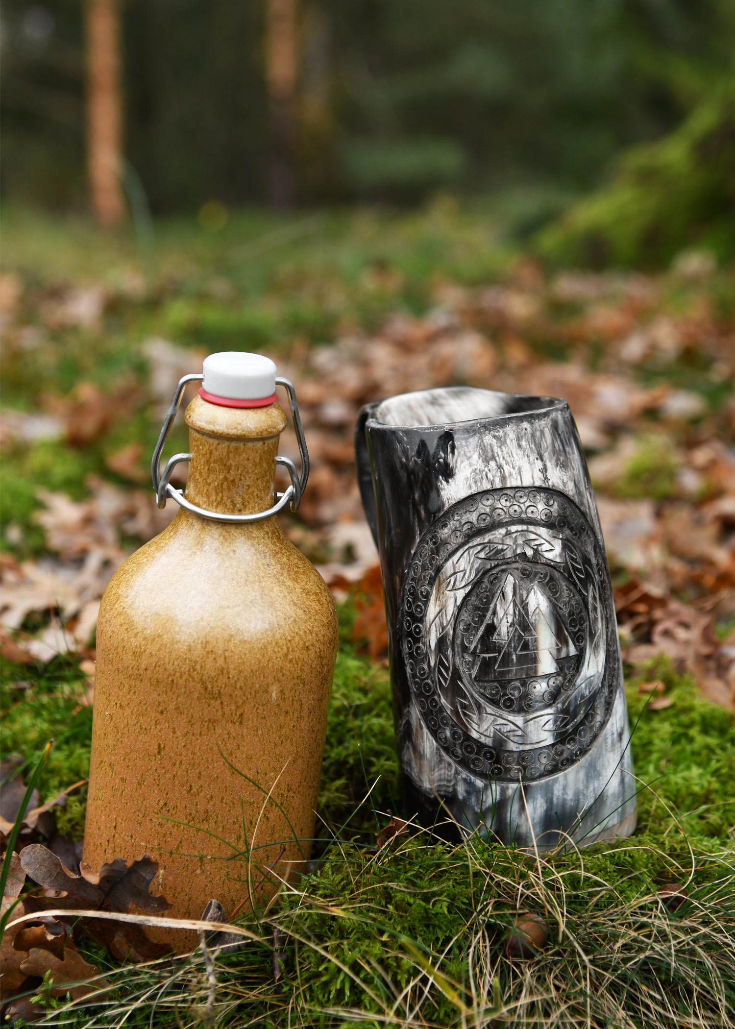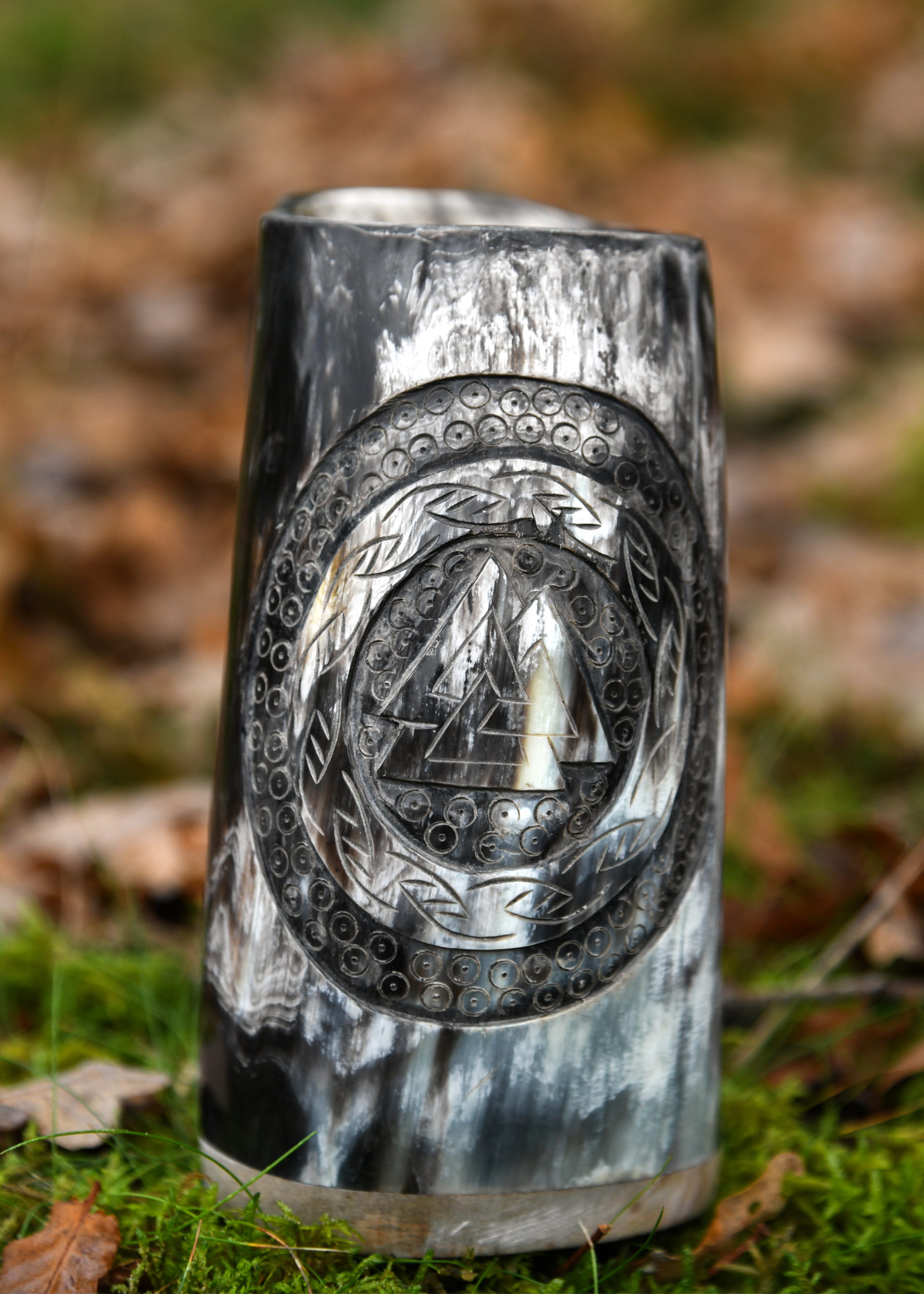 Hornbecher, Bierkrug mit Holzboden und Valknut-Motiv Nr.1