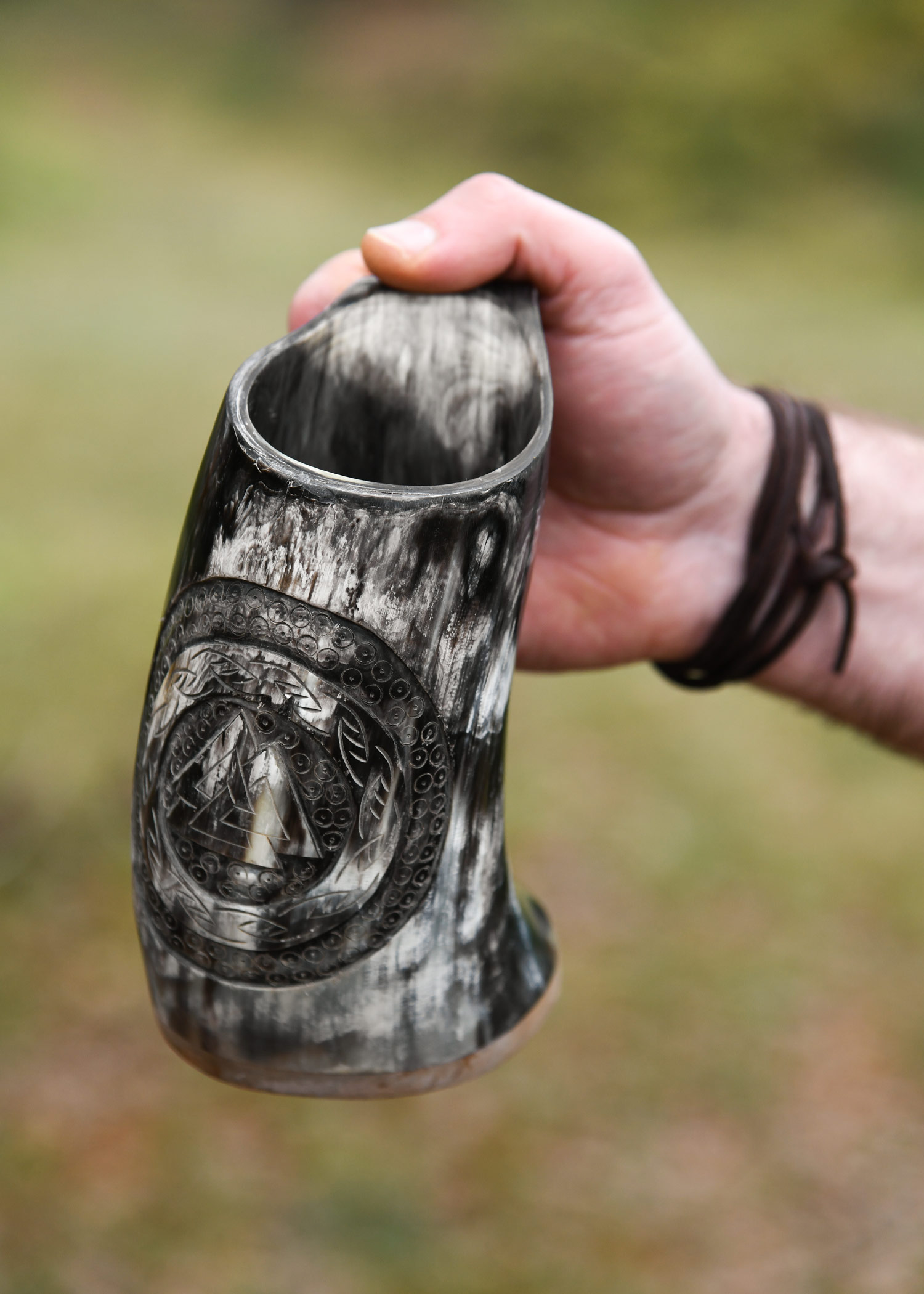 Dieser großzügig bemessene Henkelbecher / Humpen wird in Handarbeit aus Horn gefertigt, poliert und mit einem geschnitzten Valknut-Symbol verziert. Zusätzlich zur Schnitzerei hat dieser schöne Hornkrug einen Boden aus Holz. Die Valknut, ein aus drei ineinandergreifenden Dreiecken bestehendes Symbol, erscheint auf einer Vielzahl von archäologischen Fundstücken, die den Germanen zugeordnet werden. Obwohl über ihre wahre Bedeutung bis heute nur spekuliert werden kann, neigen manche Fachleute zu der Annahme, dass hier ein Zusammenhang mit Odin, dem Göttervater aus der nordischen Mythologie, besteht (daher die deutsche Alternativbezeichnung Wotansknoten). Inzwischen hat die Valknut ihren Weg in die moderne Kultur gefunden und ziert viele Schmuckstücke, Talismane oder Dekorationsgegenstände. Besonders beliebt ist sie bei den Anhängern des germanischen Neuheidentums (z.B. bei den Ásatrú-Anhängern).