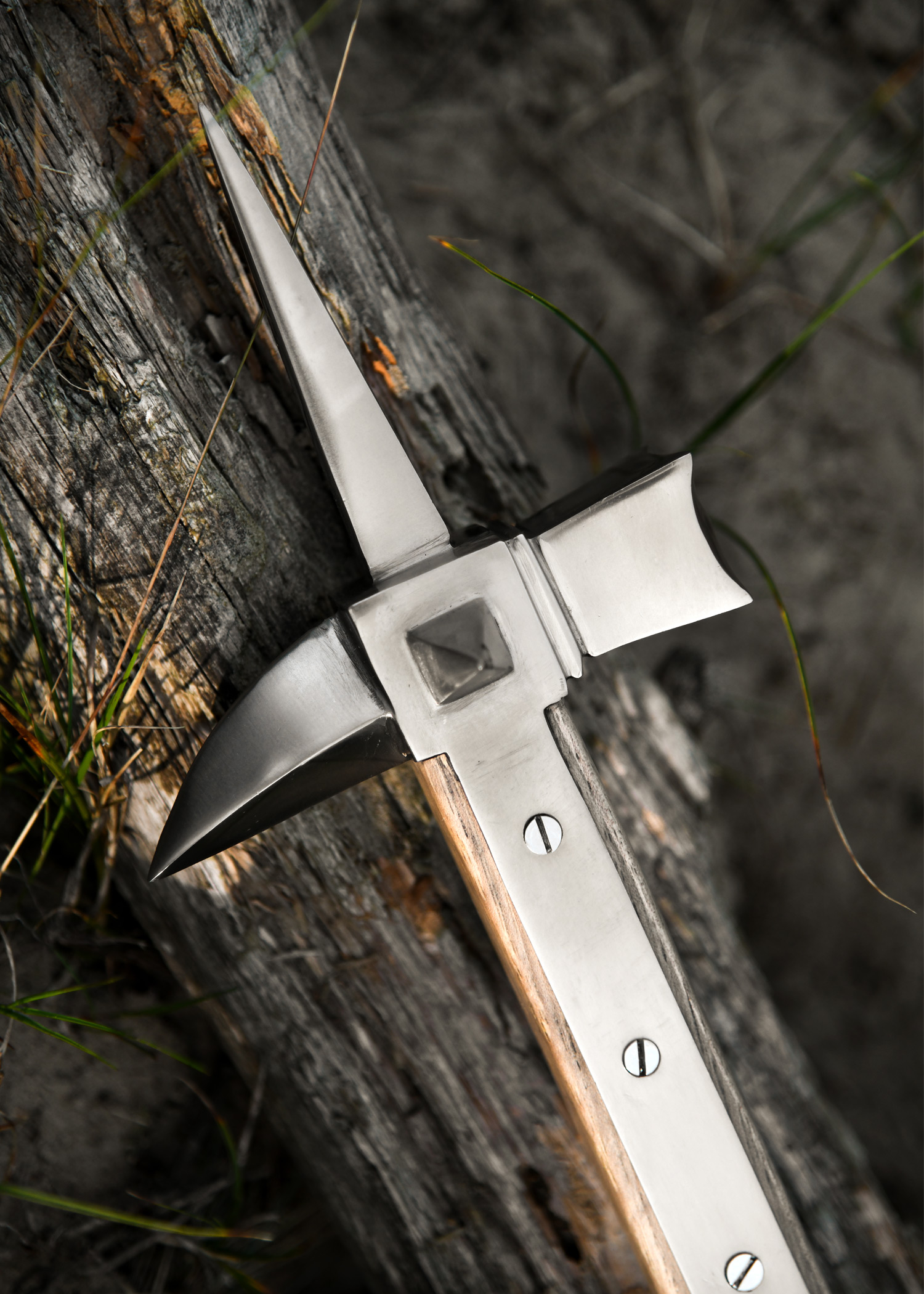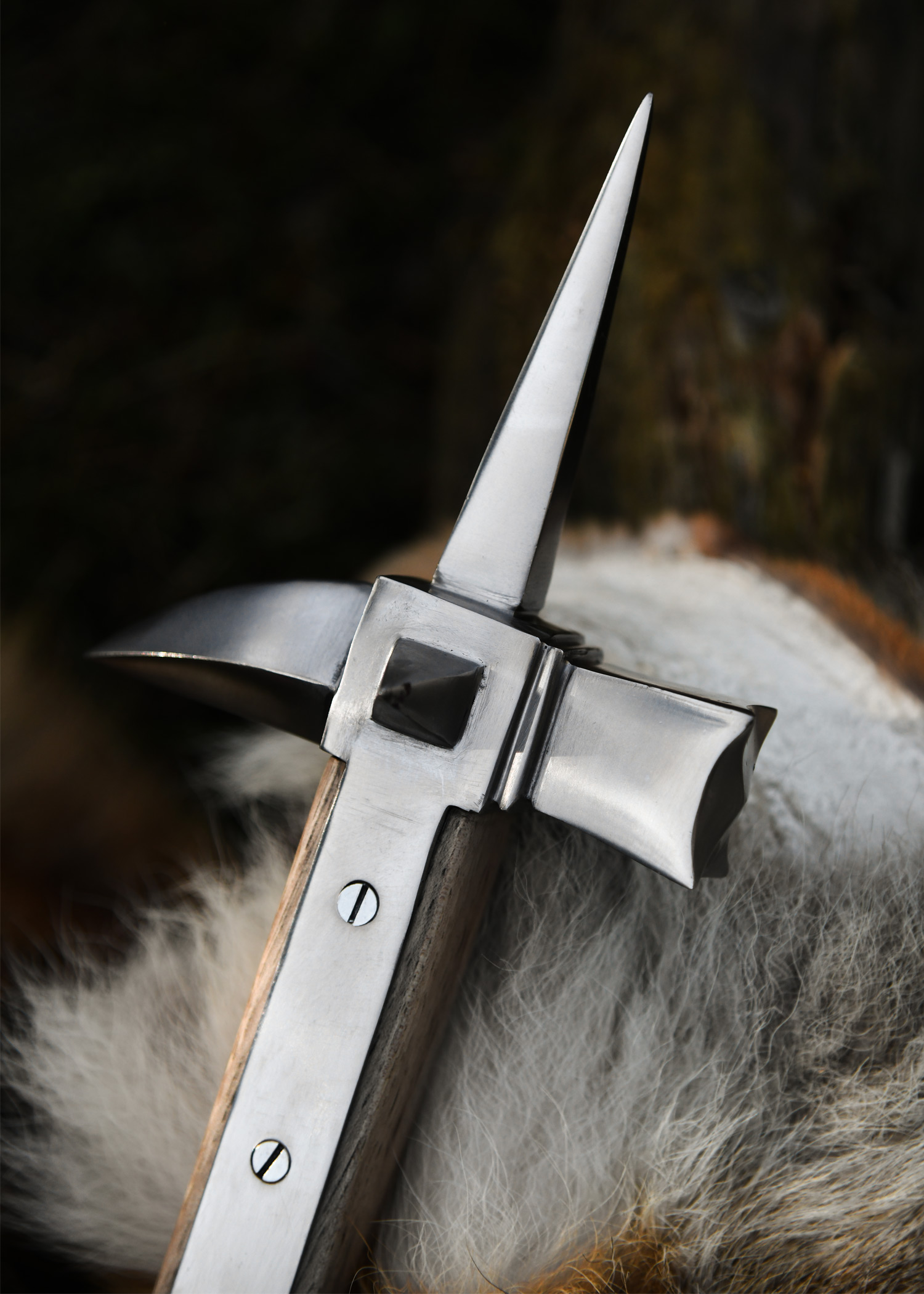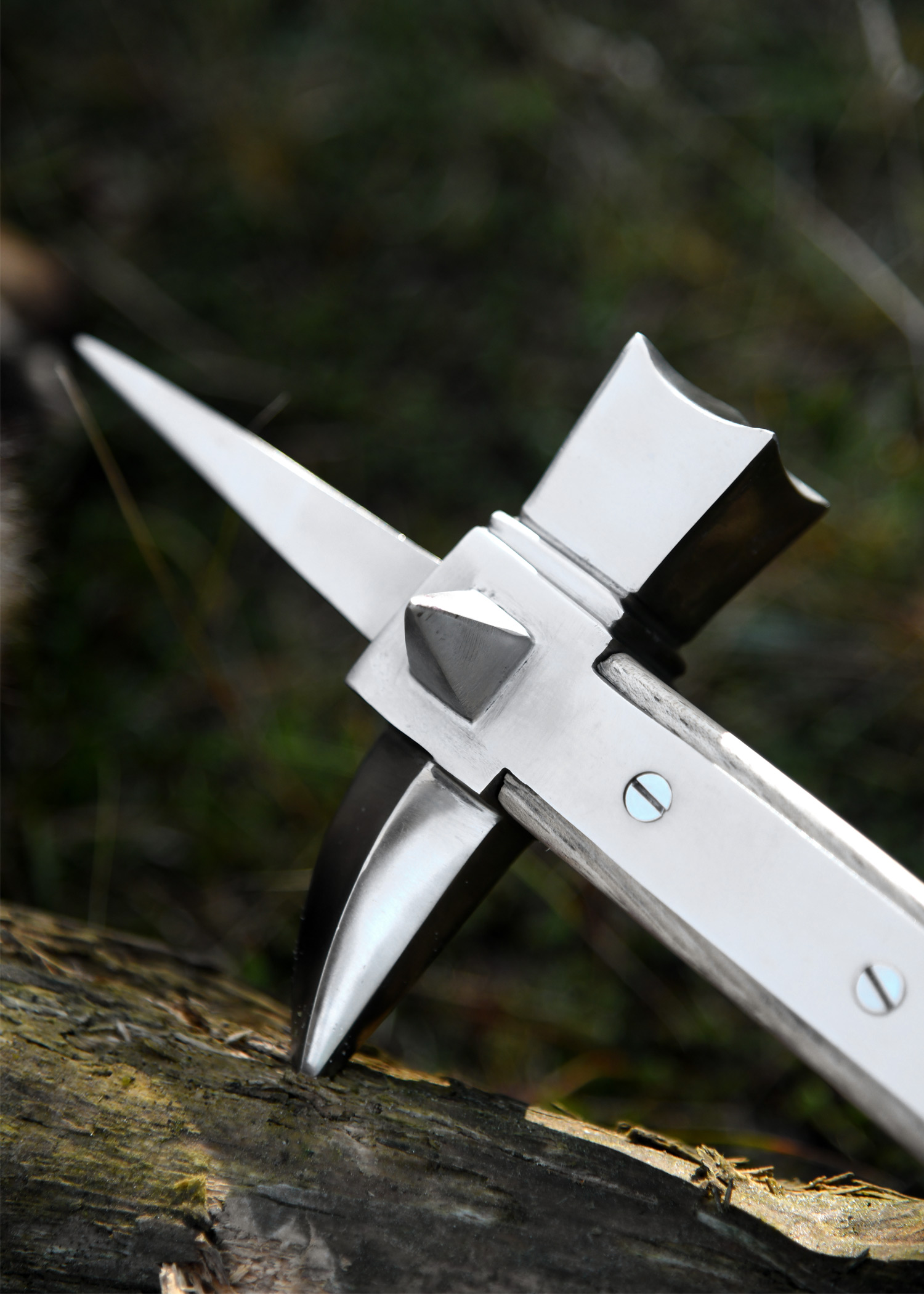 Mitte des 14. Jahrhunderts war die so weit entwickelt, dass ein Schwerthieb ihr kaum etwas anhaben konnte. Zu diesem Zeitpunkt griff der Ritter oder der Waffenknecht zu einem guten, soliden Kriegshammer. Mit kräftigen Schlägen konnte die Rüstung beschädigt und zertrümmert werden, was die Bewegungsfreiheit und die Fähigkeit zur Selbstverteidigung stark beeinträchtigte. Dieser hat einen großen Enddorn sowie kleine Dornen an den Seiten. Der hintere Dorn ist dick und in der Lage, eine Rüstung zu durchschlagen. Der Kopf ist mit Schaftfedern am Hartholzstiel befestigt, der für einen sicheren Griff ebenfalls mit Nieten versehen ist.
