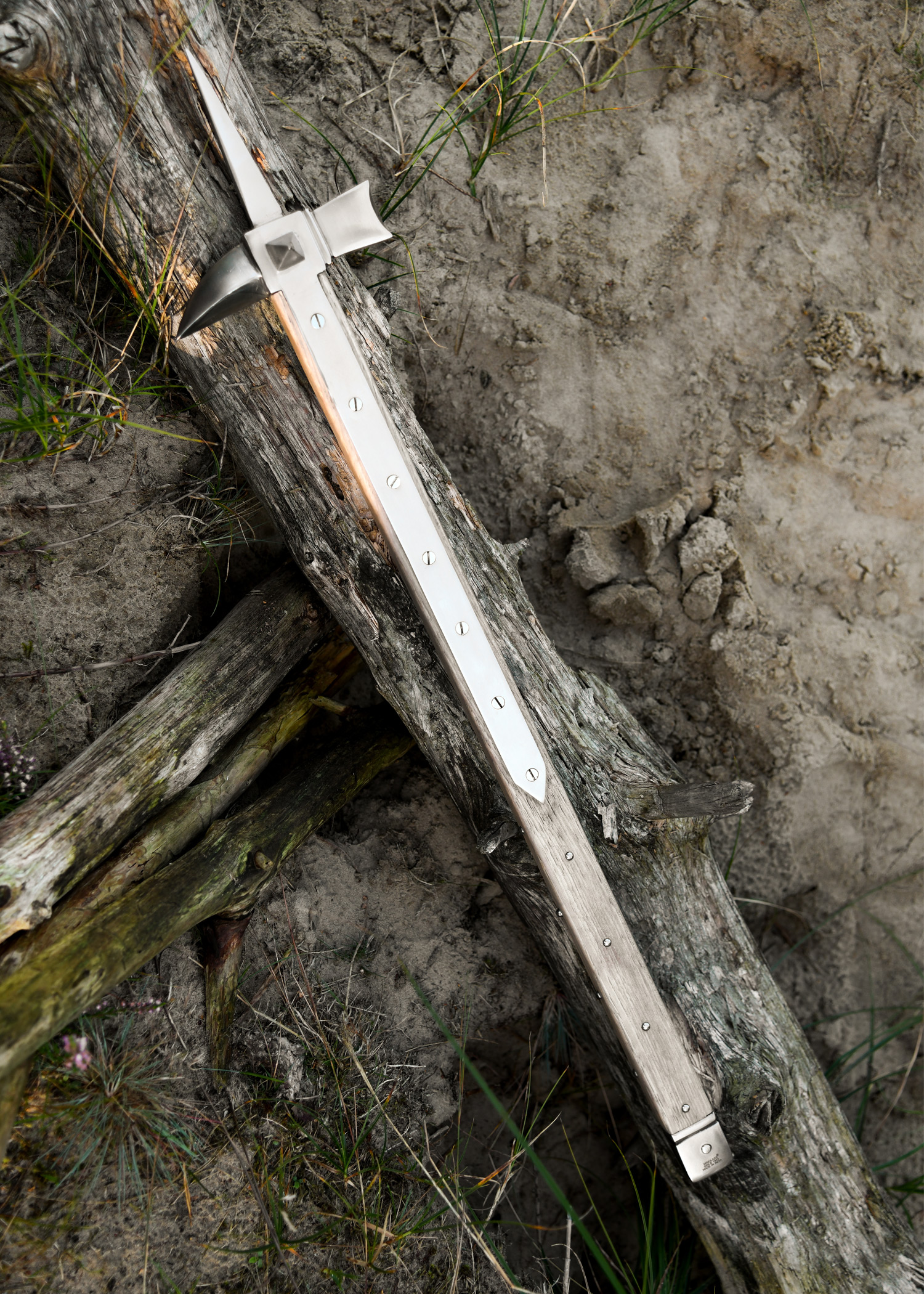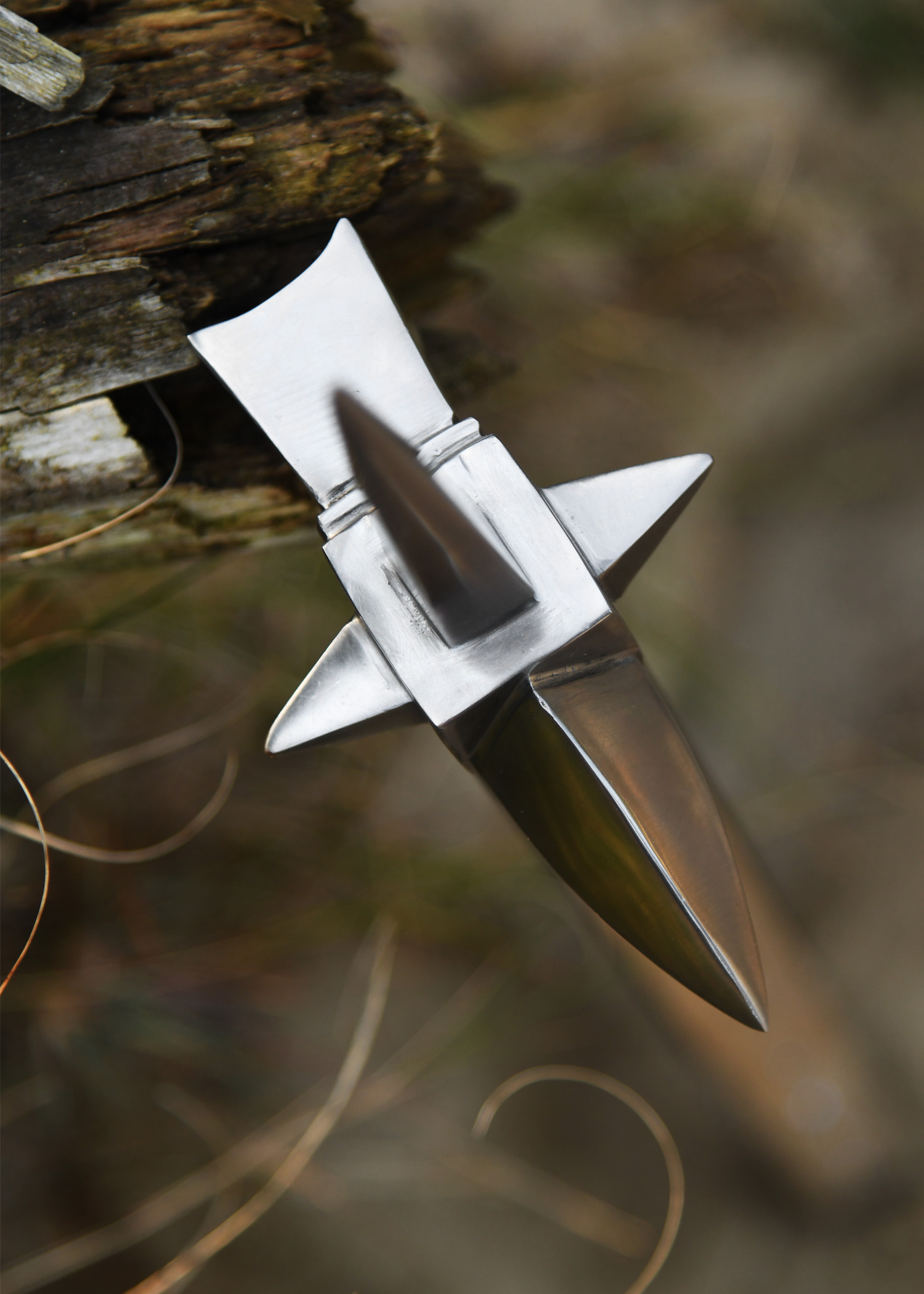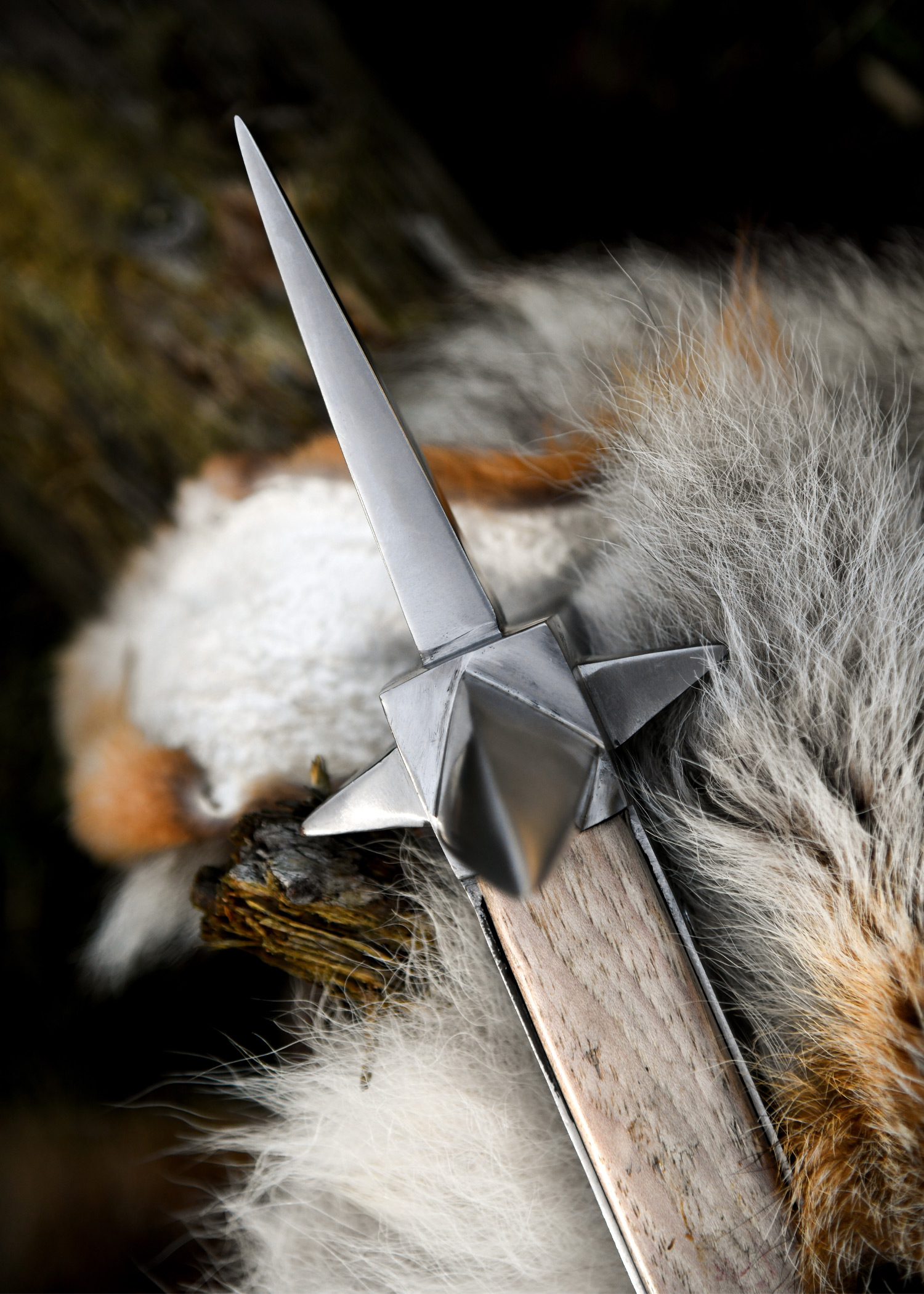 Mitte des 14. Jahrhunderts war die so weit entwickelt, dass ein Schwerthieb ihr kaum etwas anhaben konnte. Zu diesem Zeitpunkt griff der Ritter oder der Waffenknecht zu einem guten, soliden Kriegshammer. Mit kräftigen Schlägen konnte die Rüstung beschädigt und zertrümmert werden, was die Bewegungsfreiheit und die Fähigkeit zur Selbstverteidigung stark beeinträchtigte. Dieser hat einen großen Enddorn sowie kleine Dornen an den Seiten. Der hintere Dorn ist dick und in der Lage, eine Rüstung zu durchschlagen. Der Kopf ist mit Schaftfedern am Hartholzstiel befestigt, der für einen sicheren Griff ebenfalls mit Nieten versehen ist.