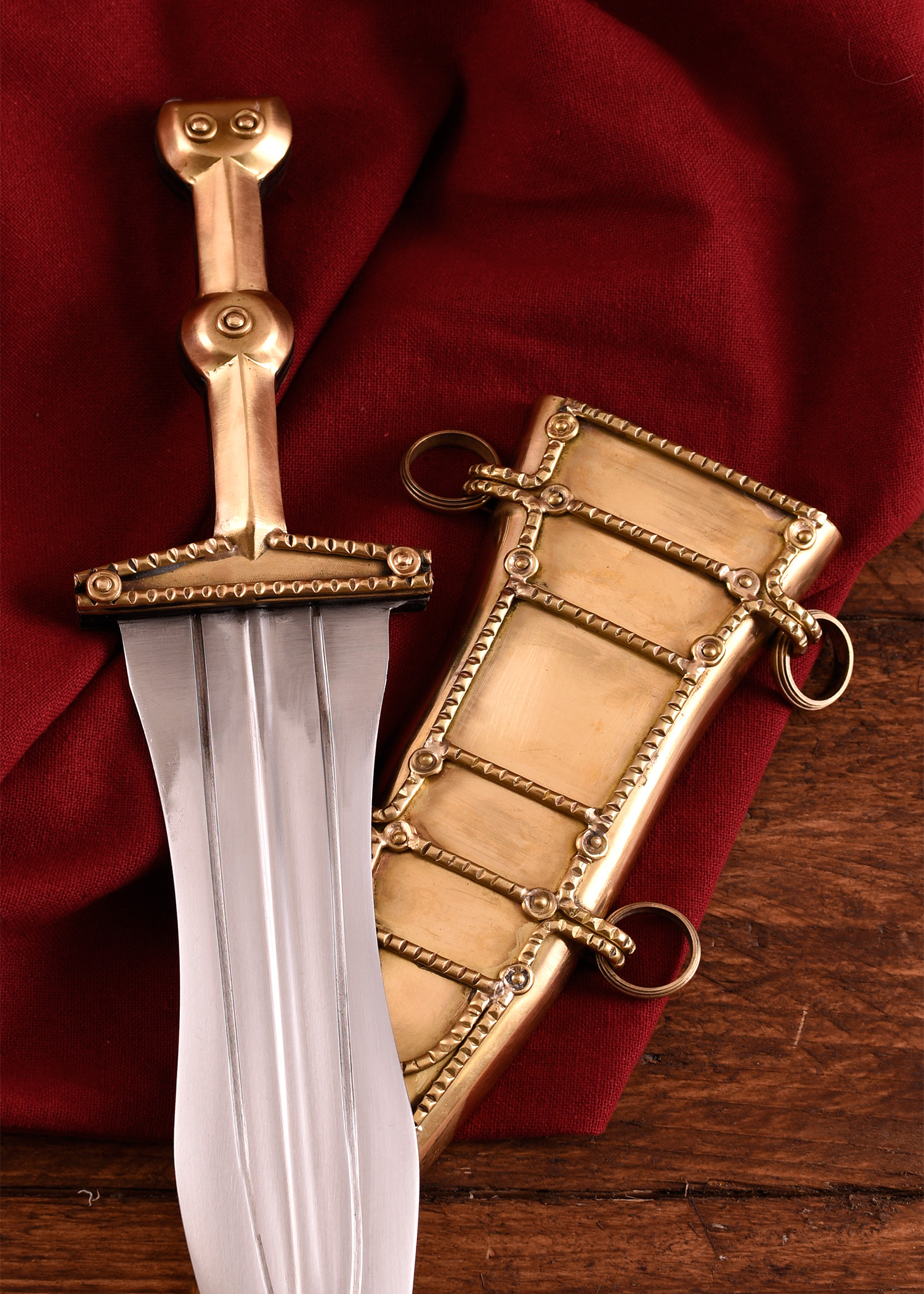 Diese Replik verfügt über eine klassische, breite, taillierte Klinge mit Kehlung. Der Griff besteht aus mehrerenSchichten Holz und Metall sowie Messing, welche kunstvoll miteinander vernietet sind. Die Dolchscheide wurde aus Messing gefertigt. Zur Befestigung am befinden sich 4 Tragringe andem Messingrahmen der Scheide. Die Schneiden dieses Pugio sind nicht geschärft.