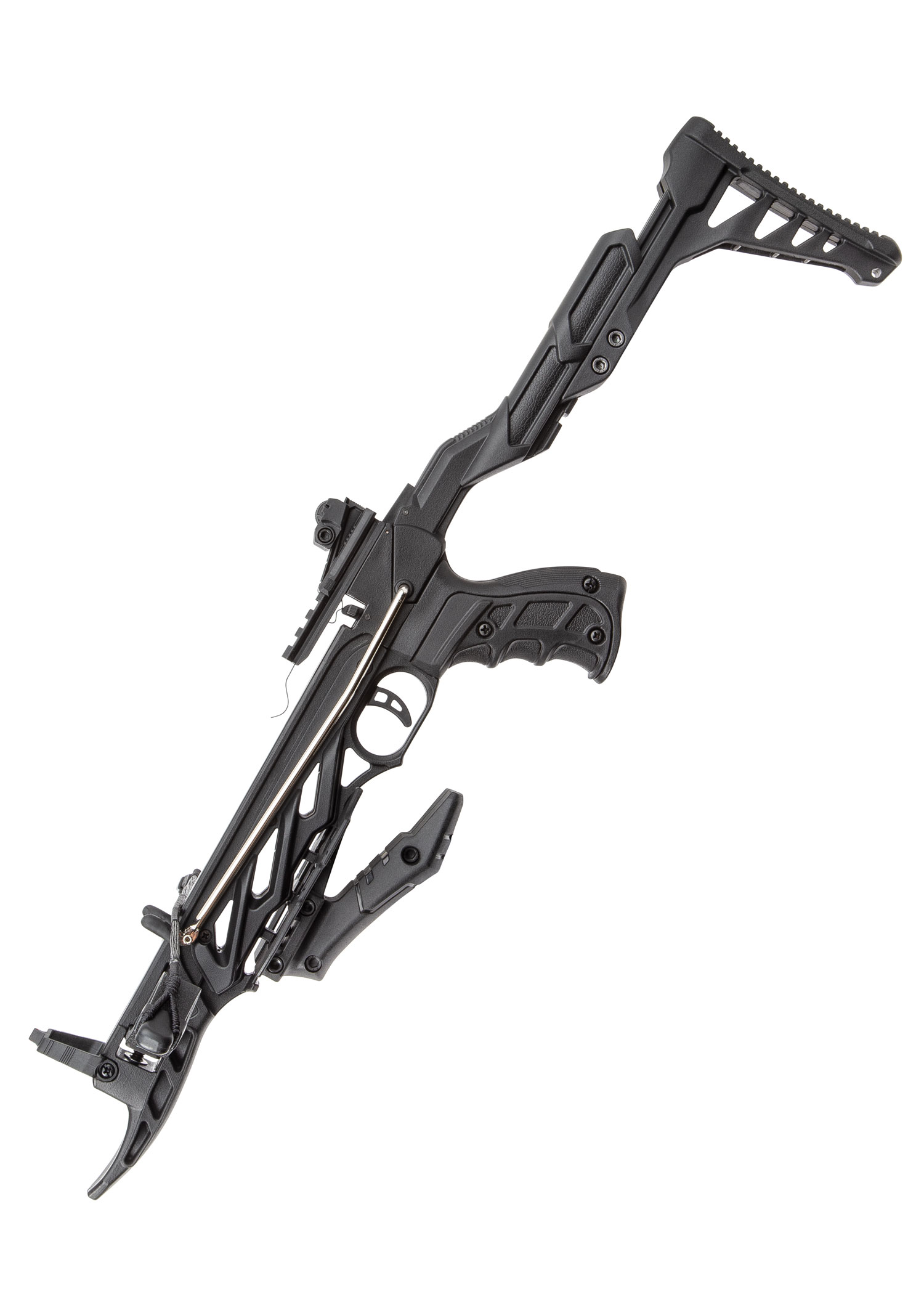 Die Armbrust ist aus strapazierfähigem Kunststoff gefertigt und die Wurfarme sind aus leichtem Fiberglas. Sie verfügt über einen einzigartigen, strukturierten TPR-Griff, und der verstellbare Hinterschaft erhöht die Gesamtlänge der Armbrust von 56 cm auf 61 cm.