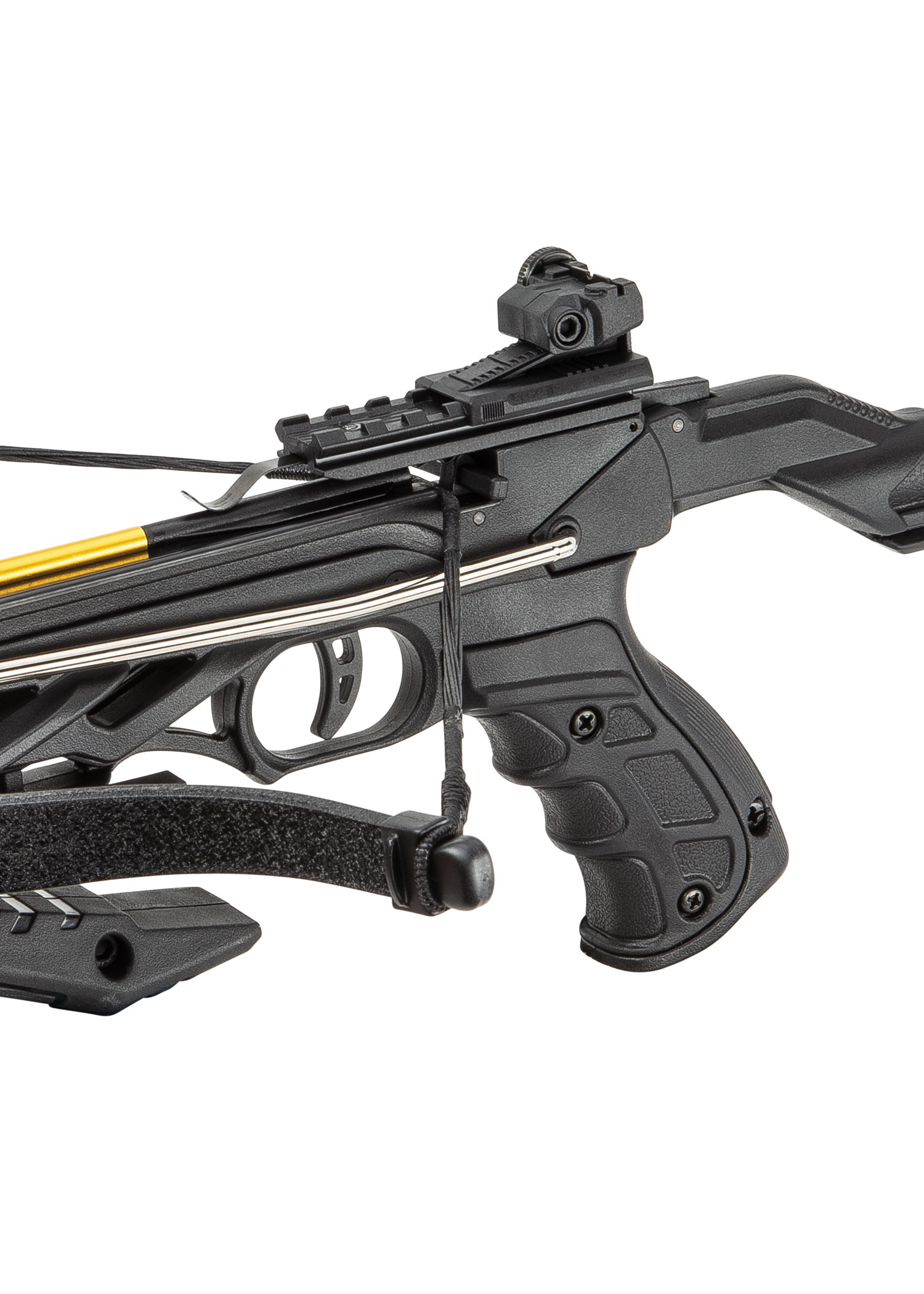 Die Armbrustpistole hat eine Picatinny-Schiene auf der Oberseite und auf der Unterseite, wo ein abnehmbarer Handgriff angebracht ist, so dass du die Möglichkeit hast, Dein eigenes Zubehör zu befestigen.
