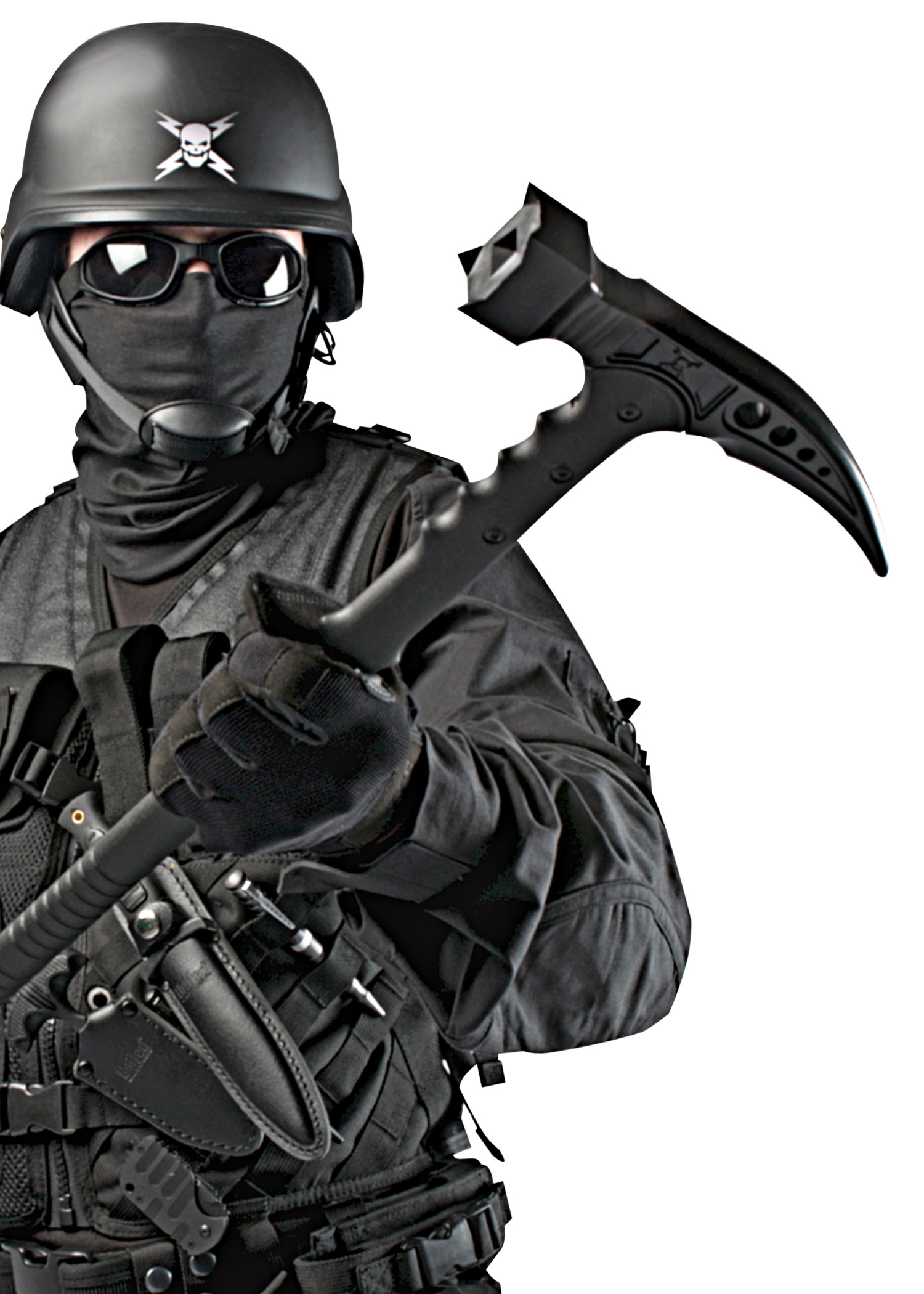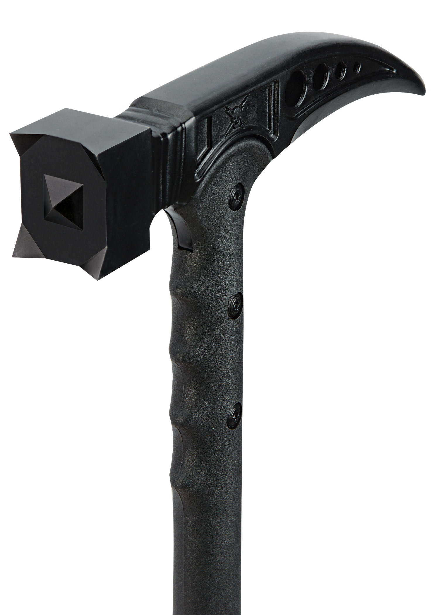 Der M48 Kommando taktische Survival-Hammer von United Cutlery ist der perfekte Begleiter beim Wandern und Campen. Mit einer Gesamtlänge von ca. 95 cm eignet er sich hervorragend als Wanderstock, wobei der aus Edelstahl 2Cr13 gegossene Kopf mit schwarzer Beschichtung dann als Griff dient. Neben seiner Funktion als vollwertiger Wanderstab bietet er mit seinem schlagkräftigen Hammerkopf und seinem gebogenen Stachel an der Rückseite großartige Anwendungsmöglichkeiten als wirksames Bruchwerkzeug und Hammer. Der glasfaserverstärkte Stiel ist nahezu unzerstörbar und mithilfe von Metallschrauben mit dem Kopf verbunden. Das Stielende ist mit einem Gummifuß ausgestattet.