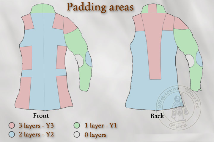 Der Aufbau der Polsterschichten wurde so konzipiert, dass die bestmögliche Beweglichkeit erhalten bleibt, das Gewicht so gering wie möglich gehalten wird und die Körperteile geschützt werden, die den meisten Schlägen ausgesetzt sind. Die Schichtung ist auf dem beigefügten Bild dargestellt.