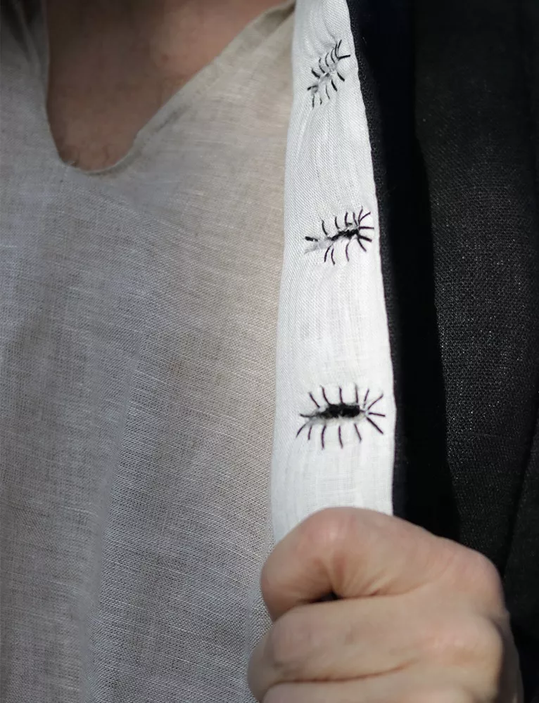 Der Gambeson wird auf der Vorderseite mit 10 in Zinn gegossenen Knöpfen geschlossen.