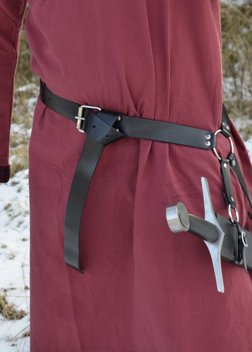 Sehr soilde verarbeiteter Schwertgürtel aus Rindsleder. Der Gürtel hat zwei kleinere Riemen, mit denen man die Schwertscheide befestigen kann. Auch für LARP-Schwerter geeignet. Details: - Material: Rindsleder ca. 3 mm stark - Gesamtlänge: ca. 160 cm - Breite: ca. 3,6 cm