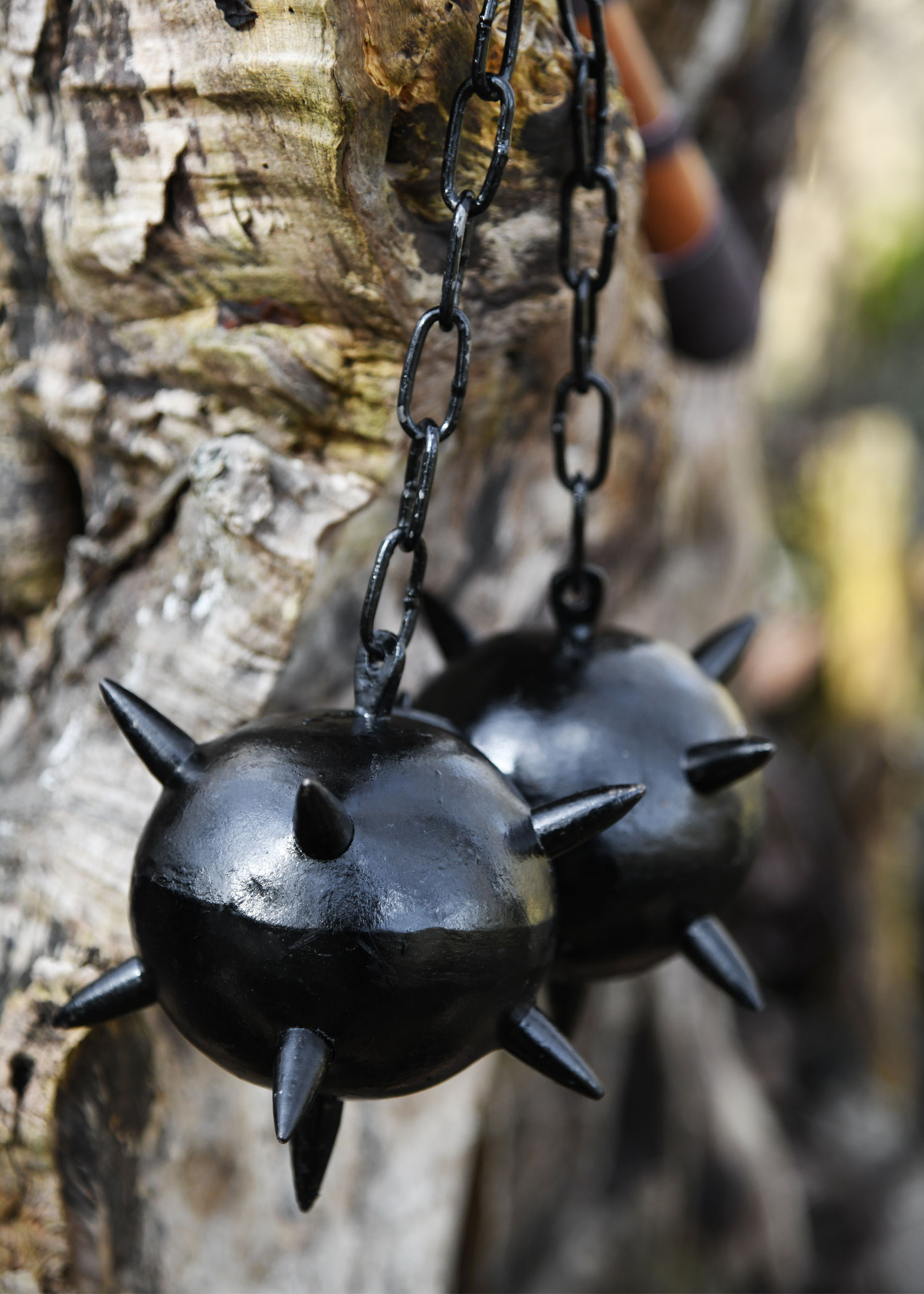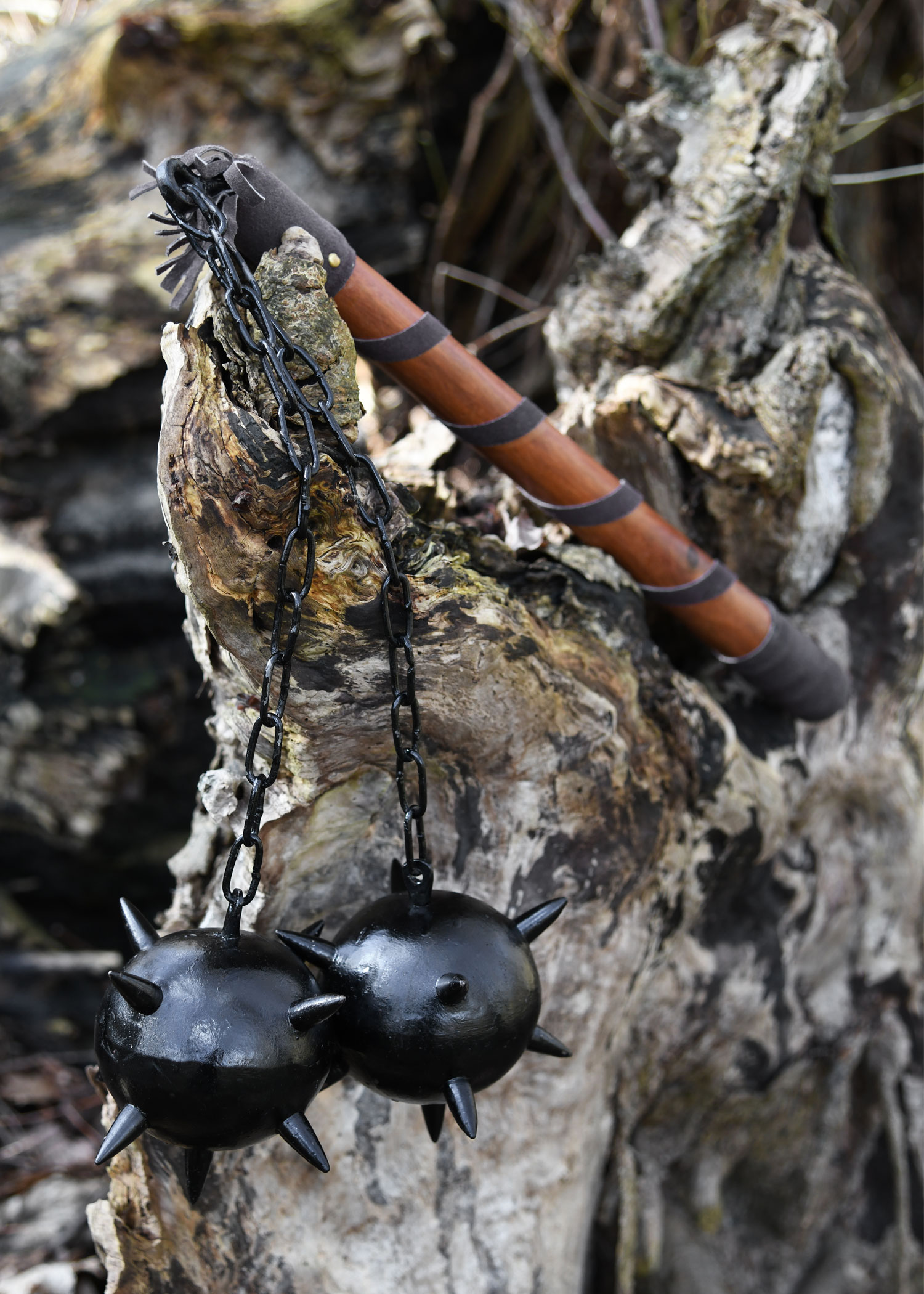 Sehr stabiler Morgenstern inklusive Hartholzgriff und Metallketten mit zwei Kugeln.