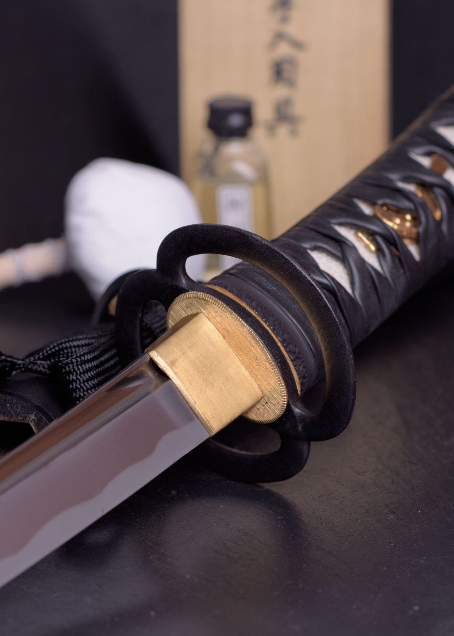 Für die Tsuka dieses Samuraischwertes wurde echte Rochenhaut (Same) verwendet, und die fest geschnürte Tsuka-Ito ist aus Leder. Außerdem ist der Griff anhand von zwei Stiften sicher mit dem Klingenerl befestigt.