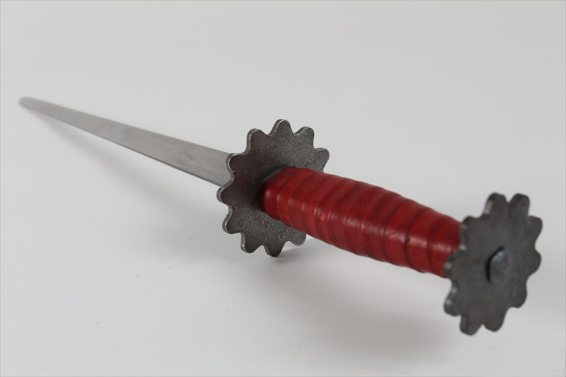HEMA-Dolch von Péter Regenyei. Der Dolch ist nicht nur für Training und Schaukampf einsetzbar, er macht auch als Teil ein mittelalterlichen Gewandung eine gute Figur. Klingenlänge: 360 mm Klingenstärke an der Scheibe: 40 mm Grifflänge: 115 mm PoB: 30 mm Gewicht: 350 g Scheibe: wellenförmig Der Griff ist mit Leder umwickelt.
