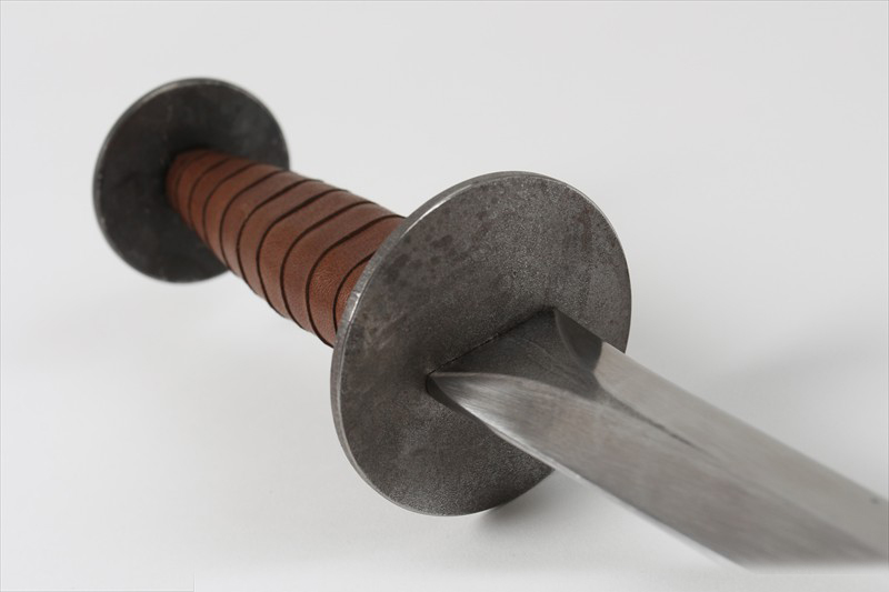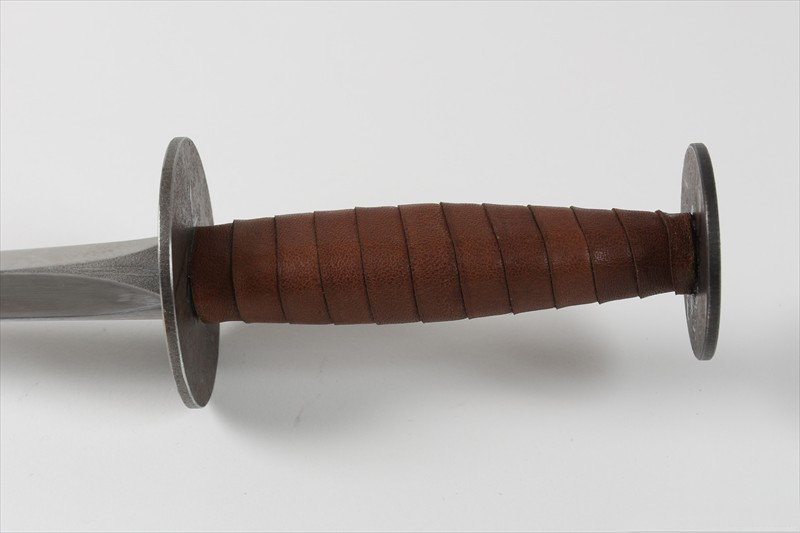 HEMA-Dolch von Péter Regenyei. Der Dolch ist nicht nur für Training und Schaukampf einsetzbar, er macht auch als Teil ein mittelalterlichen Gewandung eine gute Figur. Klingenlänge: 320 mm Klingenstärke an der Scheibe: 30 mm Grifflänge: 115 mm PoB: 25 mm Gewicht: 365 g Scheibe: rund Der Griff ist mit Leder umwickelt.