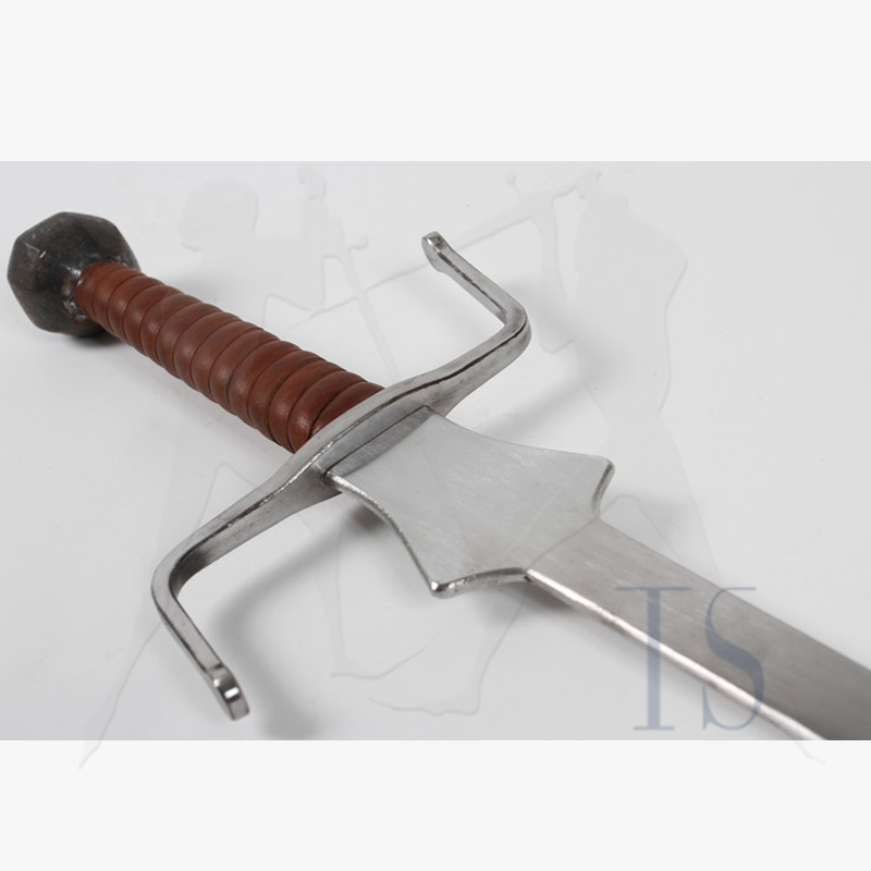 Einhand-HEMA Fechtfeder von Peter Regenyei. Typ2 Federschwert nach italienischer Schule Die 50HRC Federstahl-Klinge ist flexibel und biegt sich im Stich. Die Spitze ist umgeschlagen, stumpf und ca 10mm x 10mm um die Energie bei Auftreffen besser zu verteilen. Die Klinge entspricht dem Typ A. Sie ist leicht und ziemlich biegsam. Die Klinge ist aber nur für leichtes-Sparring geeignet. Beim Training und besonders beim Sparring bitte immer ausreichend Schutzausrüstung tragen. Klinge: wide schilt Klinge: Typ A - flexiblere-Version Pommel: rund -> glatt (leicht abweichend zum Pommel auf den Bildern) Griff: schwarzer Faden Gewicht: 1070 g Grifflänge: 17,5 cm Klingenlänge: 80,5 cm Länge Kreuz: 7 cm PoB: ca 8 cm vor dem Kreuz Customized Federn und weitere Typen sind auf Anfrage erhältlich.
