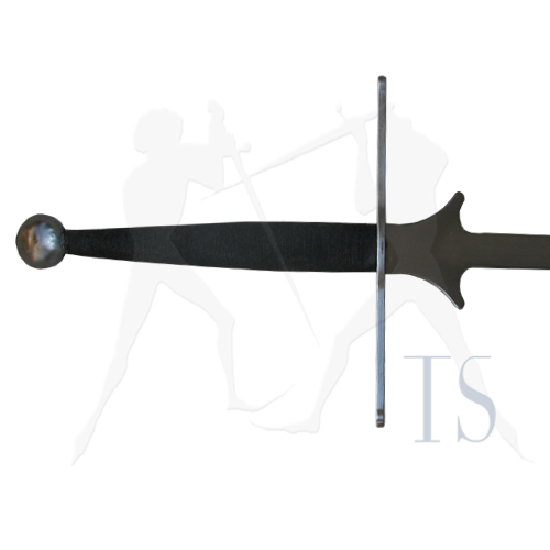 HEMA Fechtfeder von Peter Regenyei. Typ1 Die 50HRC Federstahl-Klinge ist flexibel und biegt sich im Stich. Die Spitze ist umgeschlagen, stumpf und ca 10mm x 10mm um die Energie bei Auftreffen besser zu verteilen. Beim Training und besonders beim Sparring bitte immer ausreichend Schutzausrüstung tragen. Der Klingenschild hat zwei verlängerte Ausläufer um die Finger besser zu schützen. Klinge: spiky schilt Klinge: Typ B - steifere-Version Pommel: rund Griff: gewickelter schwarzer Faden Gewicht: 1300g - 1500g Gesamtlänge: 1310 mm Grifflänge incl Pommel: 320 mm Klingenlänge: 1000 mm Länge Kreuz: 250 mm PoB: ca 90 mm vor dem Kreuz