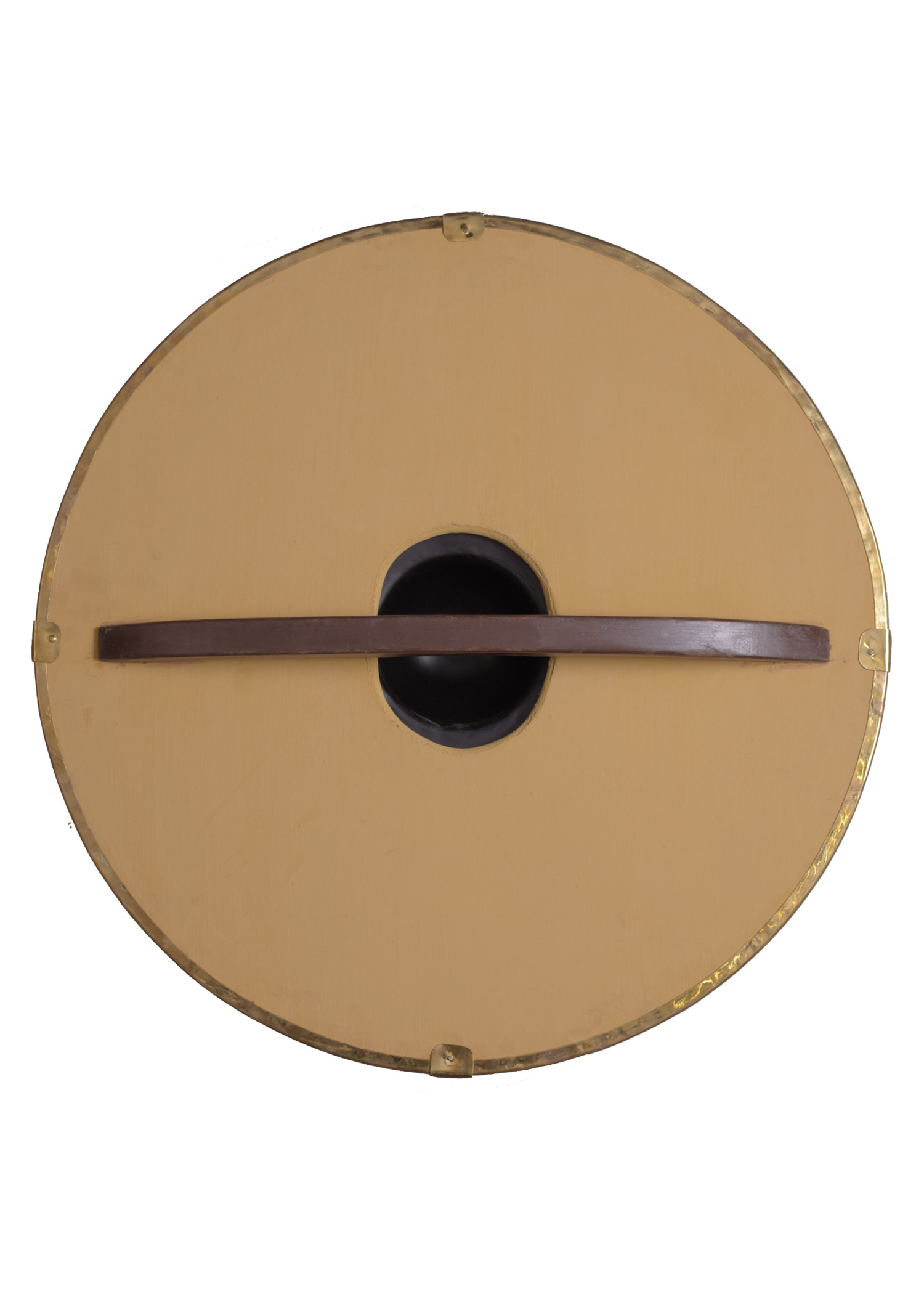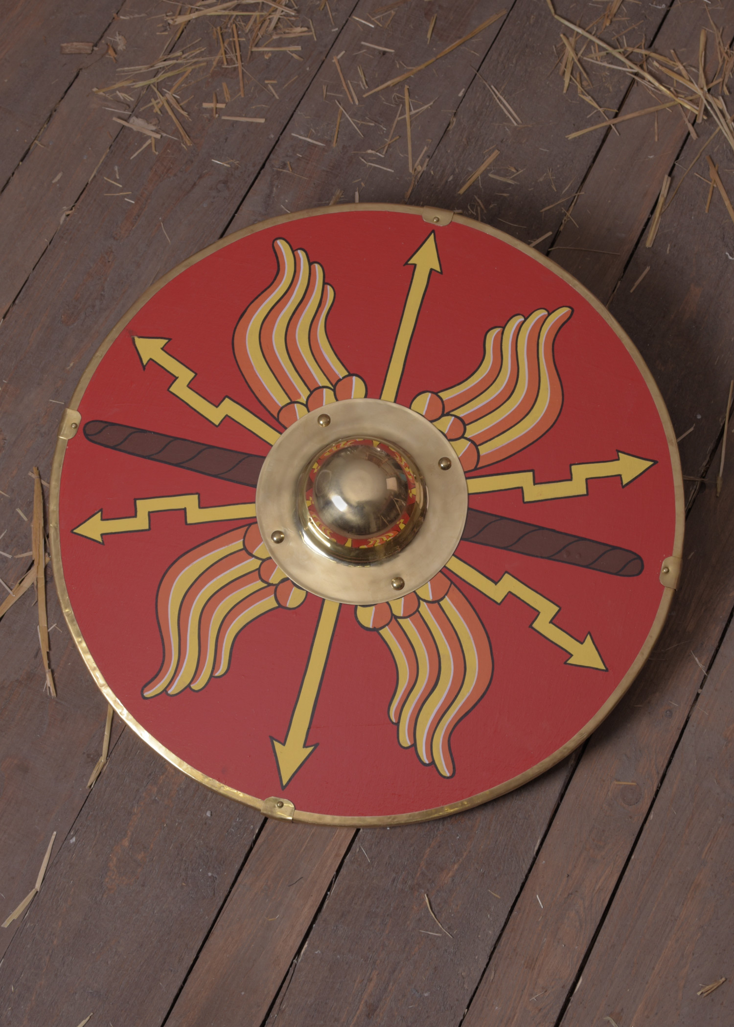 Unsere Replik ist aus ca. 1 cm dickem Sperrholz und hat einen Schildbuckel aus Messing. Dieser muss vor Gebrauch durch den Kunden mit den mitgelieferten Zierschrauben befestigt werden.