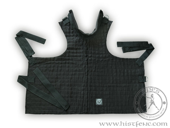Body Plastron für den Oberkörper. Es besteht aus sechs Lagen dicht gewebter und gesteppter Baumwolle. Er wird am Rücken mit Schnellen geschlossen. Material: 100% Baumwolle Gewicht 1,0 kg Farbe: schwarz