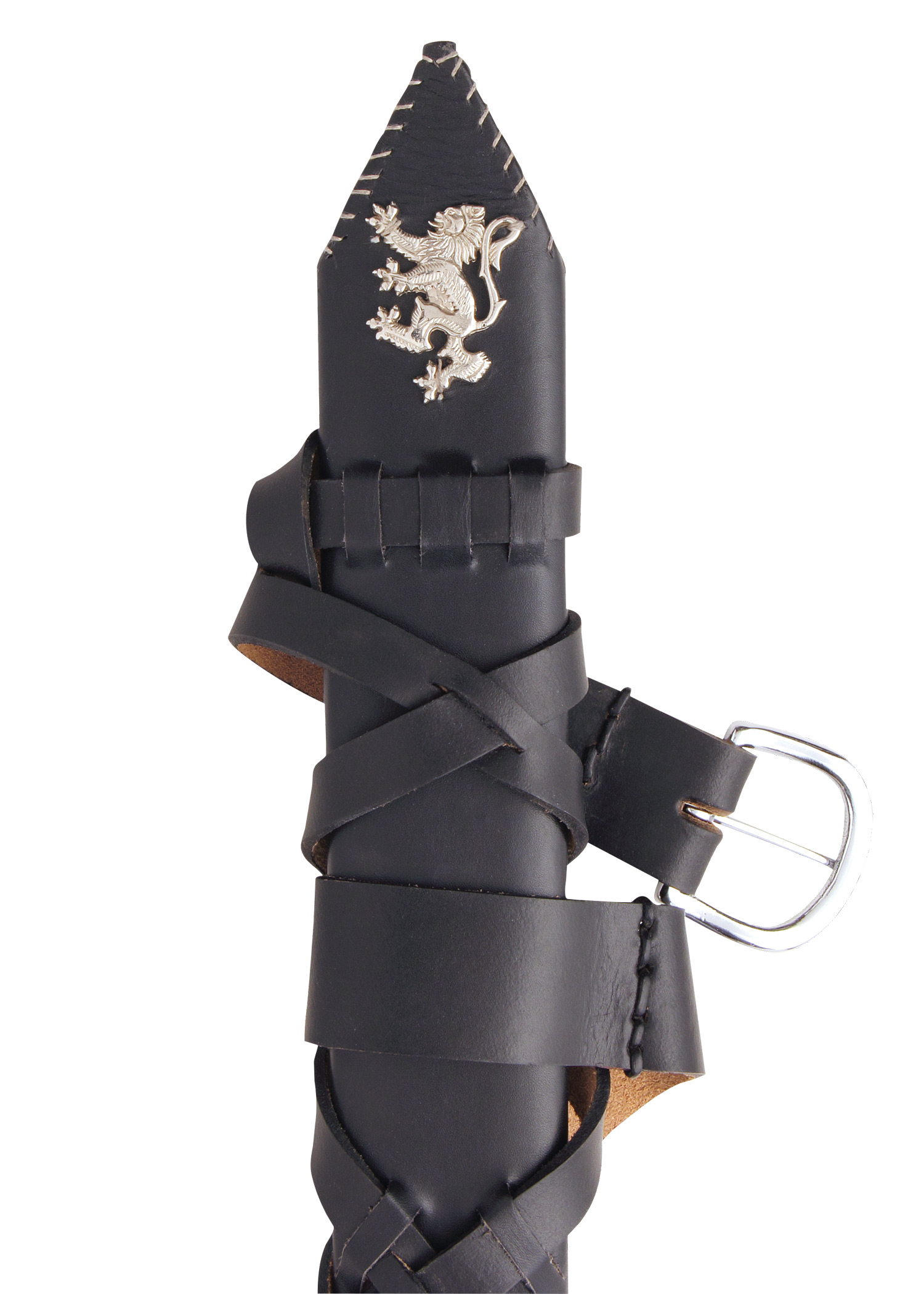 Das massive Schwert wird komplett mit einer passenden, dicken schwarzen Lederscheide geliefert, die an der Kehle einen silbernen Löwen von Schottland und an der Spitze einen abgerundeten silbernen Metallschuh trägt. An der Scheide ist ein praktischer, schwarzer Ledergürtel befestigt.