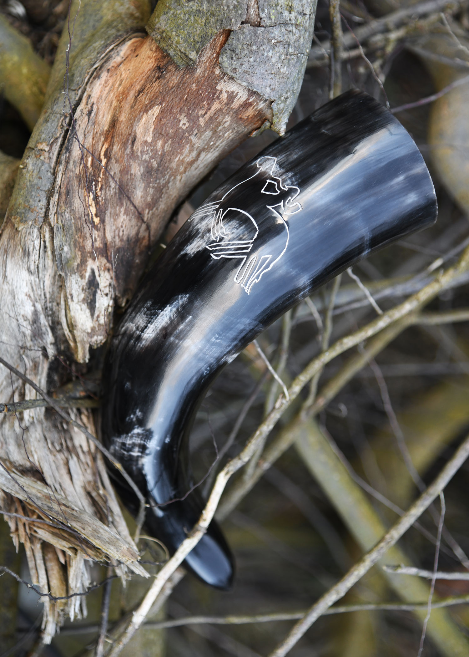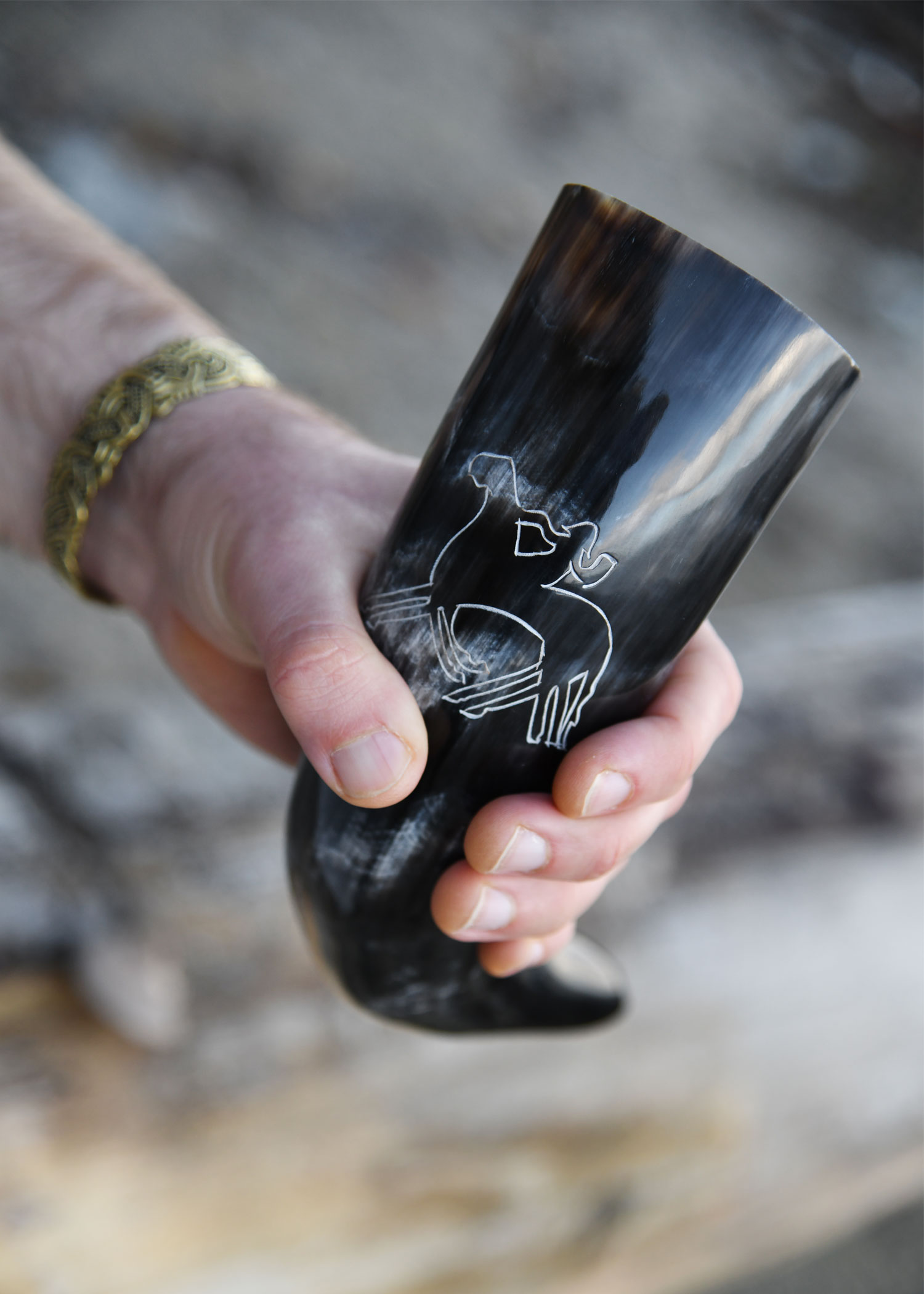 Das hier angebotene Trinkhorn ist aus Rinderhorn in Handarbeit gefertigt, poliert, und mit einem eingravierten Motiv von Odin auf seinem sagenumwobenen, achtbeinigen Pferd Sleipnir (auch Sleipner) verziert. Das Design basiert auf einem Bildstein aus dem 8. Jahrhundert, welcher nahe Tjängvide auf der schwedischen Insel Gotland gefunden wurde und heute im staatlichen historischen Museum (Statens historiska museum, kurz Historiska museet) in Stockholm bewundert werden kann. Obwohl die auf dem Bildstein von Tjängvide dargestellten Motive bis heute Raum für Interpretationen lassen, wird der rechts im oberen Feld des Steins abgebildete Krieger zu Ross von den meisten Experten gewöhnlich als der nordische Göttervater identifiziert, der auf Sleipnir sitzt.