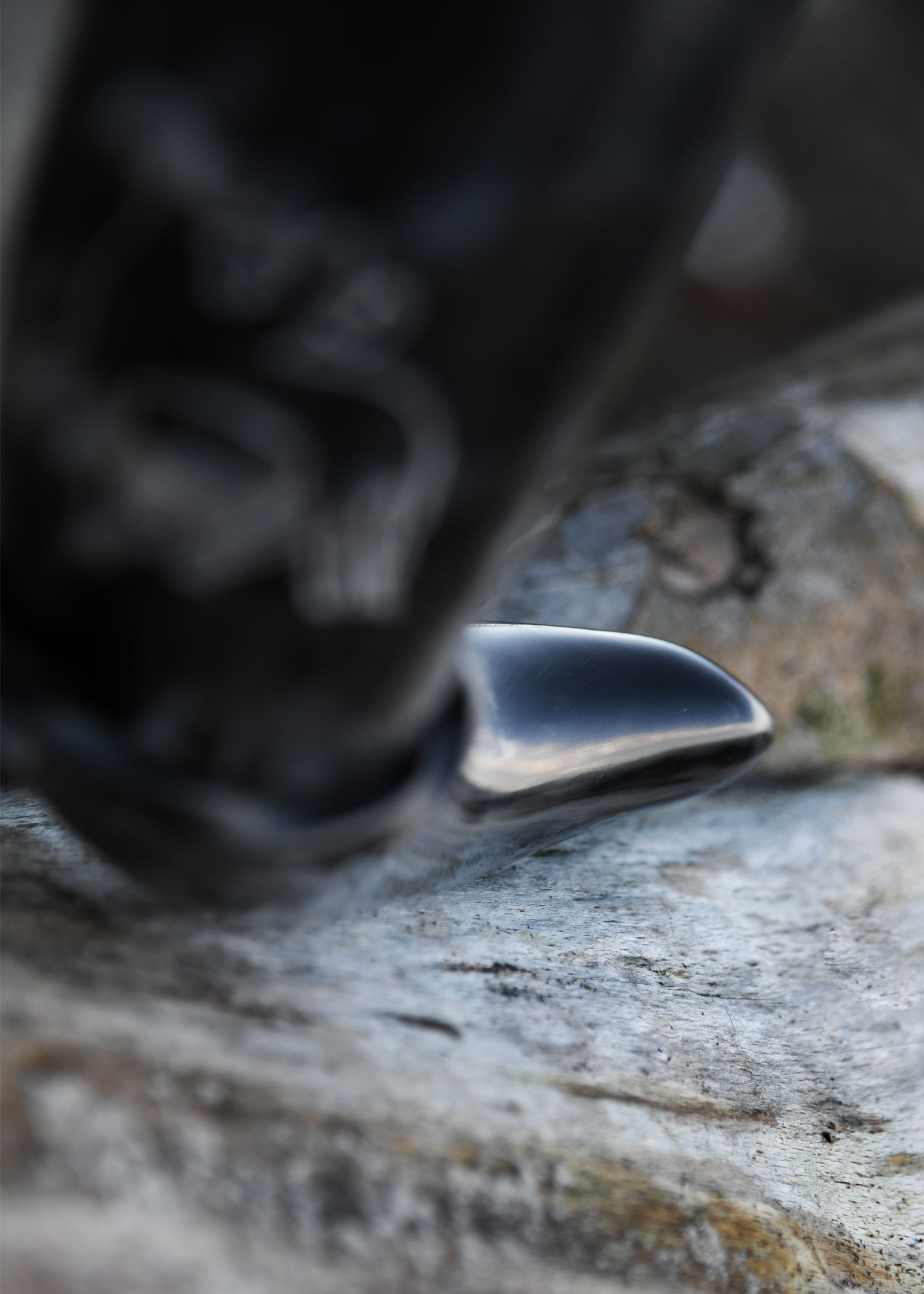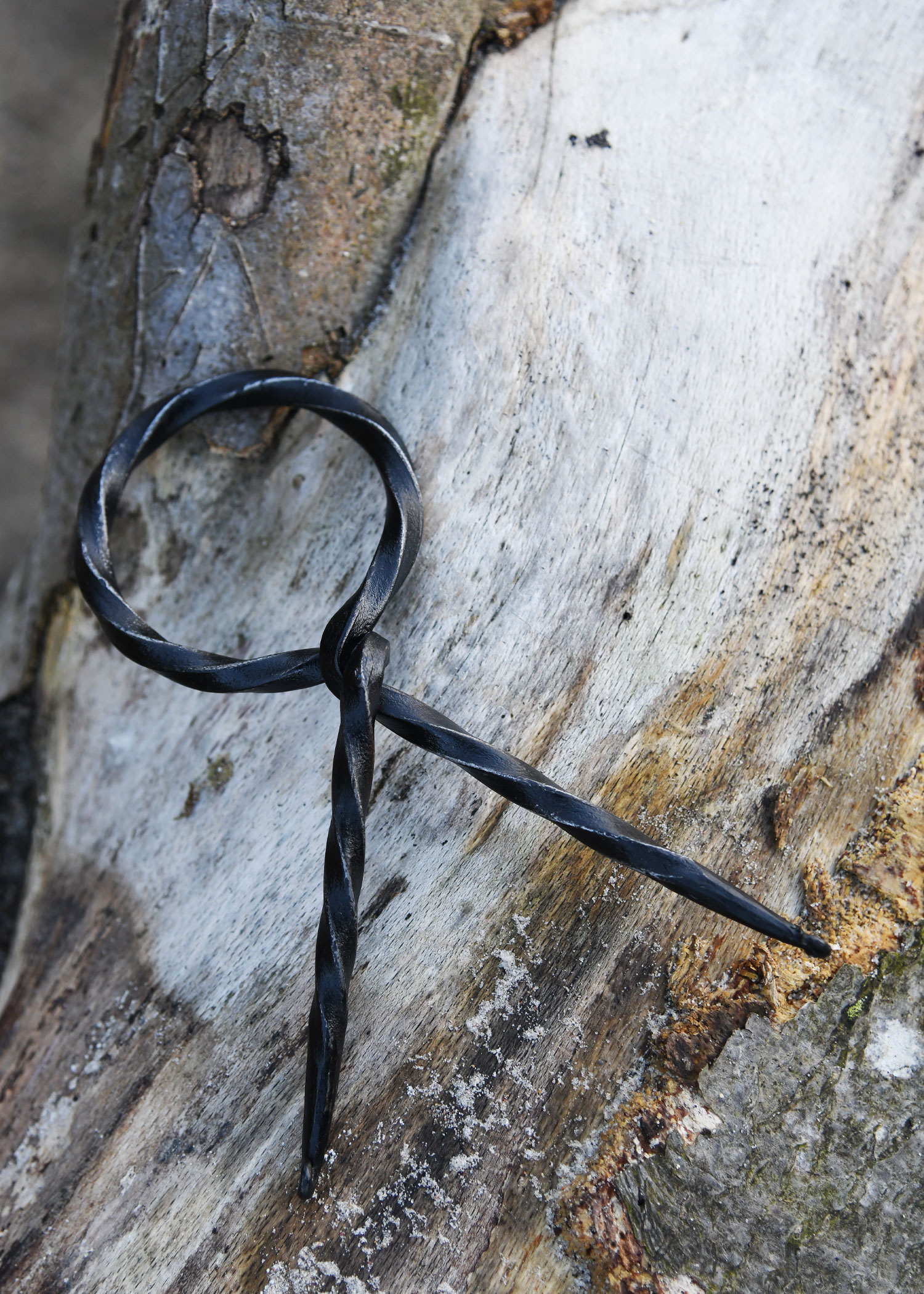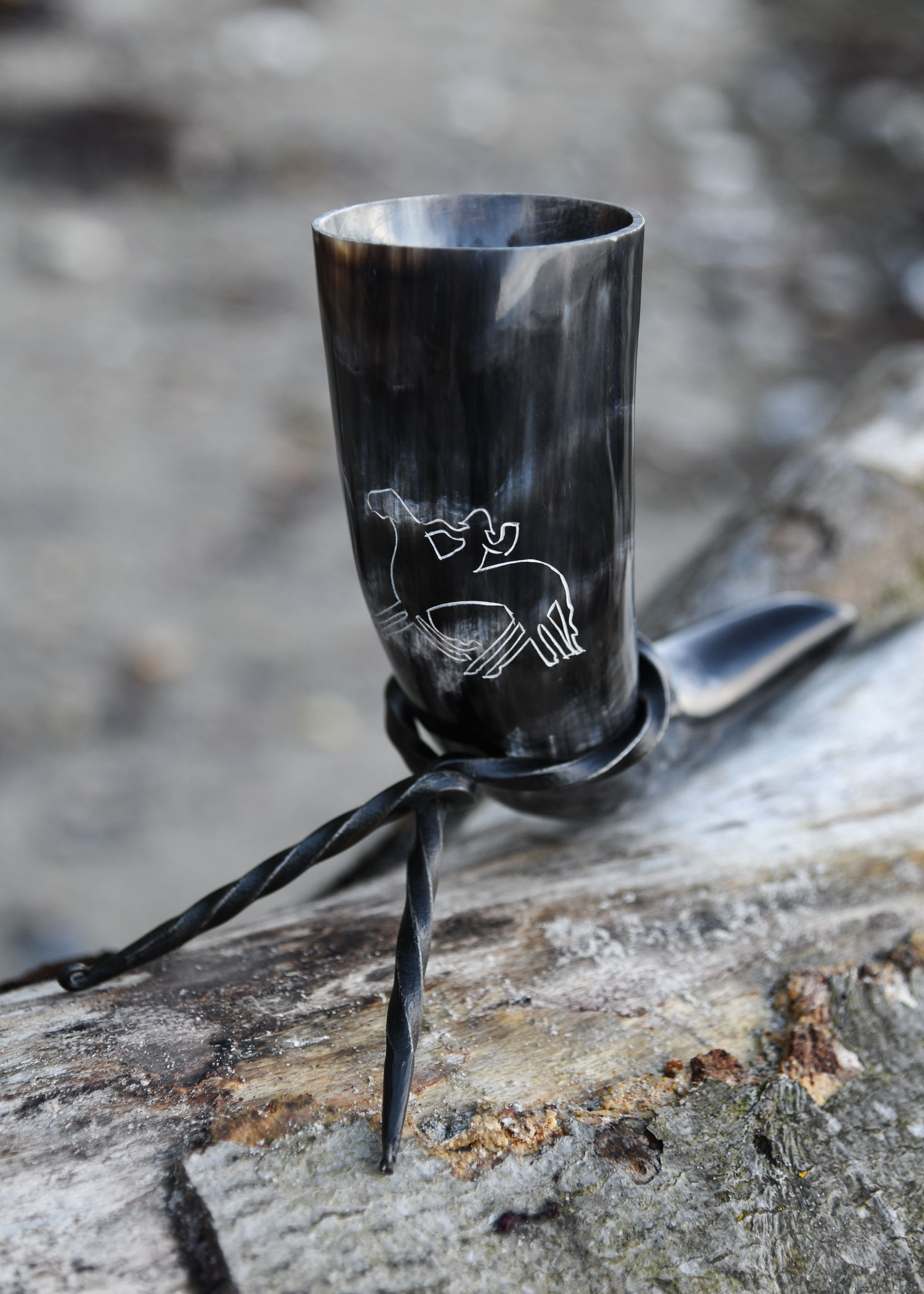 Zum Lieferumfang gehört ein praktischer, gut transportabler Trinkhornständer aus handgeschmiedetem Stahl mit einfachem Prinzip: Steckt man das Horn durch die Öffnung, bilden die Beine des Ständers und die Hornspitze ein standsicheres Dreibein. So kannst Du Dein Trinkhorn immer sicher abstellen.