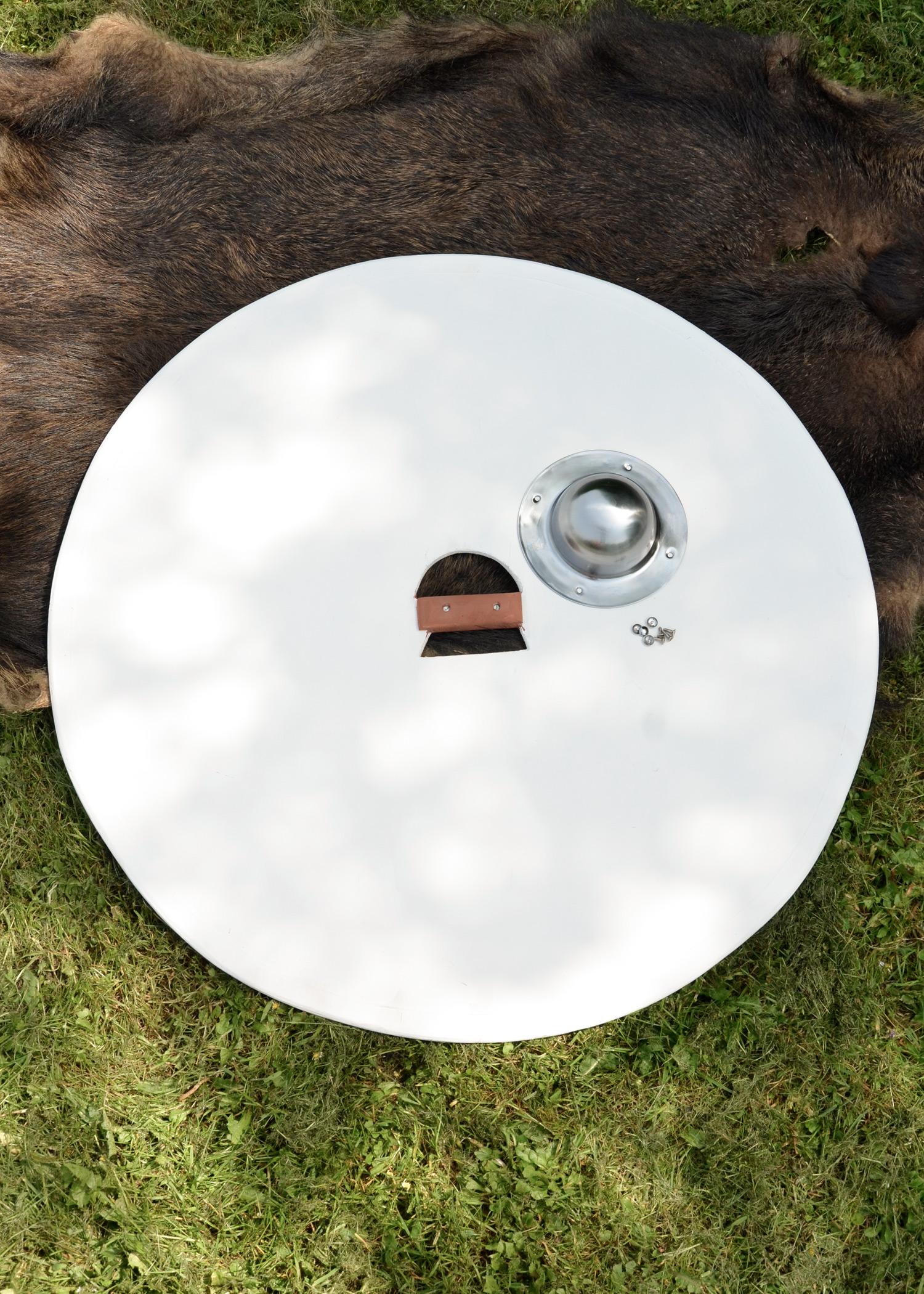 Dieser Rundschild ist aus ca. 13 mm starkem Schichtholz gefertigt. Die Oberfläche ist mit Segeltuch bespannt, mit dem Holz verklebt und weiß vorgestrichen.