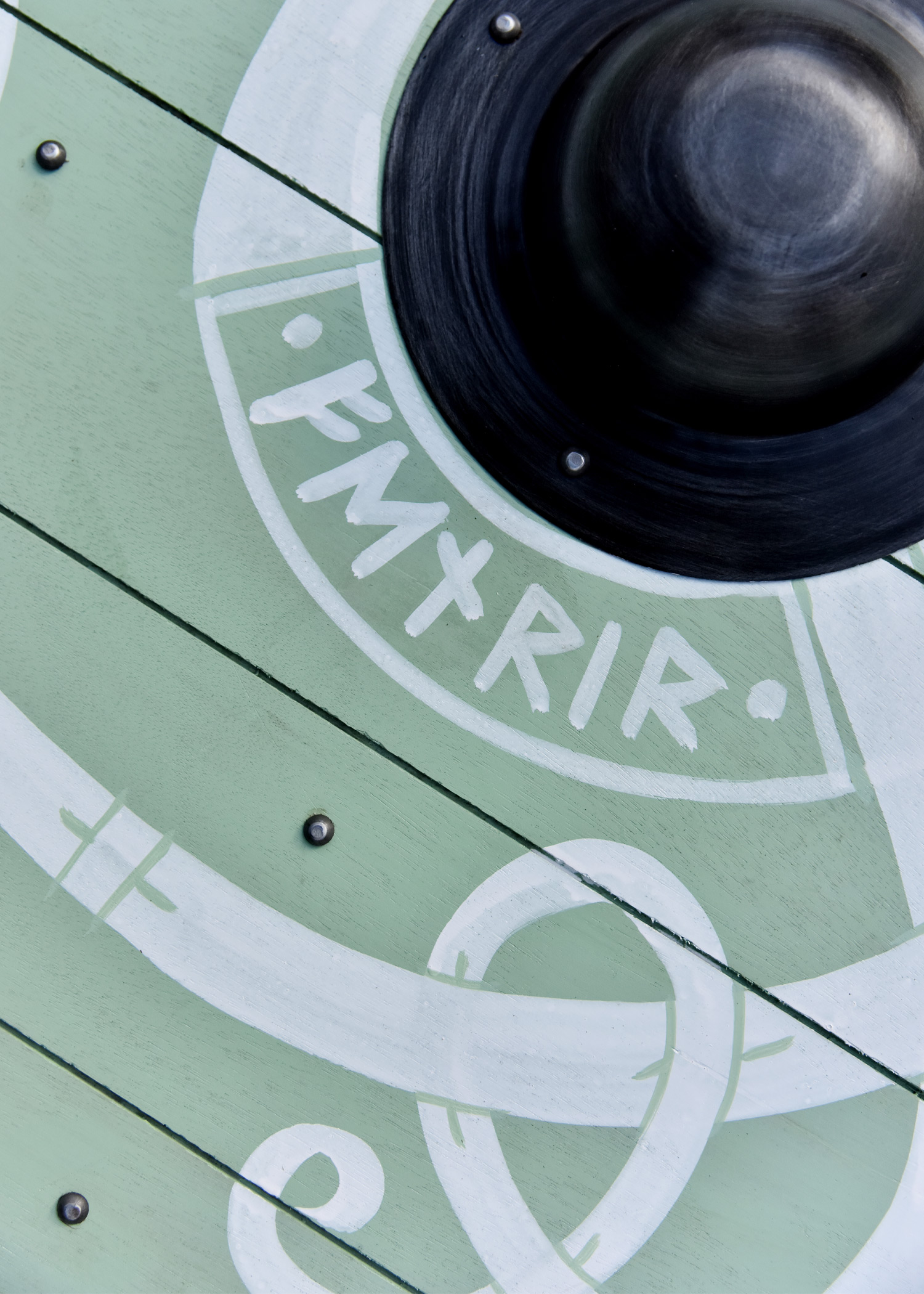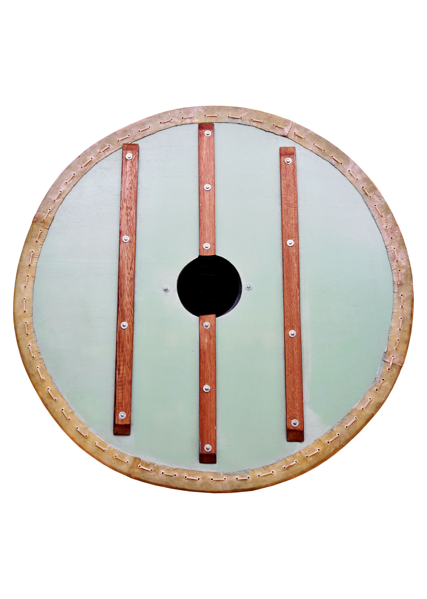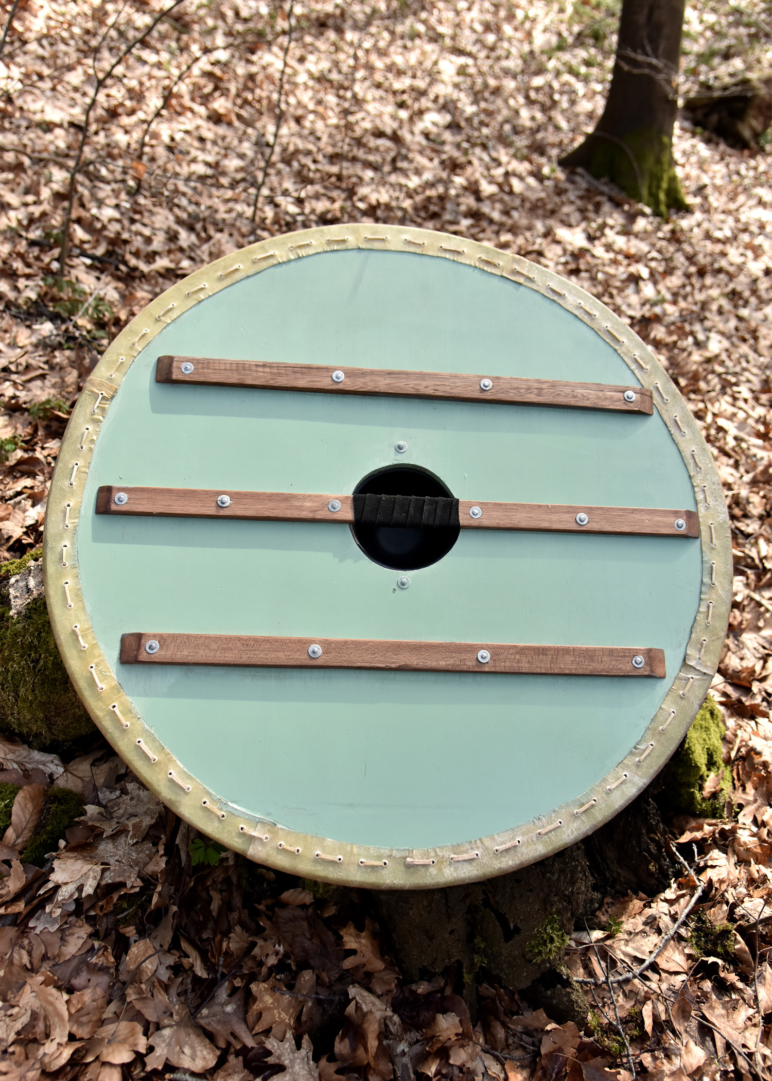 In der Mitte des Schildes ist ein großzügig ausgelegter Stahlbuckel angebracht, welcher mit vier Nieten fest in Position fixiert ist, und selbst für kräftige Wikingerhände genügend Platz bietet. Der Schildrand ist mit Rohhaut (Pergament) verkleidet, und die Rückseite des Schildes ist mit drei vernieteten Verstärkungsleisten aus Holz ausgestattet. Die mittlere Leiste dient zudem als Faustgriff und ist für einen bequemen Halt auf Höhe des Schildloches mit Leder umwickelt.