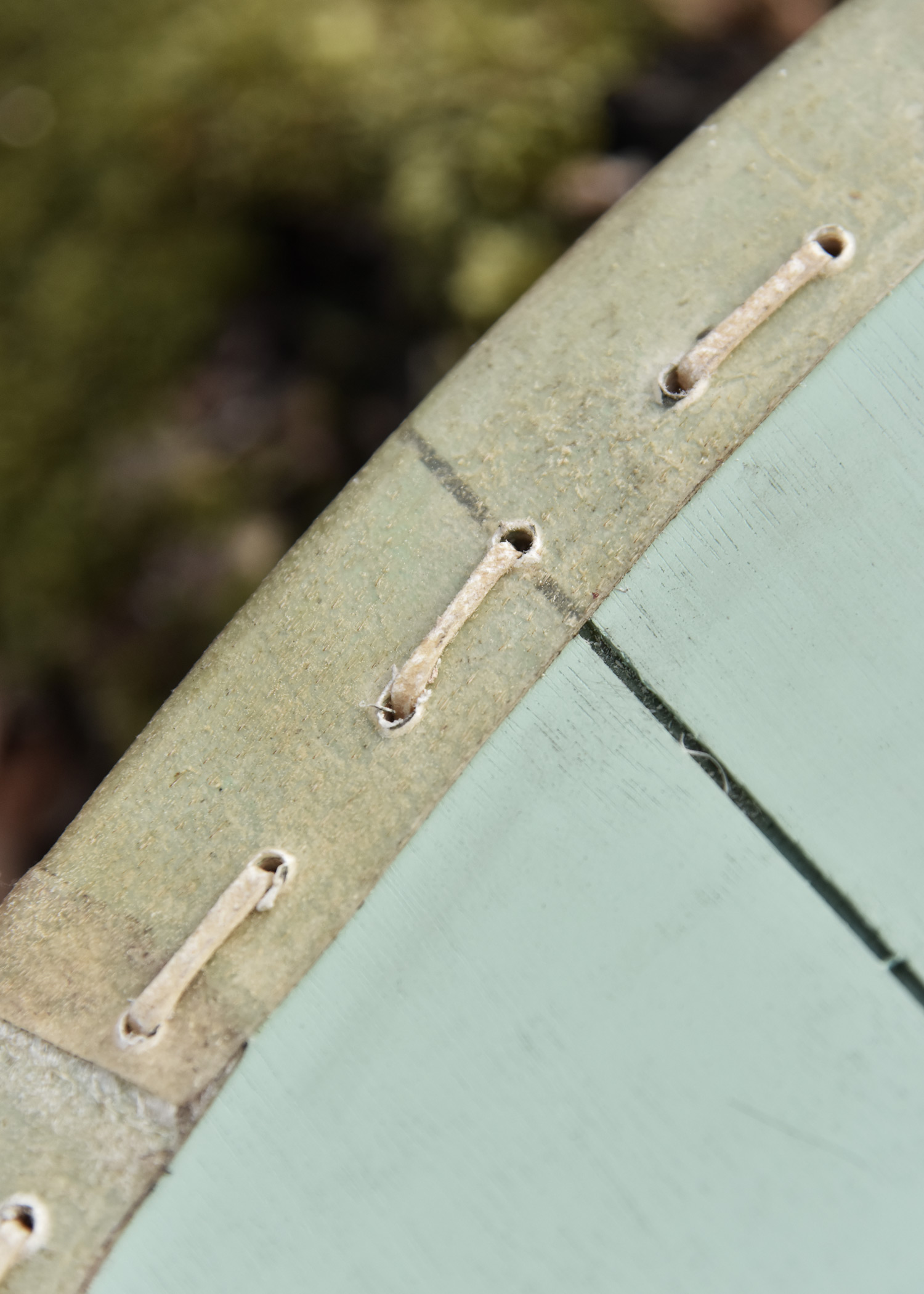 - Material: Sperrholz, Griff aus Massivholz mit Lederwicklung, Umrandung aus Rohleder (Rohhaut), Stahlbuckel