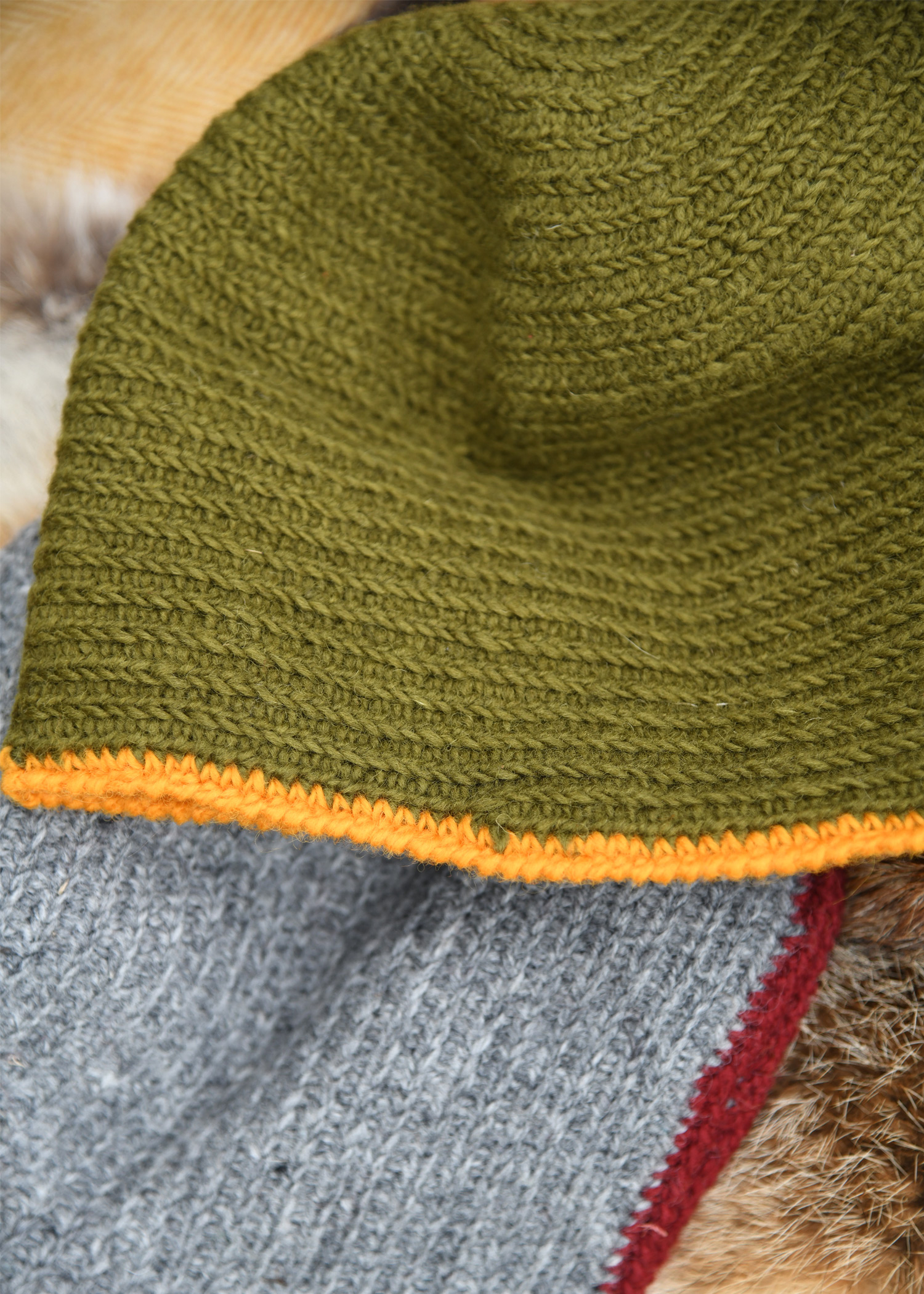 Mit dieser schönen grün-gelben Wollmütze bist du auf dem nächsten Mittelaltermarkt, LARP- oder Reenactment-Event optimal gegen die Kälte geschützt.
