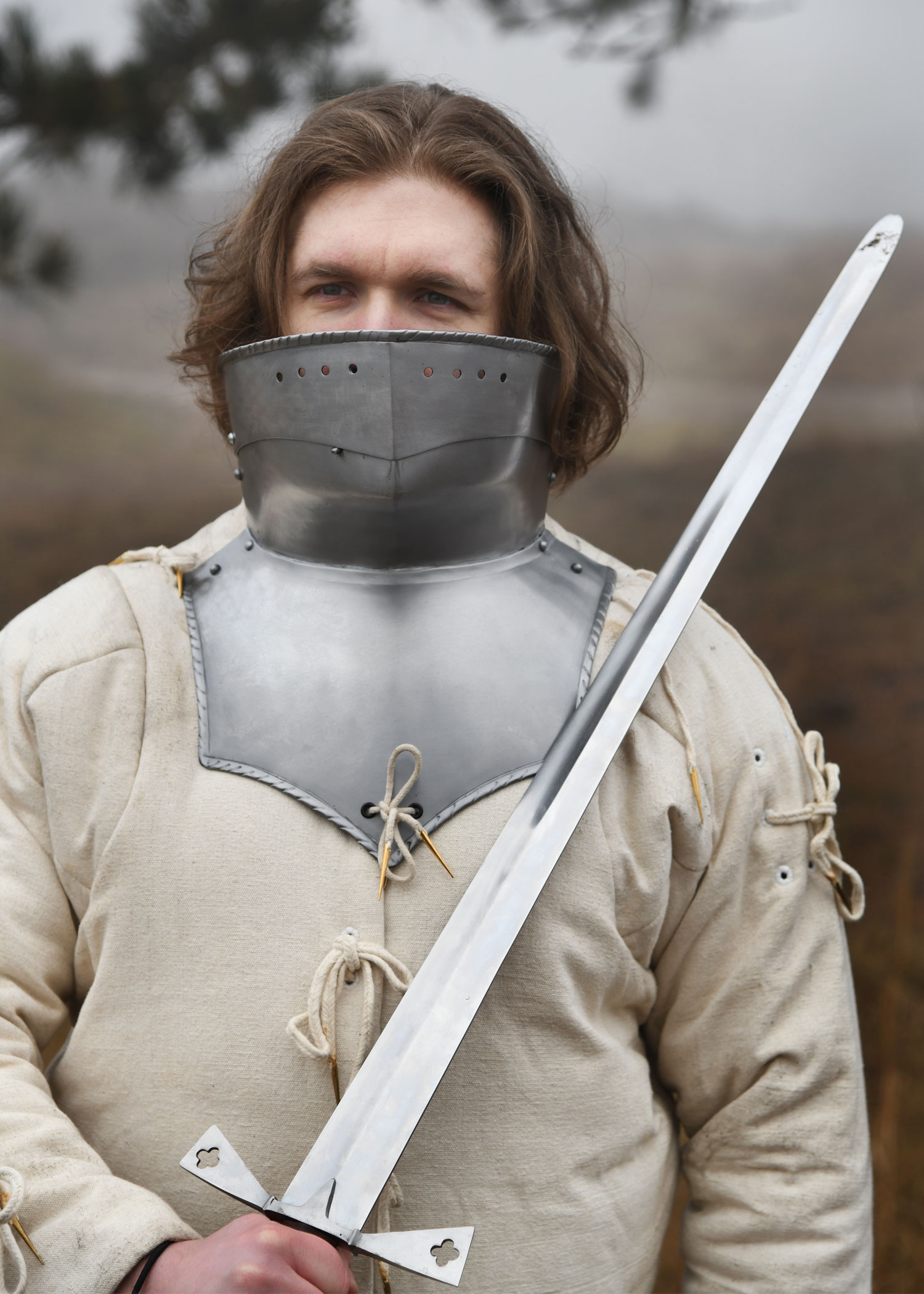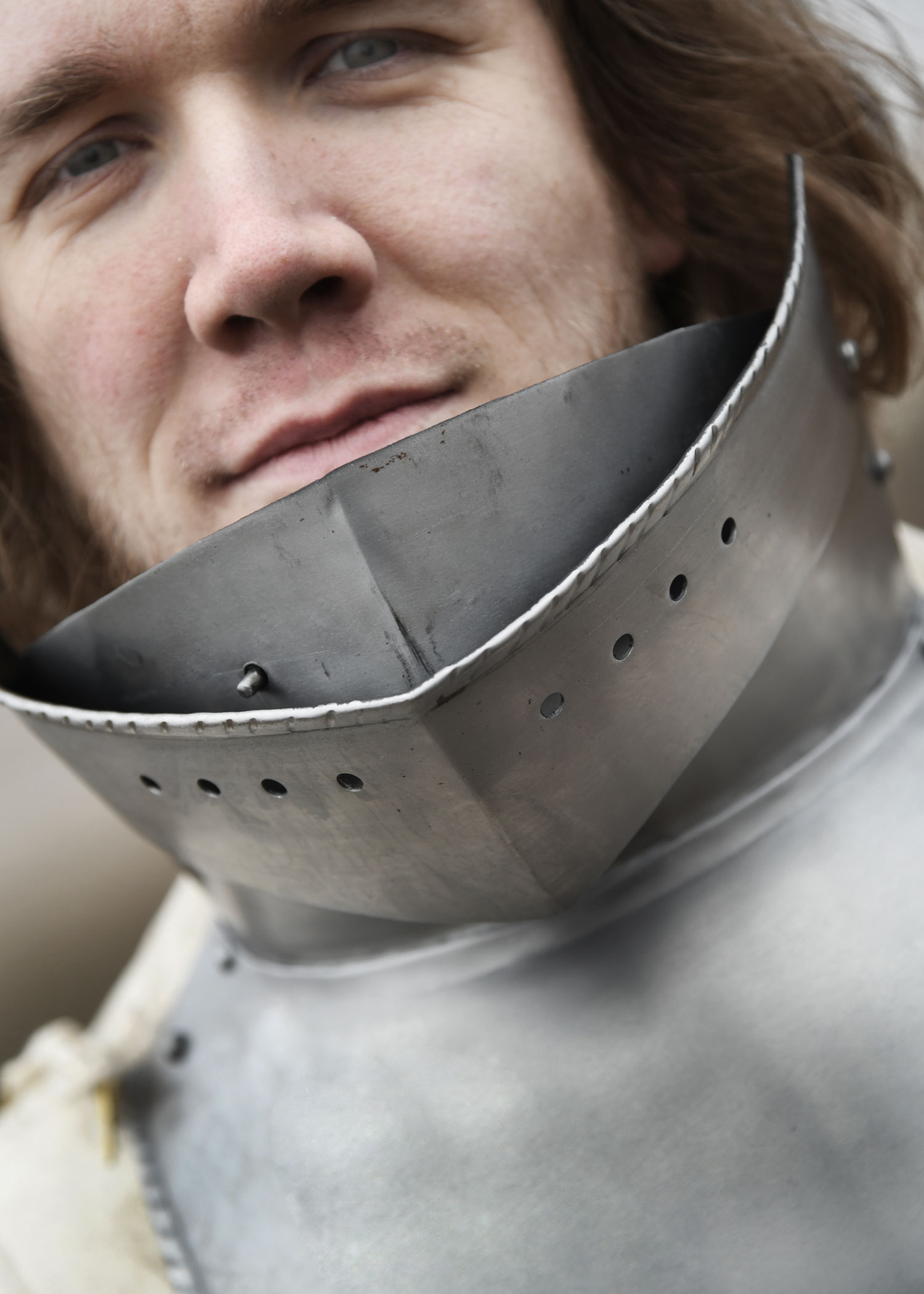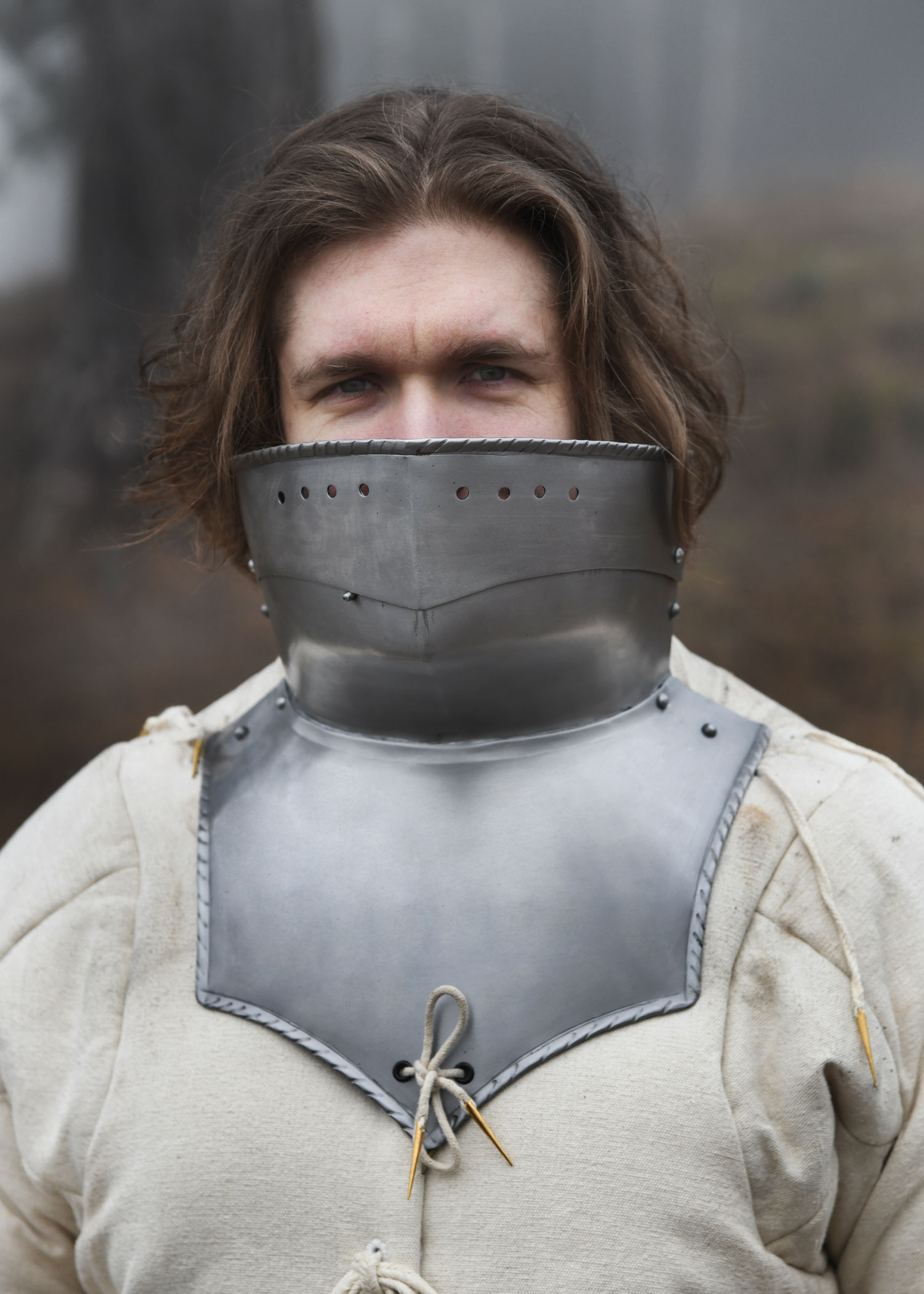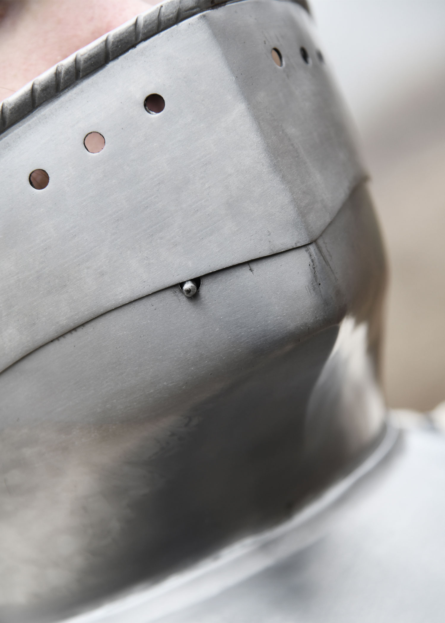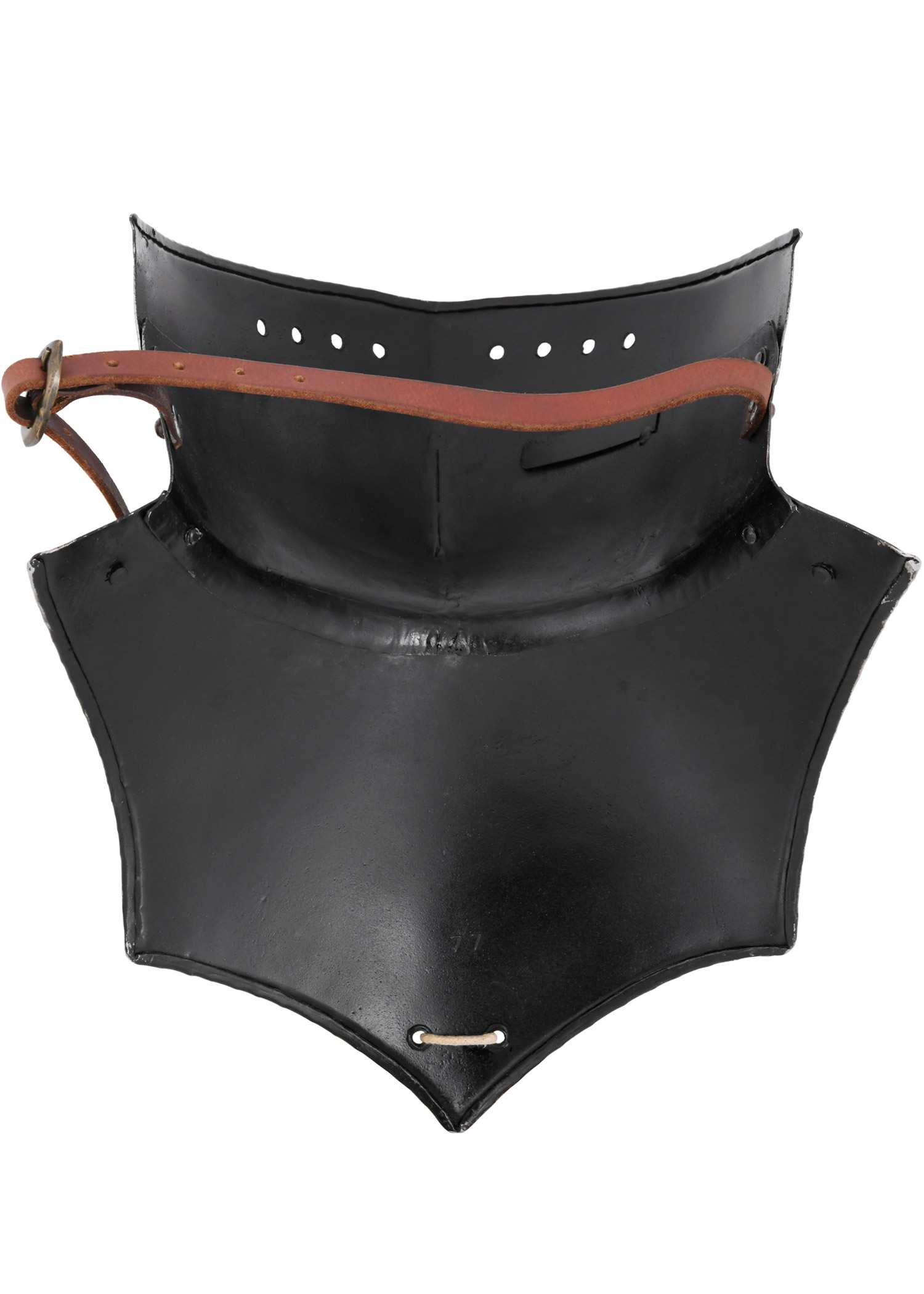Diese tragbare Nachbildung einer spätmittelalterlichen Halsberge ist aus 1,2 mm Stahl gefertigt und innenseitig zum besseren Schutz vor Korrosion geschwärzt. Die Halsberge, auch Bart oder Kinnreff genannt, weist die für gotische Plattenrüstungen des 15. und 16. Jahrhunderts typische mehrteilige Konstruktion auf. Während Hals- und Kinnschutz fest miteinander vernietet sind, ist die obere Platte über Nieten beweglich befestig und kann hoch- und runtergeklappt werden. In hochgeklappter Position reicht sie bis unter die Augen und bietet so zusätzlichen Schutz für das Gesicht. Ein kleiner, einschiebbarer Stift an der rechten Seite vom Kinnstück fixiert die bewegliche Platte zuverlässig in dieser Position. Die Halsberge ist an der Oberkante verstärkt und mit einer Reihe von runden Aussparungen versehen, die für die nötige Luftzirkulation sorgen. Die Kanten sind umlaufen gebördelt und mit feinen Zierrillen versehen. Mithilfe des an der Unterkante angebrachten Nestelbandes kann die Halsberge einfach am oder Plattenpanzer fixiert werden.