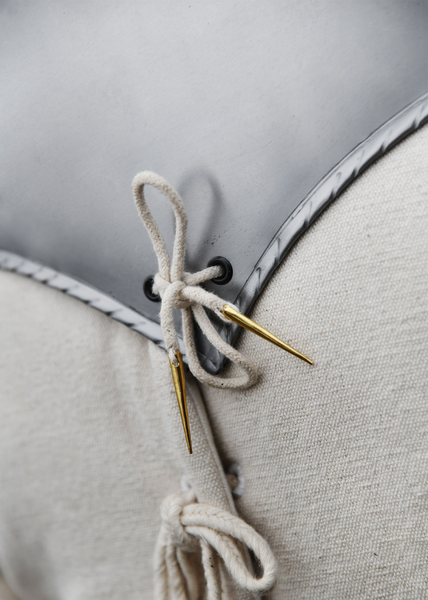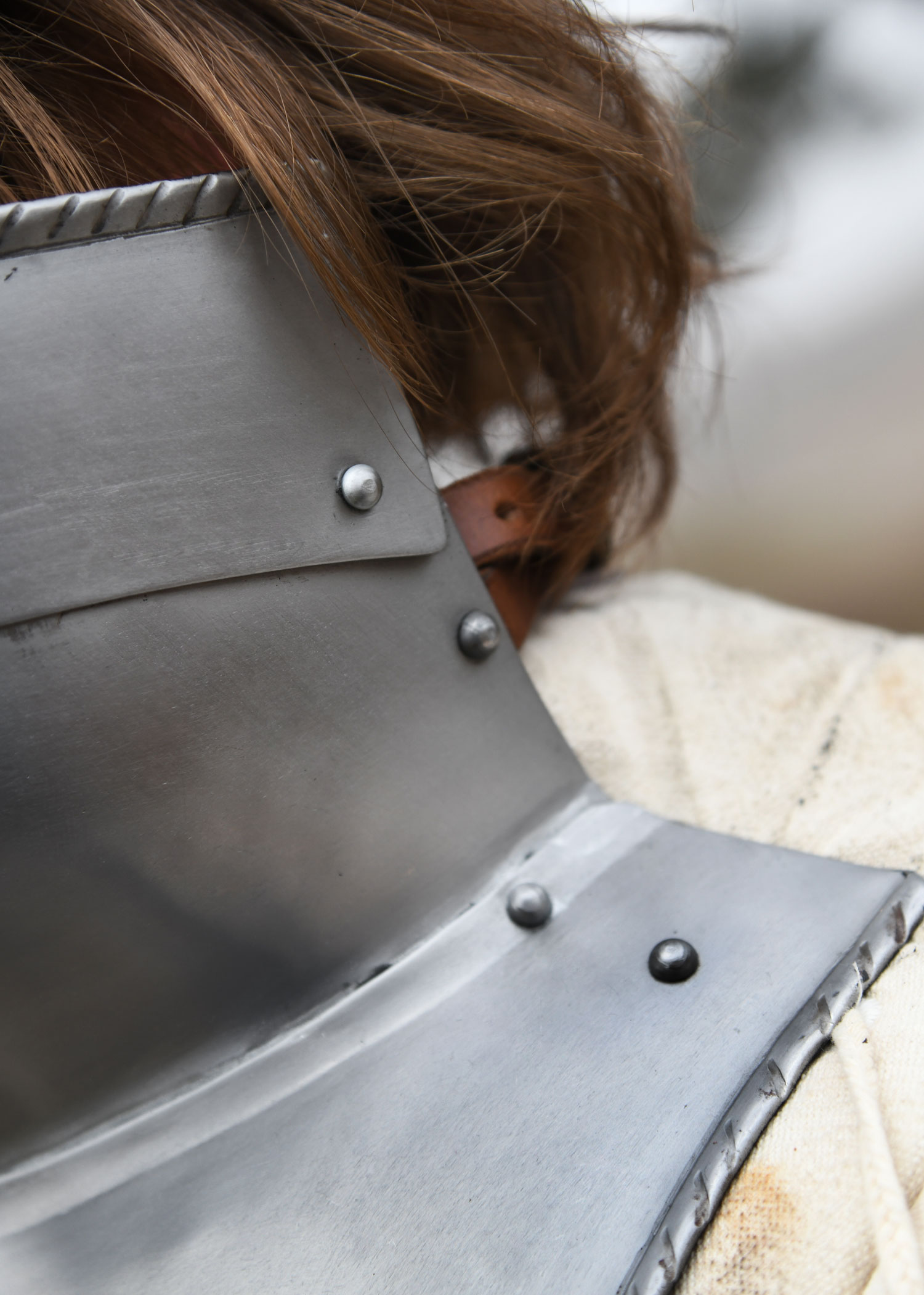 Die Halsberge ist hinten offen und besitzt keinen Nackenschirm. Sie wird mittels eines robusten, angenieteten Lederriemens samt Messingschnalle geschlossen. Der Riemen ist verstellbar und erlaubt so eine individuelle Anpassung der Kragenweite für optimalen Tragekomfort.