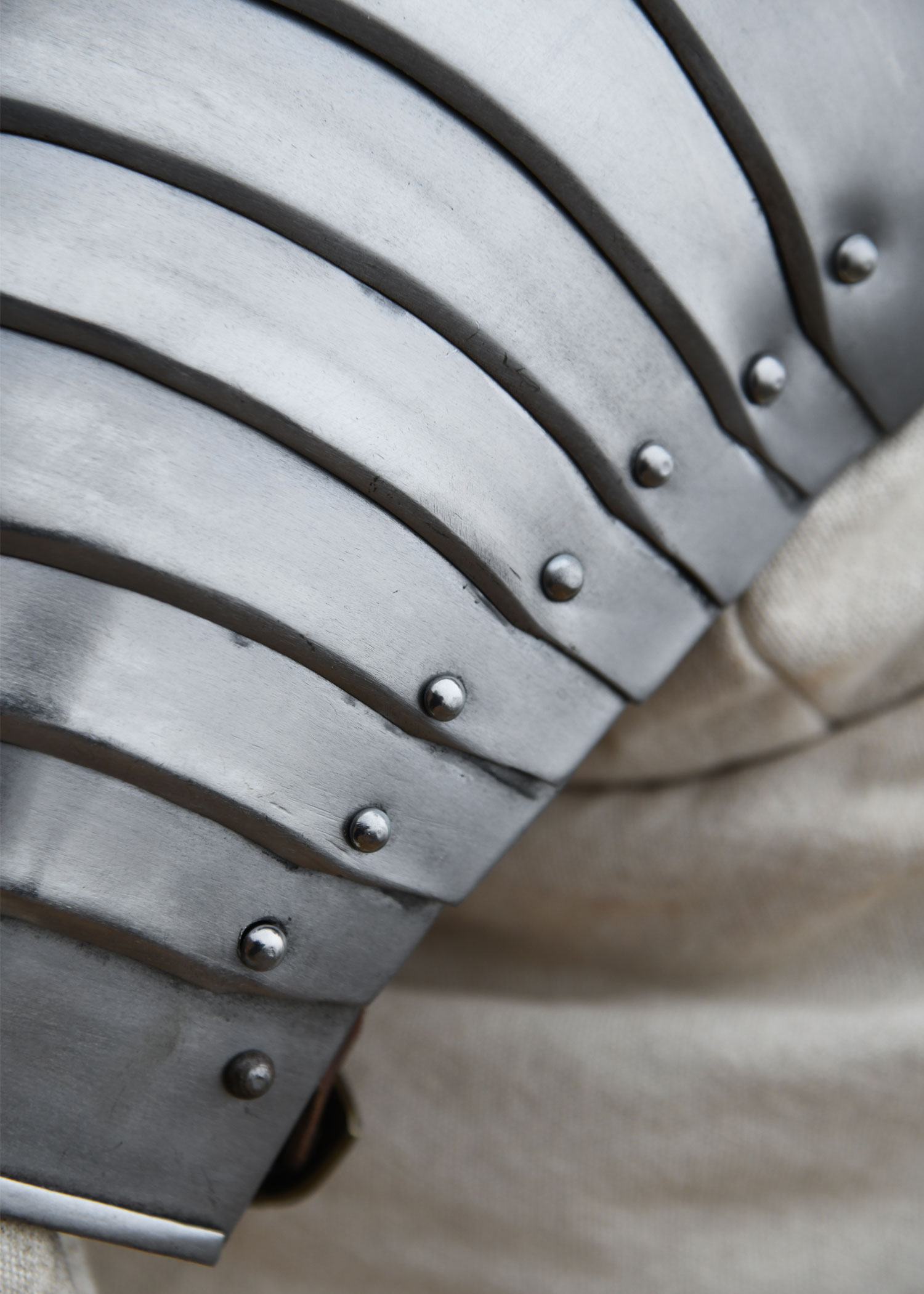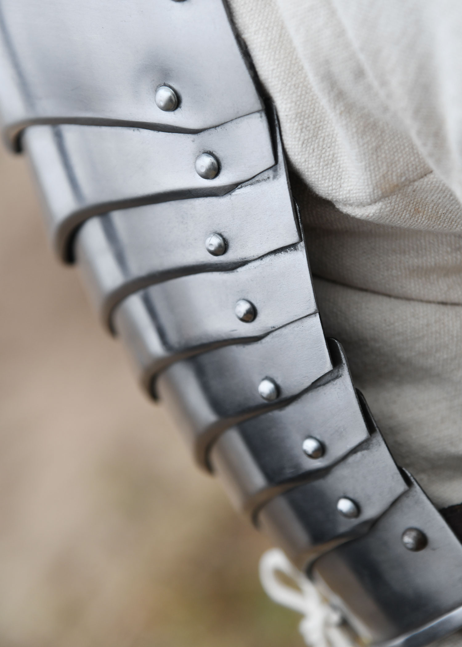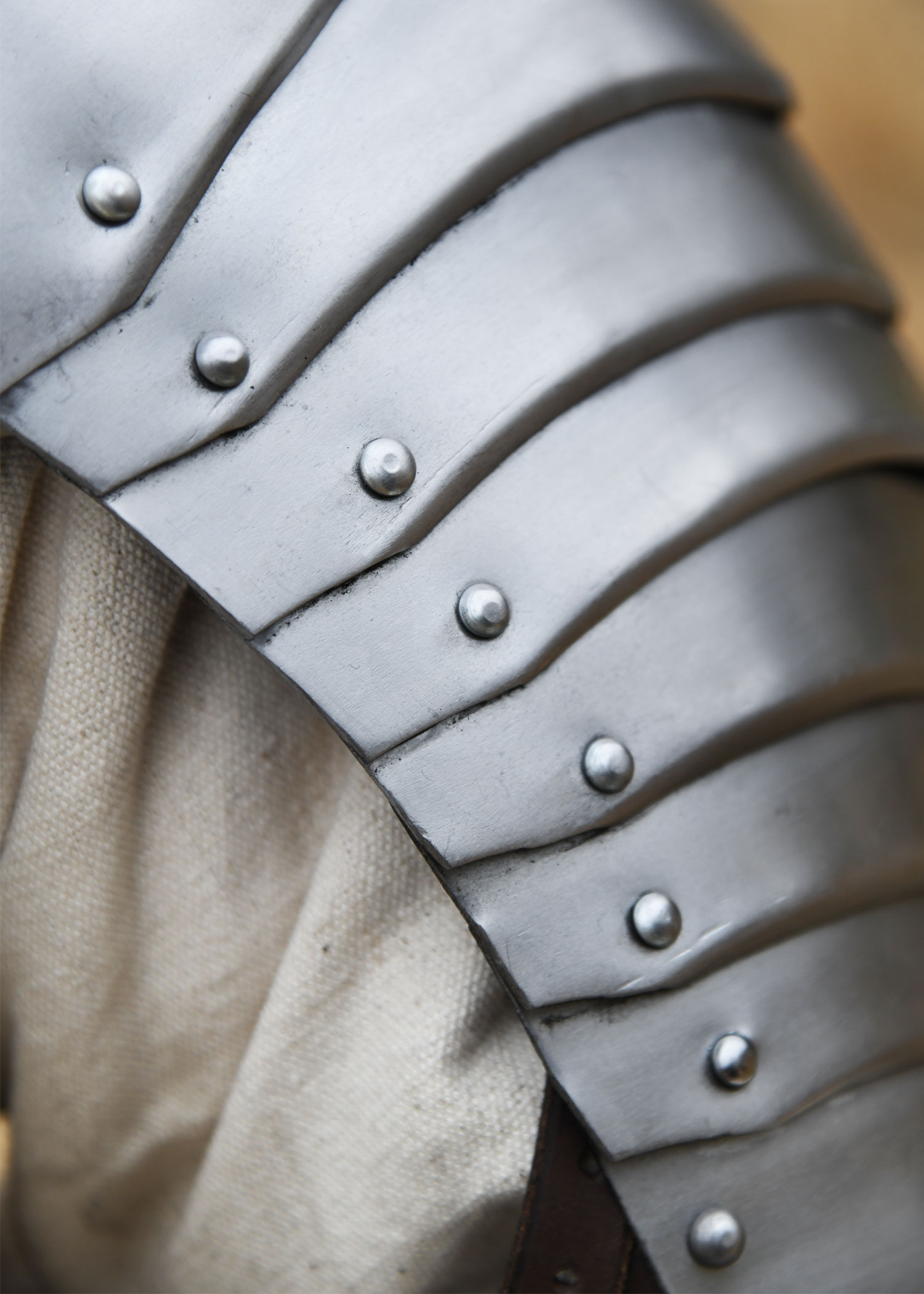 Diese tragbare Nachbildung einer spätmittelalterlichen für die Schultern ist aus 1,2 mm Stahl gefertigt und innenseitig zum besseren Schutz vor Korrosion geschwärzt. Die Achseln weisen die für gotische Rüstungen des 15. und 16. Jahrhunderts typische mehrteilige Konstruktion auf. Sie bestehen aus insgesamt 11 Segmenten – einer großen Hauptplatte für die Schulter, drei oberen und sieben unteren Geschüben, die durch stabile Stahlnieten beweglich miteinander verbunden sind. Für optimalen Tragekomfort ist jede Schulterplatte mit einem verstellbaren Lederriemen samt Messingschnalle ausgestattet, der eine individuelle Größenanpassung am Oberarm ermöglicht. Zusätzlich befinden sich am oberen und unteren Rand Nestelbänder, mit denen die Plattenrüstung an anderen Rüstungsteilen wie Ringkragen, Halsberge, Brustpanzer oder befestigt werden kann.