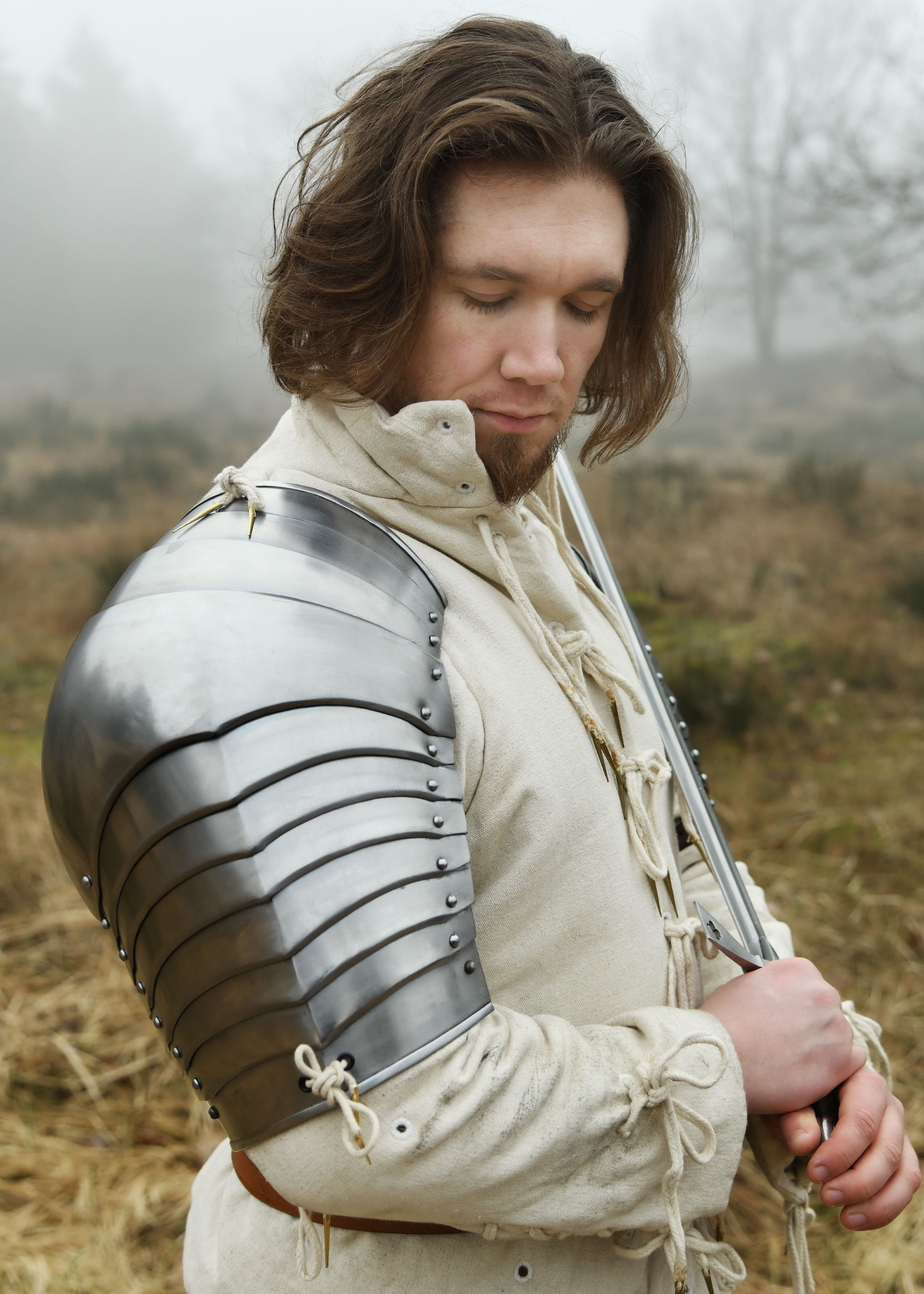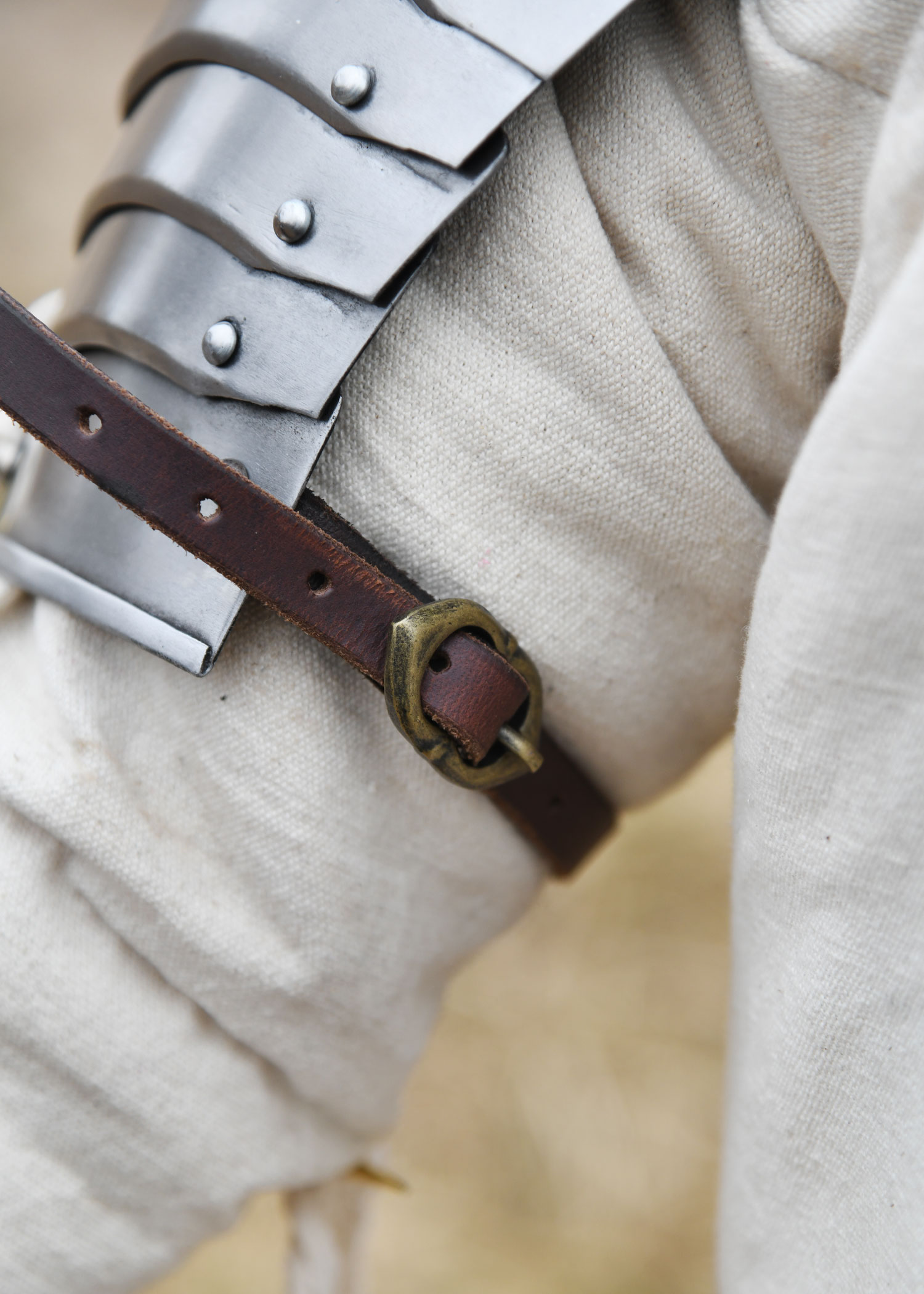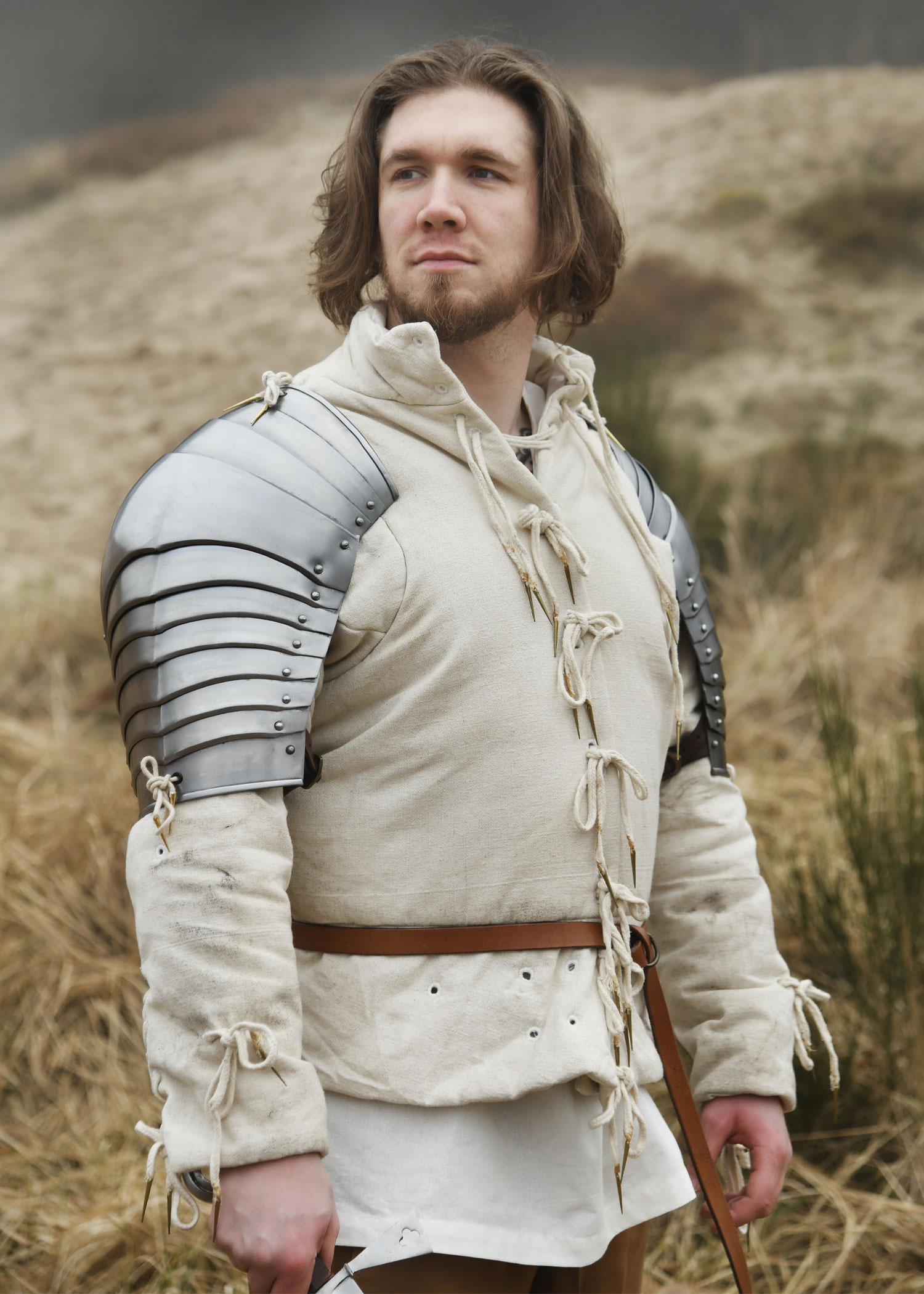 Diese tragbare Nachbildung einer spätmittelalterlichen für die Schultern ist aus 1,2 mm Stahl gefertigt und innenseitig zum besseren Schutz vor Korrosion geschwärzt. Die Achseln weisen die für gotische Rüstungen des 15. und 16. Jahrhunderts typische mehrteilige Konstruktion auf. Sie bestehen aus insgesamt 11 Segmenten – einer großen Hauptplatte für die Schulter, drei oberen und sieben unteren Geschüben, die durch stabile Stahlnieten beweglich miteinander verbunden sind. Für optimalen Tragekomfort ist jede Schulterplatte mit einem verstellbaren Lederriemen samt Messingschnalle ausgestattet, der eine individuelle Größenanpassung am Oberarm ermöglicht. Zusätzlich befinden sich am oberen und unteren Rand Nestelbänder, mit denen die Plattenrüstung an anderen Rüstungsteilen wie Ringkragen, Halsberge, Brustpanzer oder befestigt werden kann.